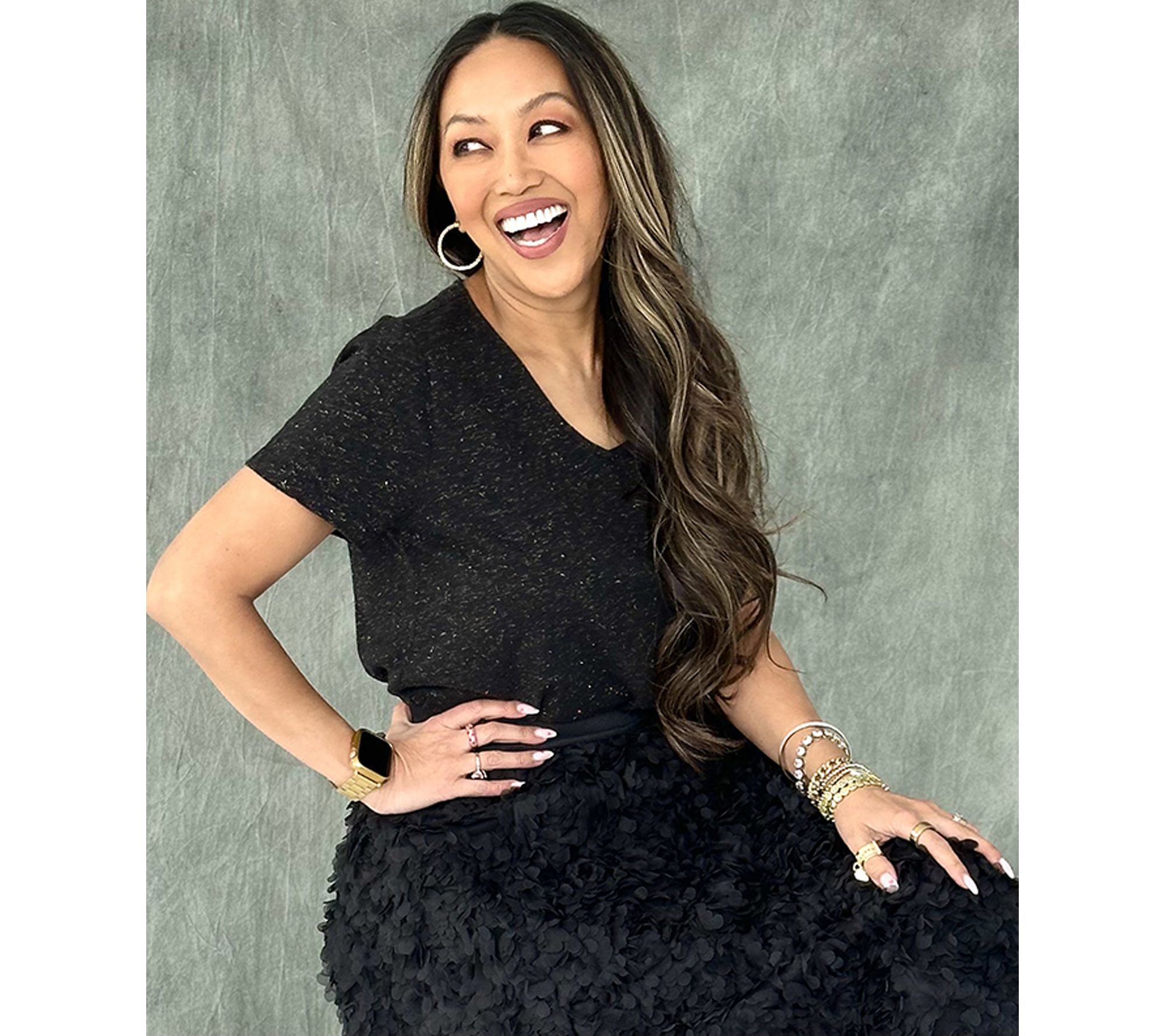 A simple tee can carry you from coffee runs to cozy evenings in, and this short-sleeve V-neckline top rises to any occasion. The airy cotton blend boasts a hint of glimmer making it the perfect piece for a night out with the addition a statement necklace. During the day, make it a layered look with your favorite cardigan or a tailored blazer. From Mally Roncal.