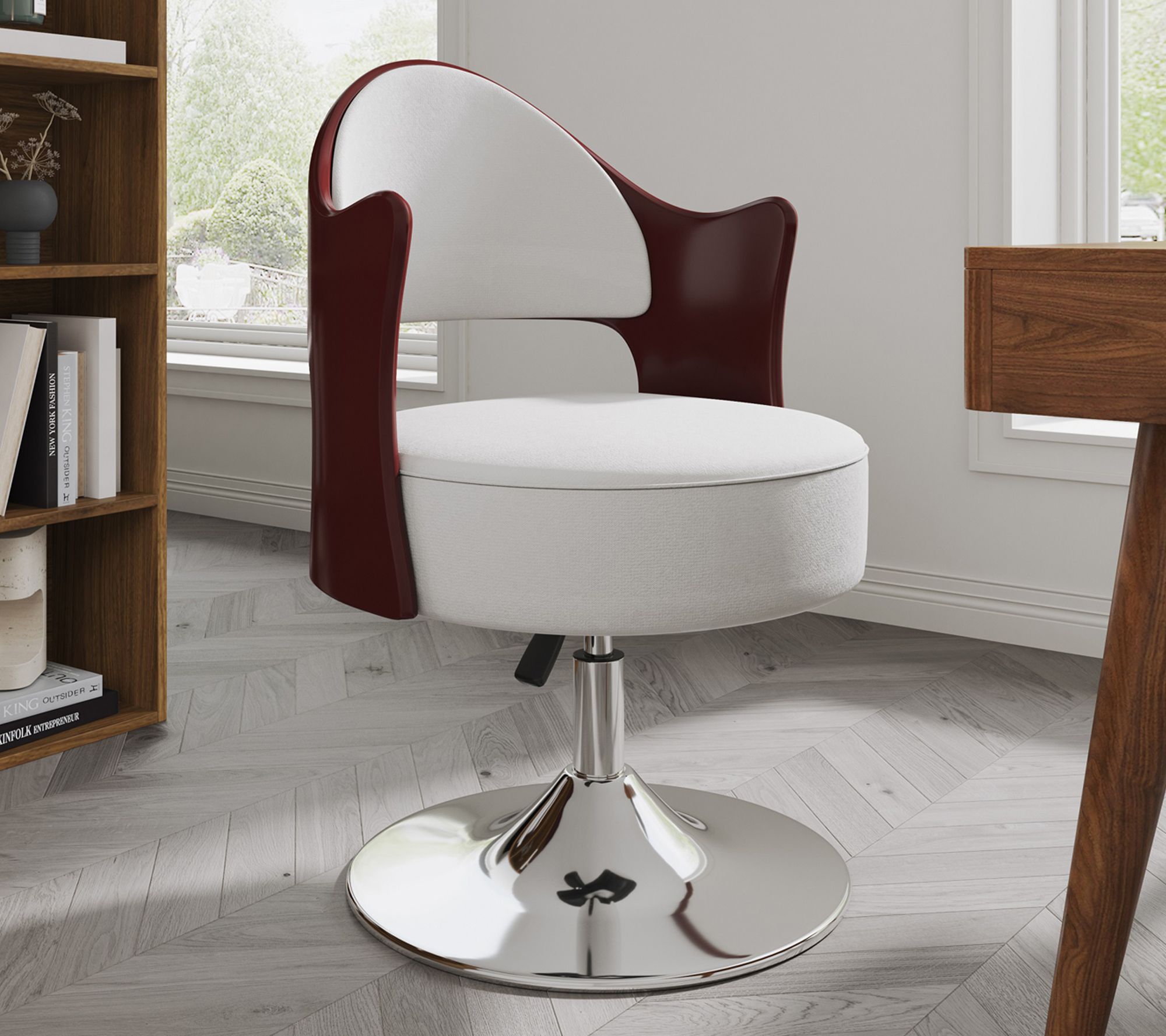Whether you're upgrading your home office or elevating a cozy reading nook, this set of two Bopper swivel lounge chairs infuses your space with modern flair and everyday comfort. Adjustable height and smooth 360-degree rotation make relaxing or catching up with friends an effortless delight, while snowy white faux leather and a chic curved back with wood grain accent set a stylish scene. From Manhattan Comfort.