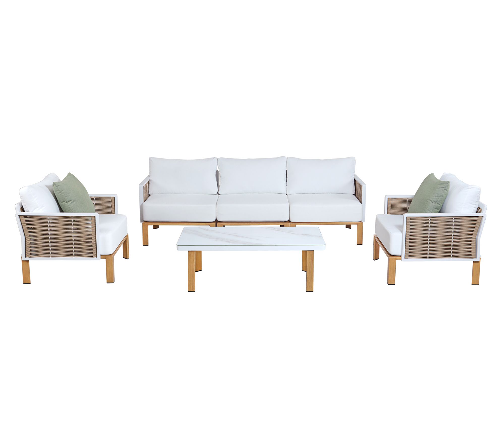 Create a cozy gathering spot for morning coffee or evening conversation with this four-piece patio conversation set. Featuring two armchairs, a love seat, and a marble-inspired coffee table, this group welcomes you to relax in style with water-resistant cushions and a sturdy rust-resistant steel frame. From Manhattan Comfort.