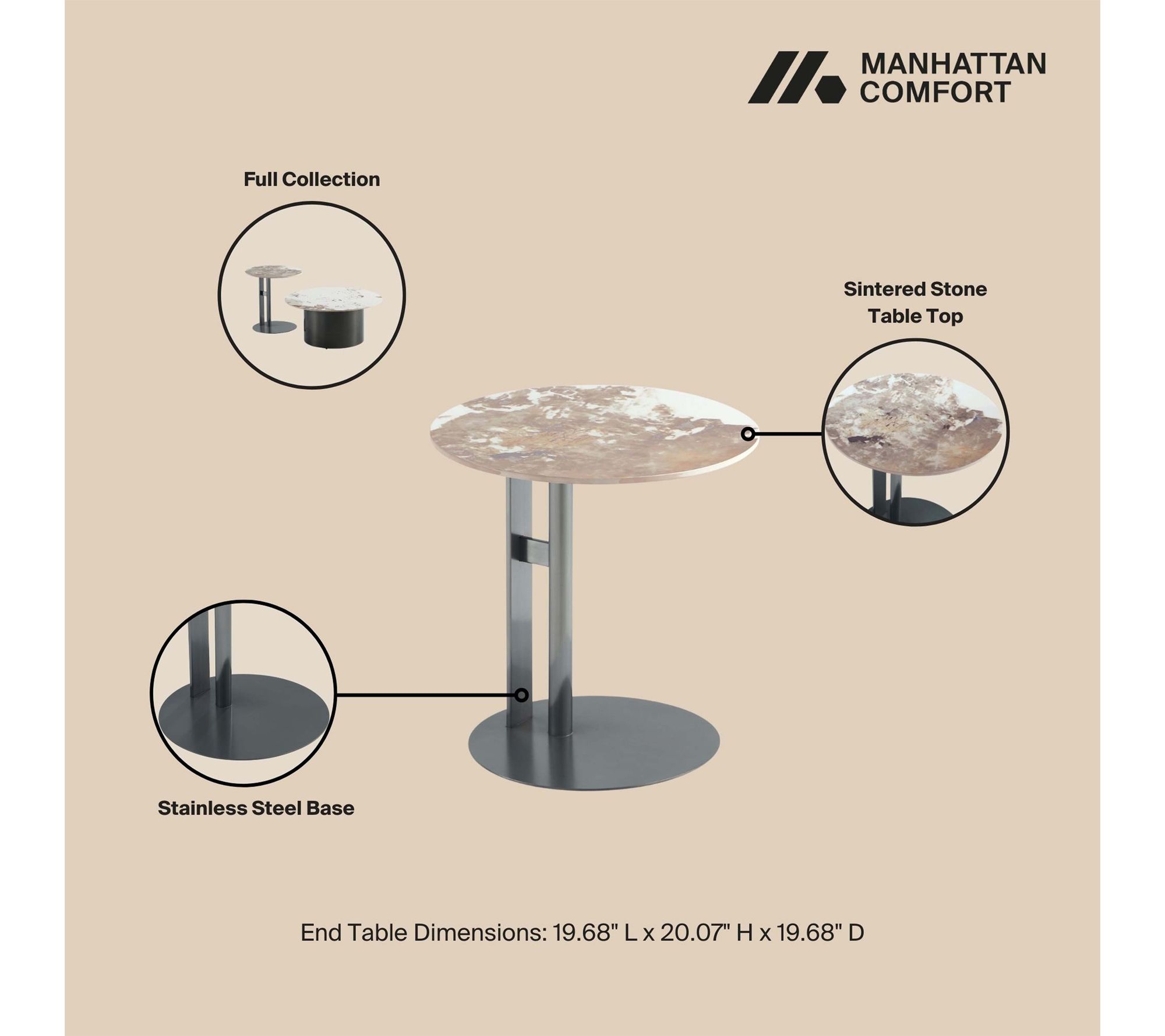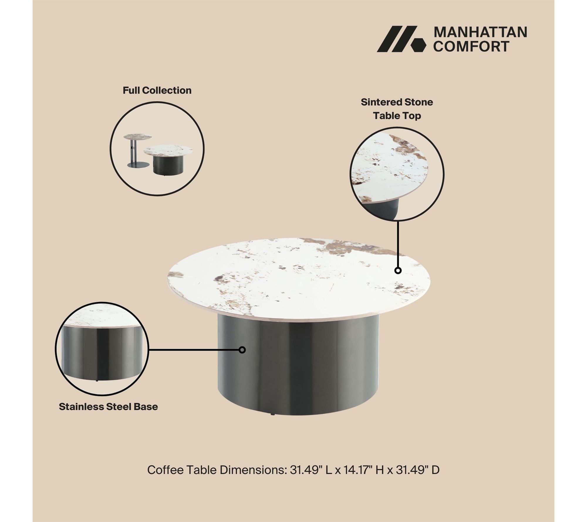 Create a sophisticated living space where modern design meets everyday function with this coffee table and end table set. Highlighted by lustrous sintered stone tops and sleek black stainless steel bases, the pairing brings an on-trend, layered look -- perfect for sharing snacks with friends or showcasing statement decor. From Manhattan Comfort.