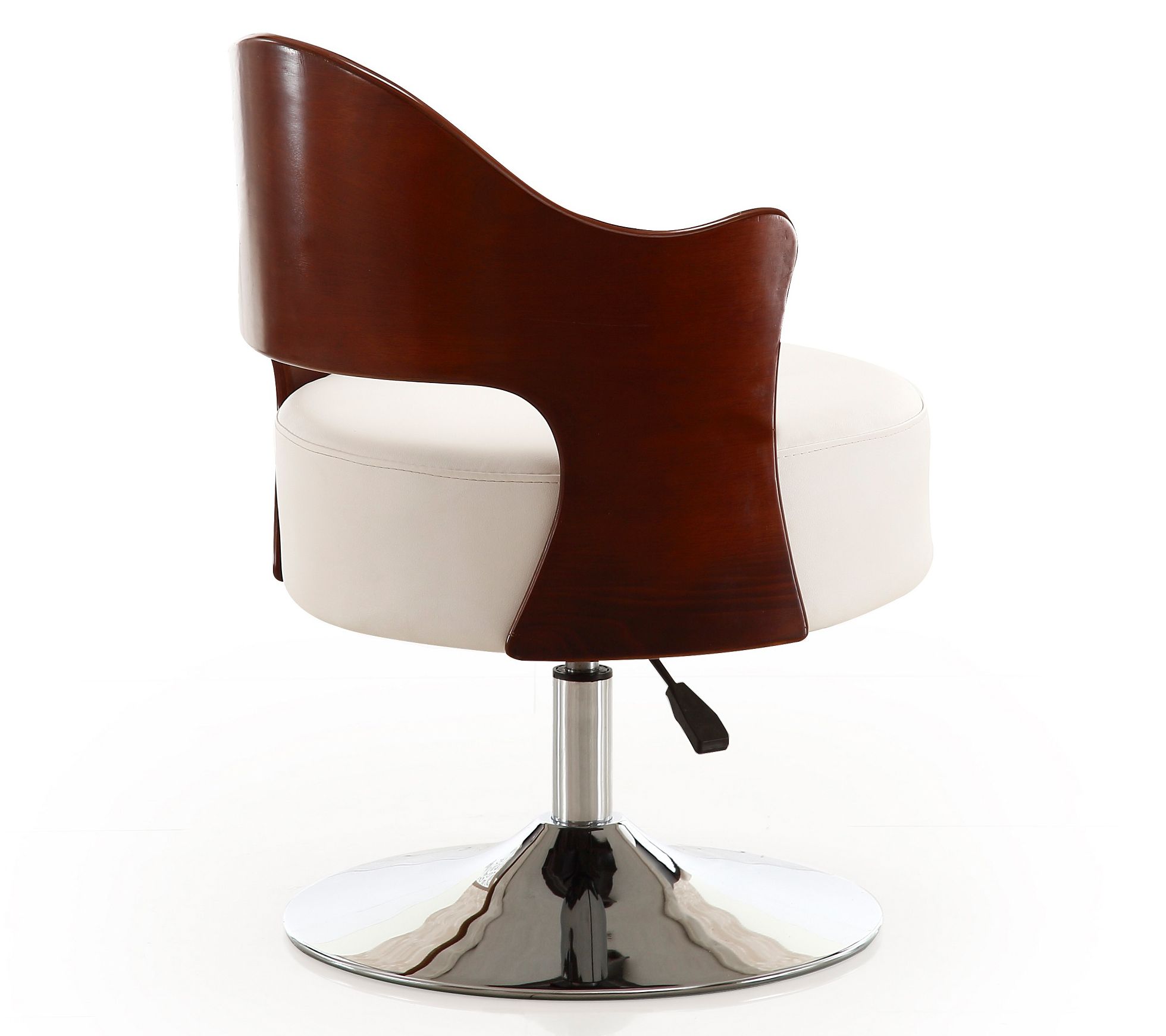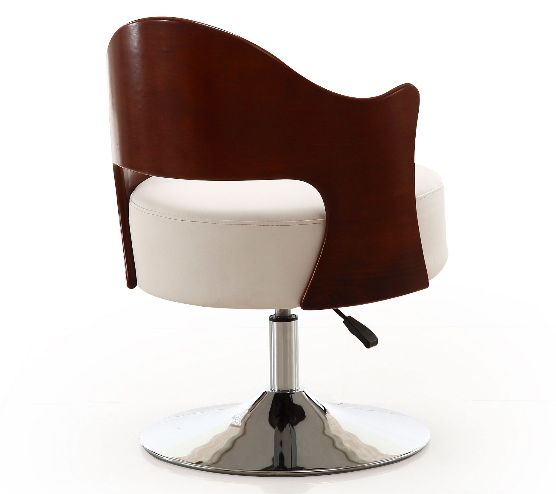 Chic and functional, this accent chair brings a contemporary vibe to any room. Its snowy white faux leather upholstery and polished chrome base create a modern aesthetic, while the 360-degree swivel and height adjustability enhance versatility. The curved shell-style back showcases a rich wood grain, adding warmth to your space. Ideal for living rooms or home offices, this chair combines style and practicality effortlessly. From Manhattan Comfort