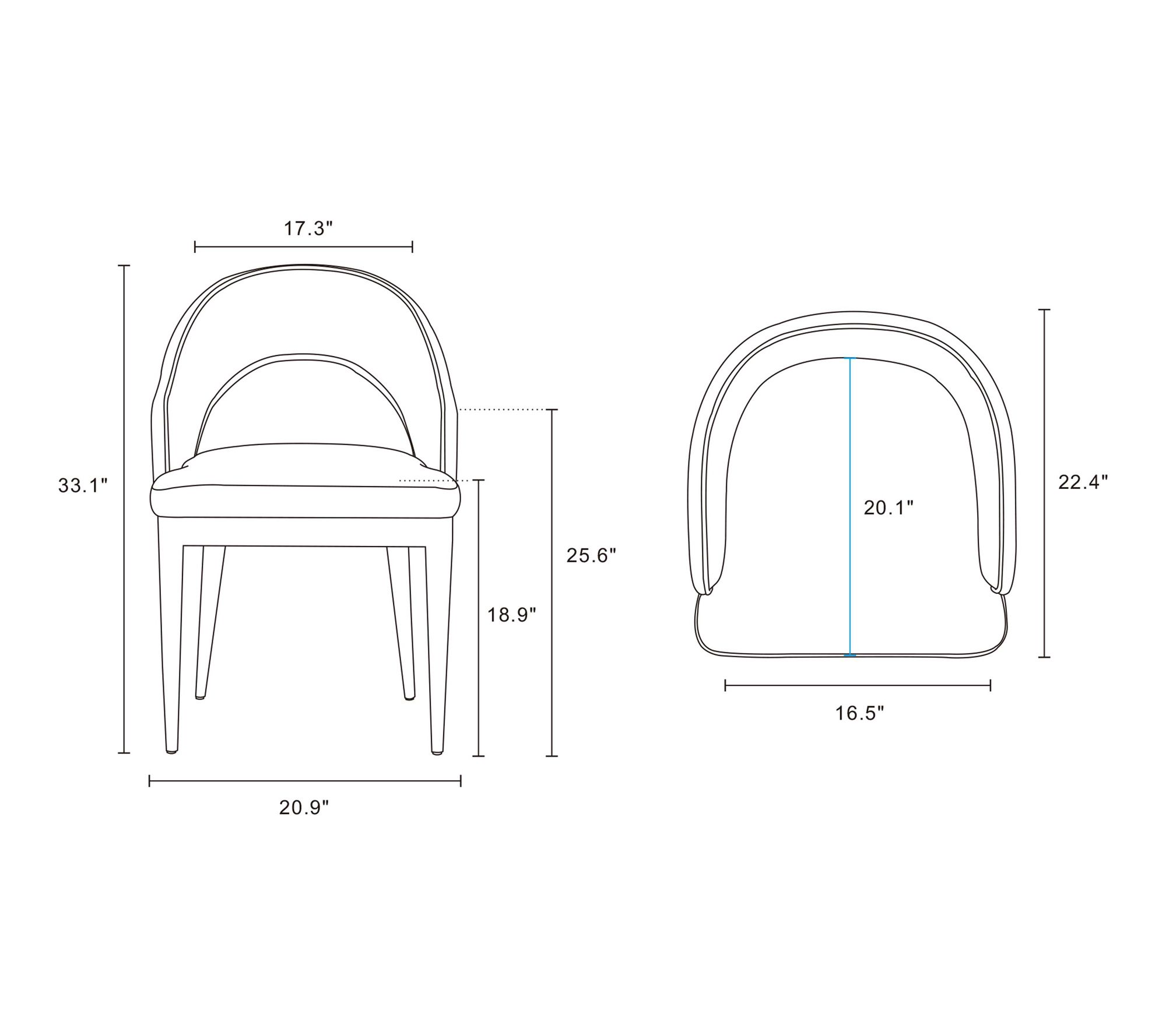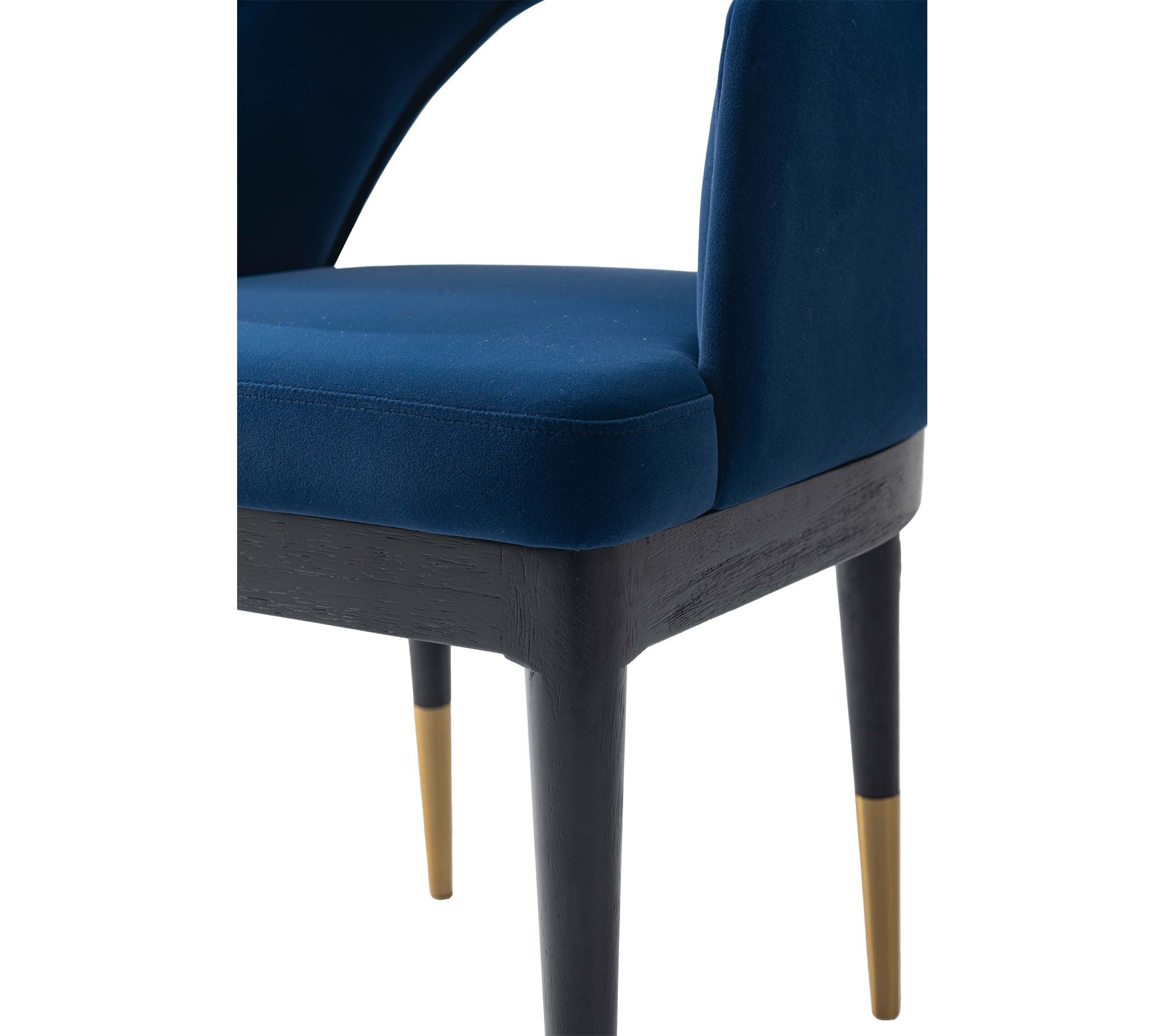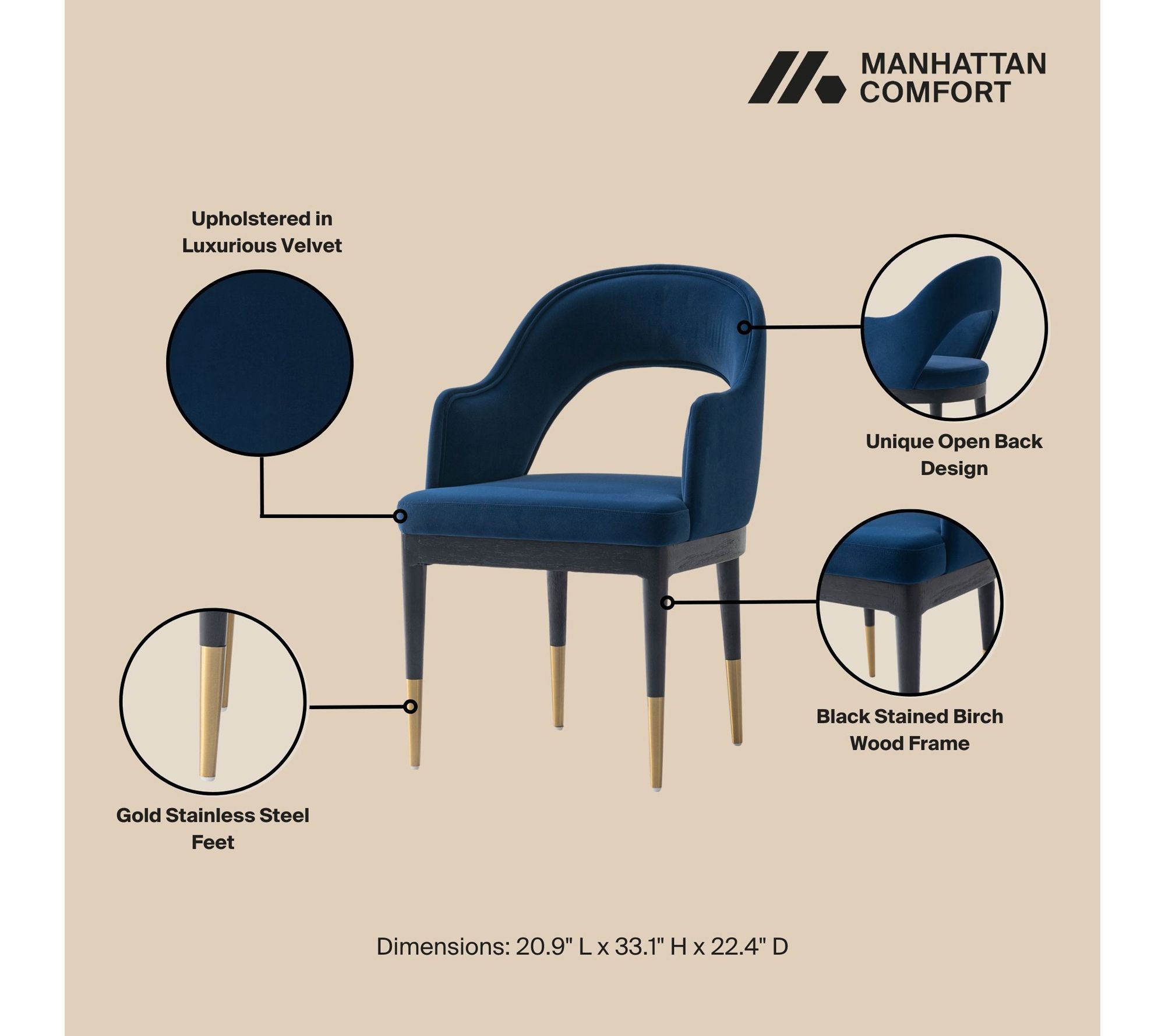 Experience elevated comfort and style with this set of upholstered armchairs, crafted for captivating gatherings or serene moments at home. Sleek kiln-dried birch wood legs with goldtone accents beautifully complement plush velvet and high-density foam, while the distinctive curved back supports relaxed seating and a modern touch. From Manhattan Comfort.