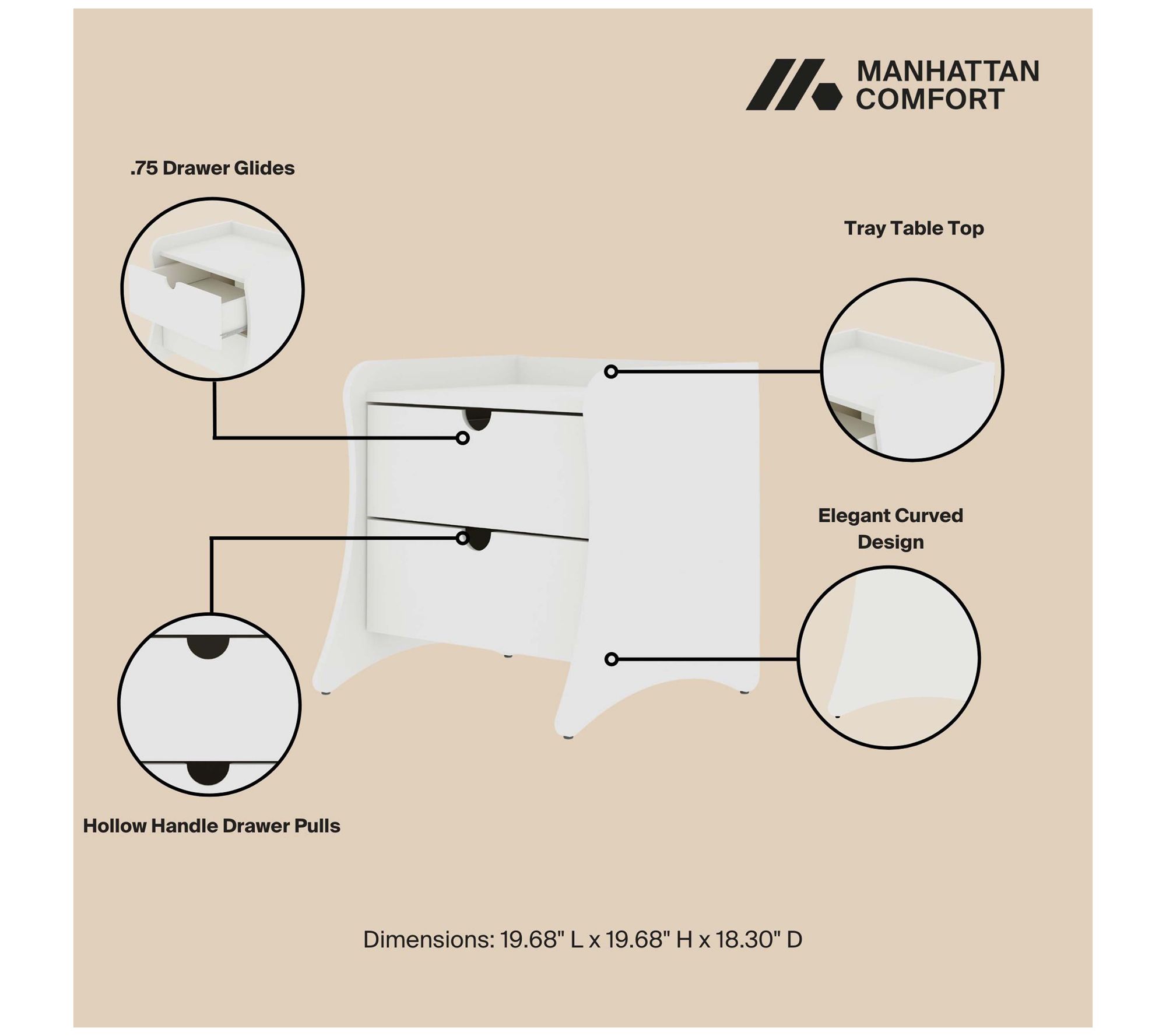 Sometimes all you need is a little extra space to keep your room feeling serene and organized. Stash your favorite book or nighttime essentials in the roomy drawers, while the gently curved legs and modern silhouette invite a touch of style beside your bed. Stack a few novels or perch a lamp on top for a relaxed, finished look. From Manhattan Comfort.