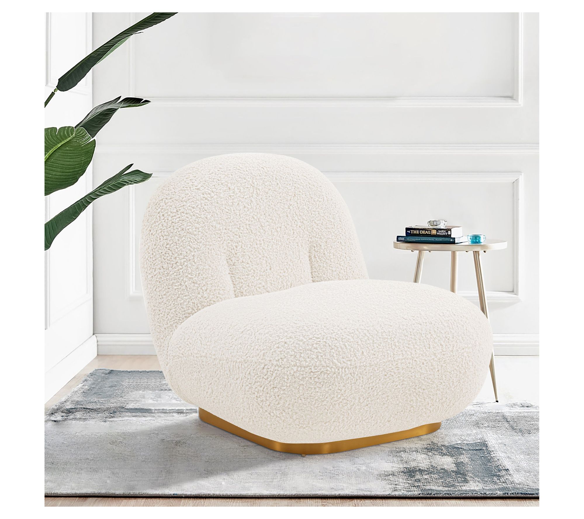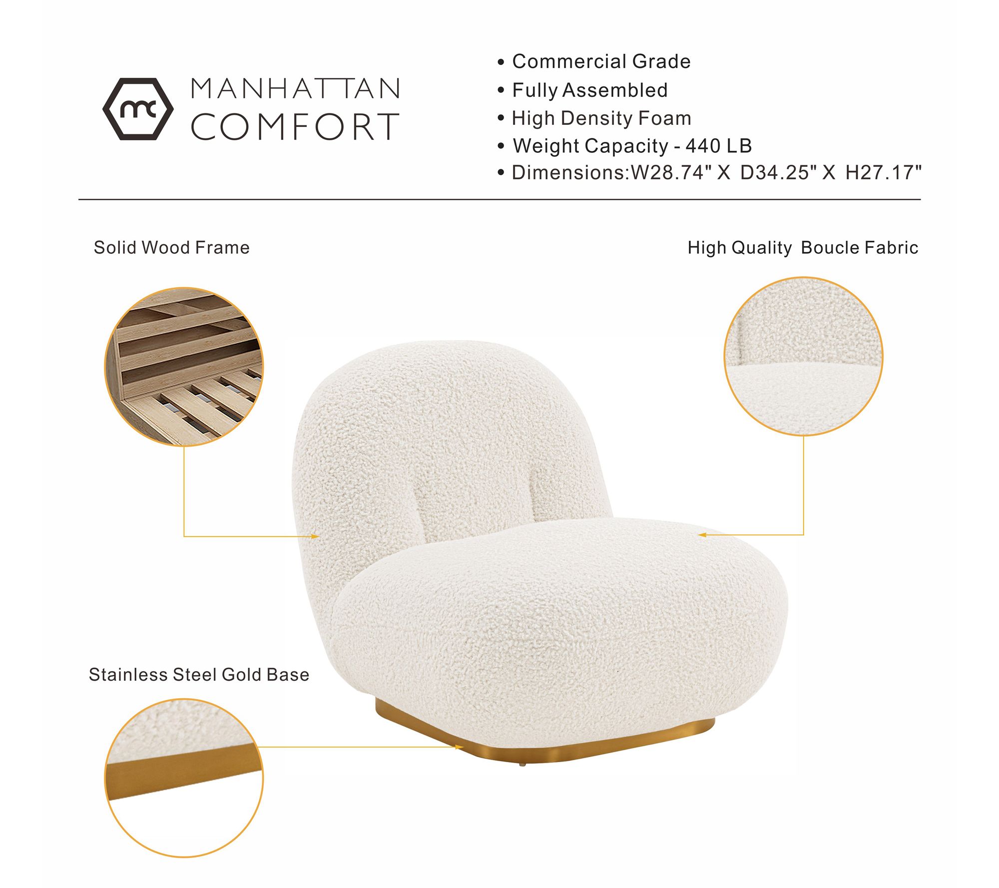 Imagine sinking into the plush comfort of this modern accent chair after a long day. With its luxurious boucle upholstery and high-density foam padding, it's like sitting on a cloud. The high-quality pine wood frame, complemented by a brushed goldtone metal base, adds a touch of elegance to your living room or bedroom. Best of all, it comes fully assembled, so you can enjoy it right out of the box. From Manhattan Comfort.