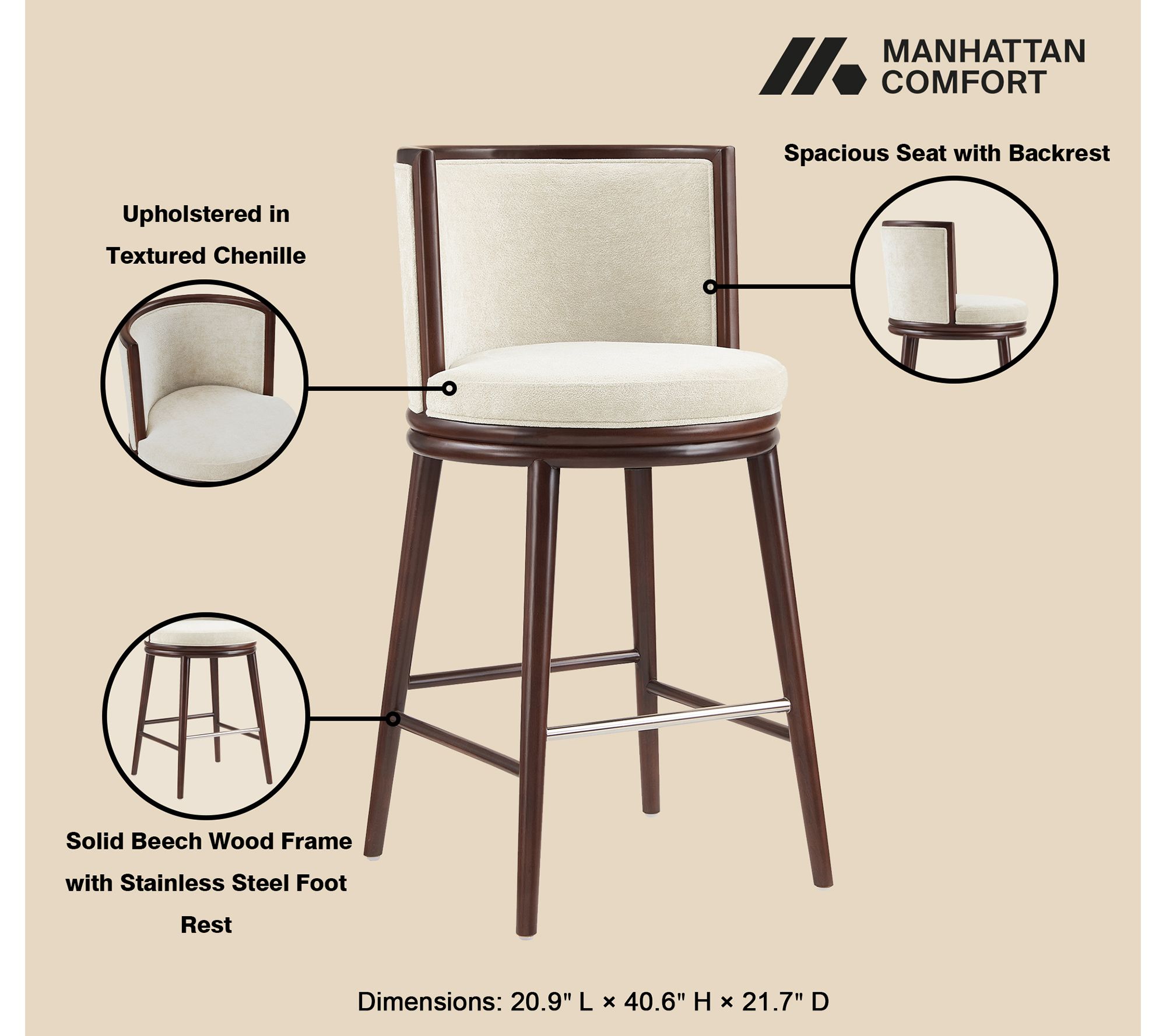 Gather around your kitchen island or home bar with this set of two Evalyn barstools, designed to encourage both conversation and relaxation. The plush, upholstered seat and supportive backrest invite you to linger, while the sturdy beech wood frame and shimmering metal footrest offer lasting comfort for everyday living or entertaining. From Manhattan Comfort.