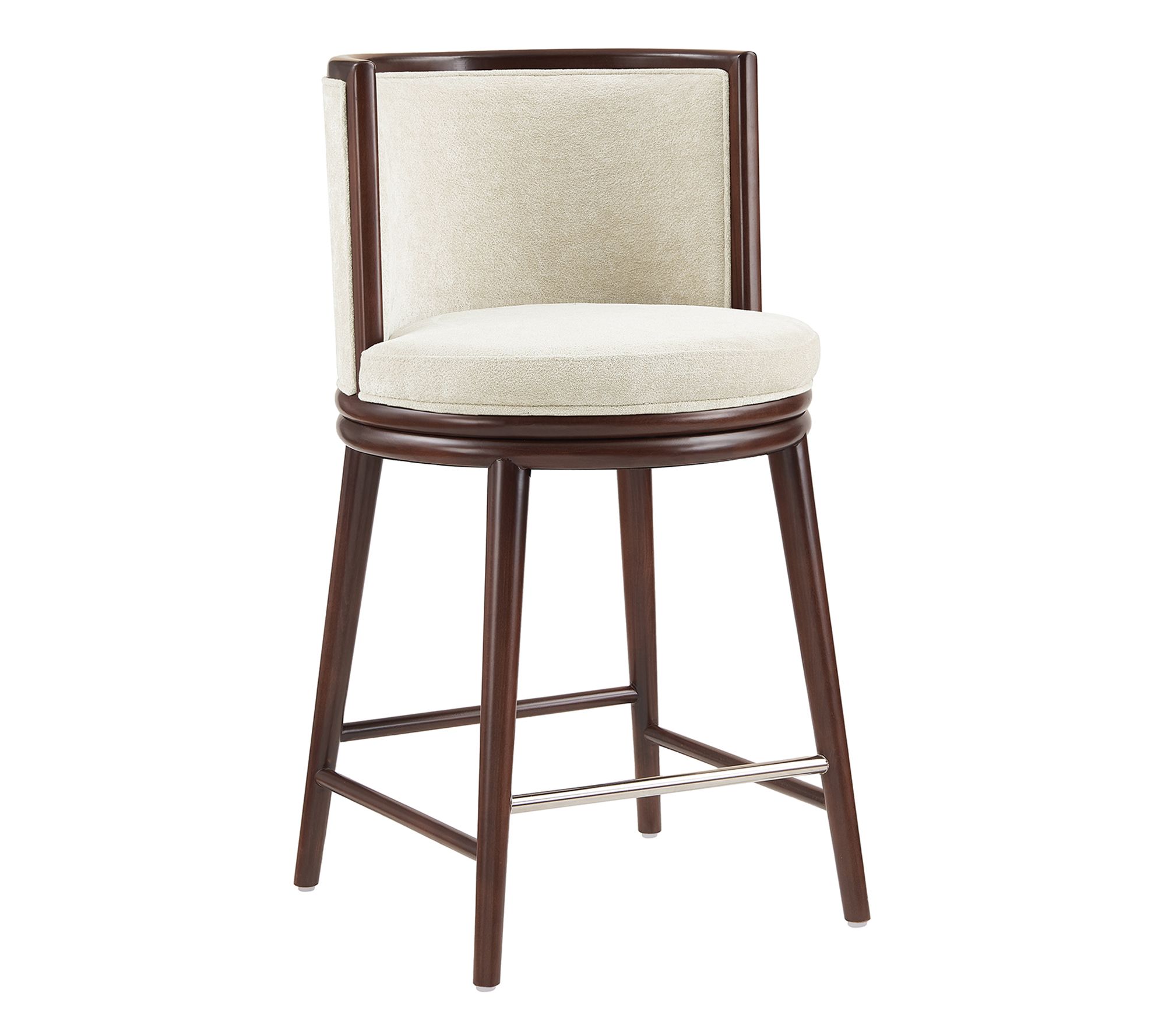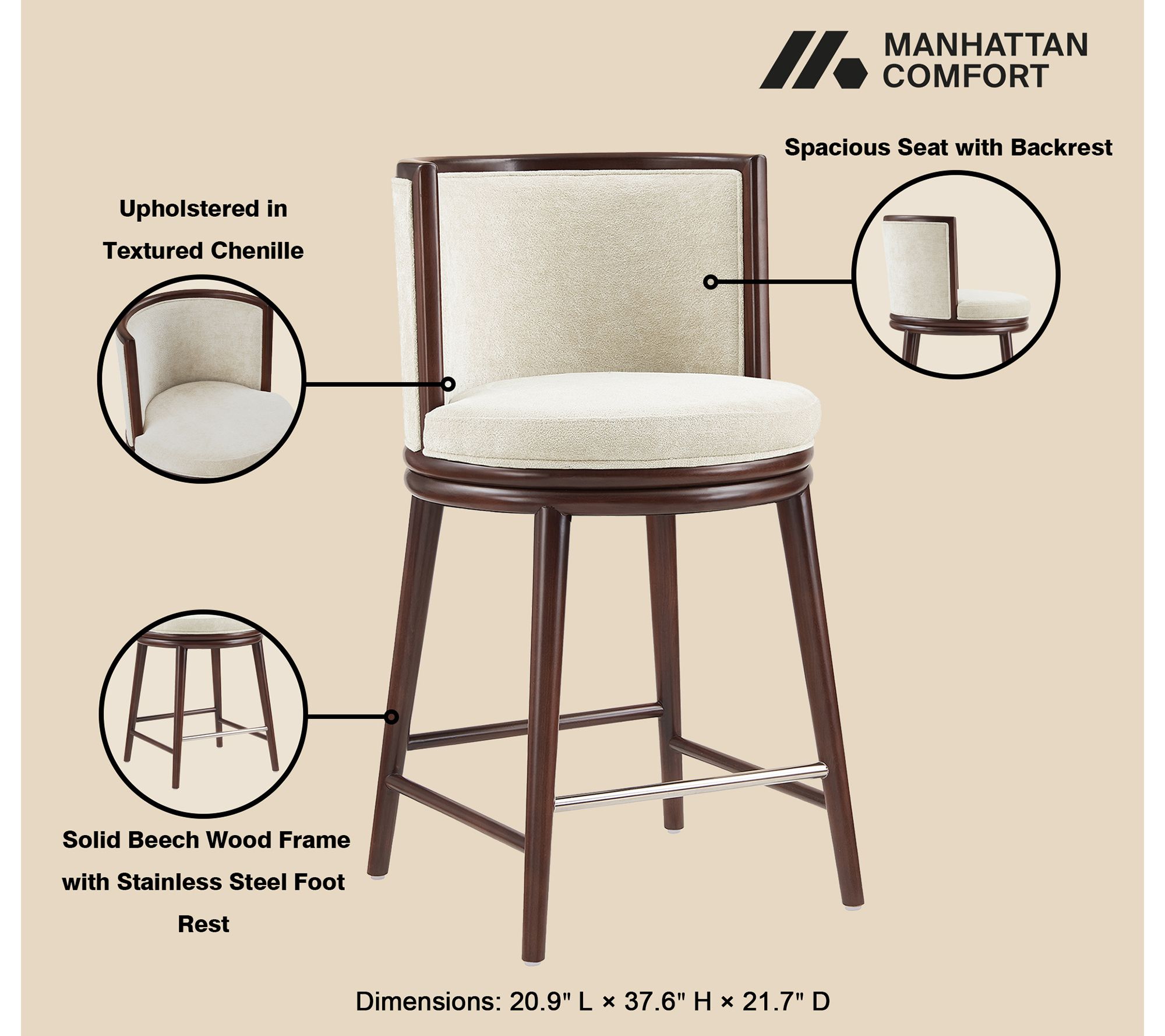 Relax at your kitchen island or counter while enjoying the comfort and striking style of this pair of Evalyn counter stools. Plush foam padding, a round upholstered seat, and dark walnut beech wood bring modern appeal, while the stainless steel footrest adds a subtle gleam. From Manhattan Comfort.