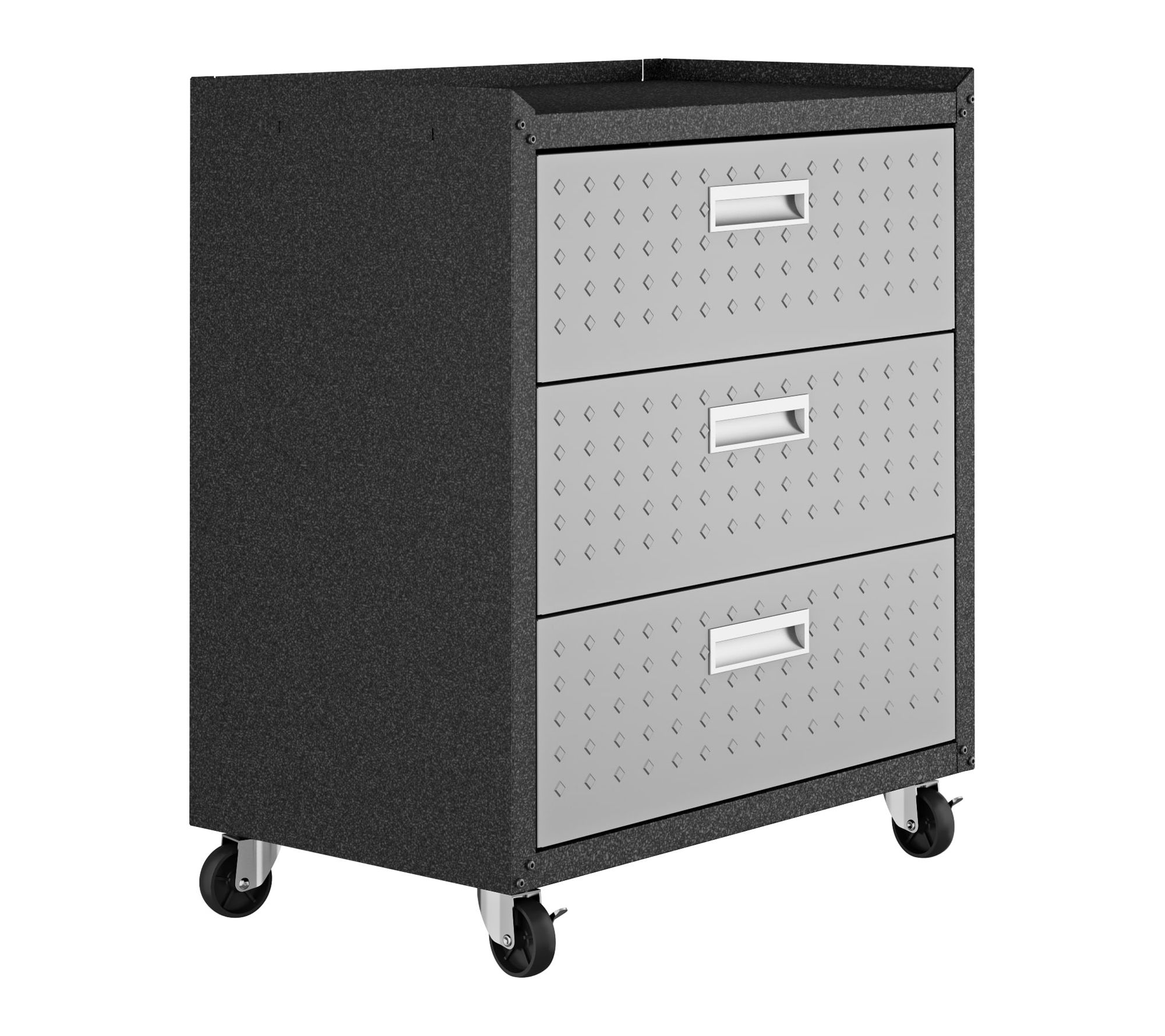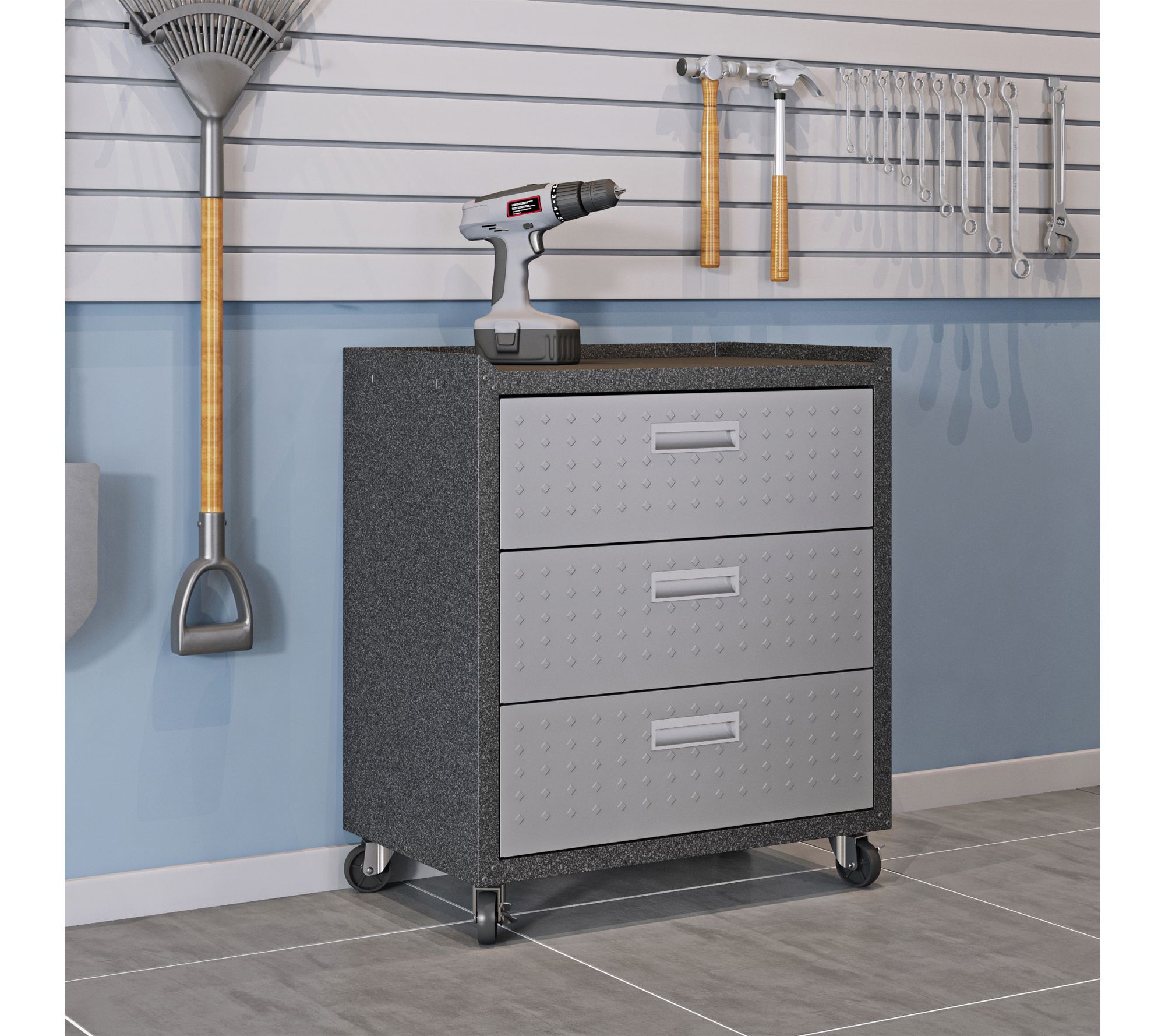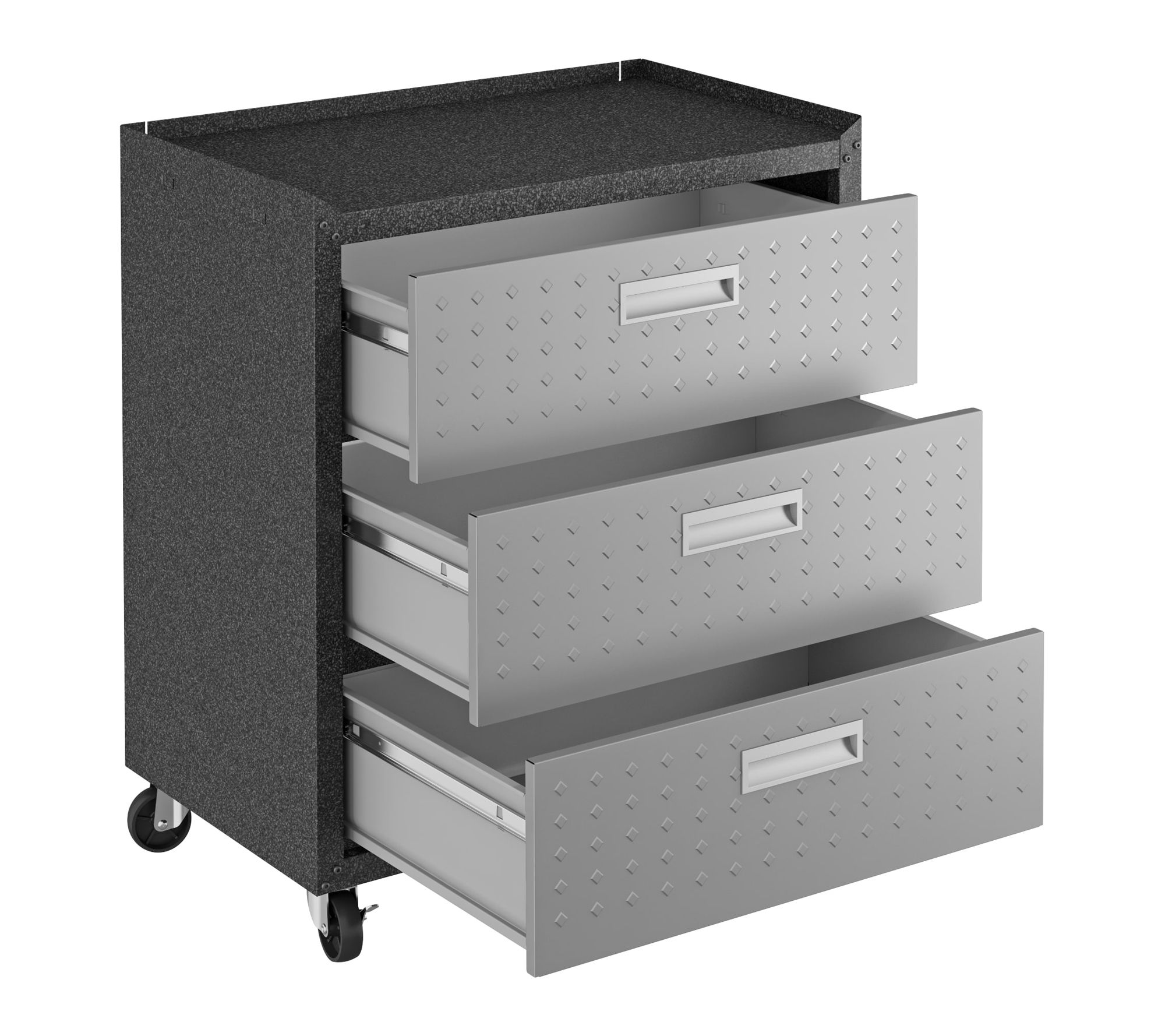 Stash tools, spare parts, and garage essentials in style with this mobile garage cabinet, designed to glide wherever you need it thanks to built-in swivel casters. With three full-extension drawers, a recessed handle, and a flat top for extra workspace, this piece keeps your garage organized -- fitting perfectly beneath your work table without taking up precious floor space. From Manhattan Comfort.