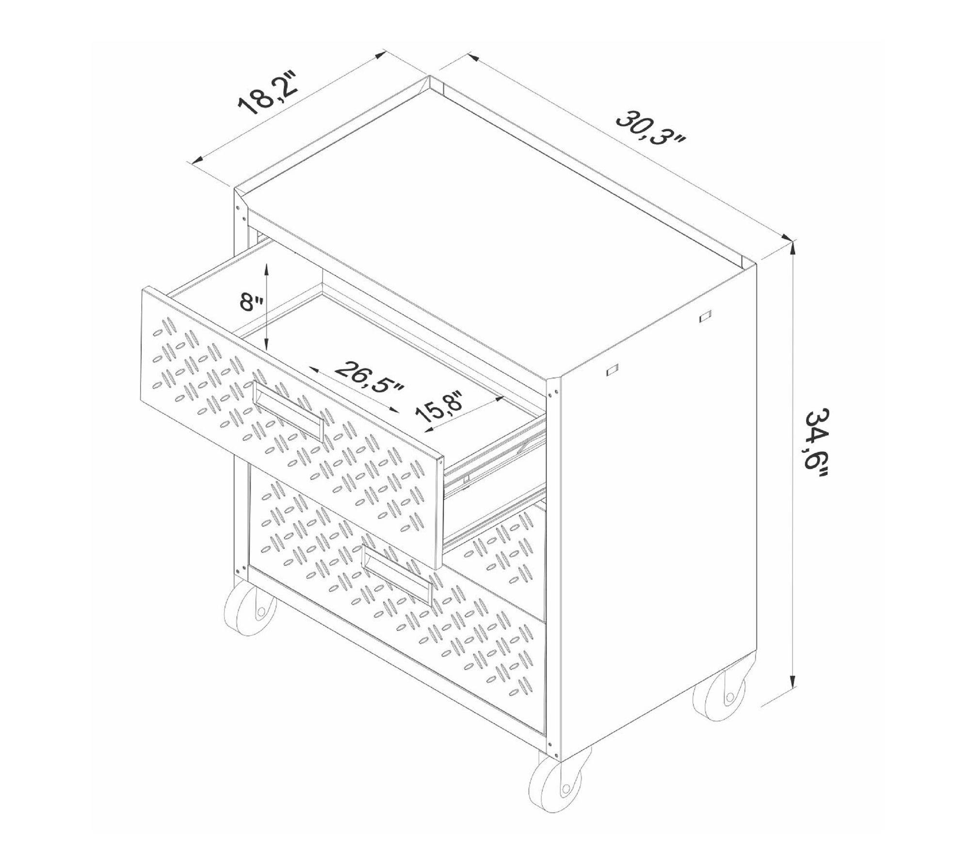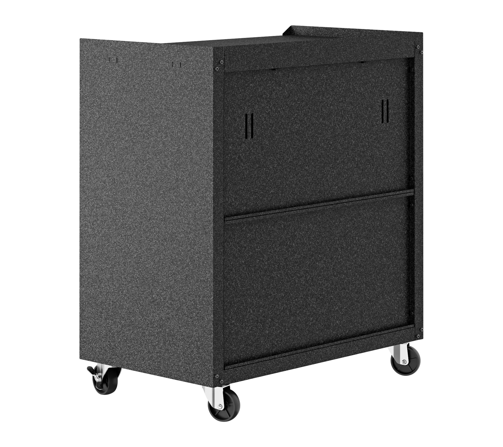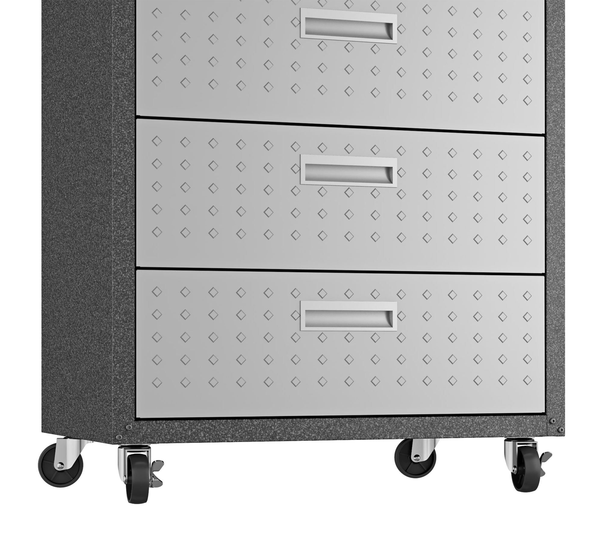 Stash tools, spare parts, and garage essentials in style with this mobile garage cabinet, designed to glide wherever you need it thanks to built-in swivel casters. With three full-extension drawers, a recessed handle, and a flat top for extra workspace, this piece keeps your garage organized -- fitting perfectly beneath your work table without taking up precious floor space. From Manhattan Comfort.