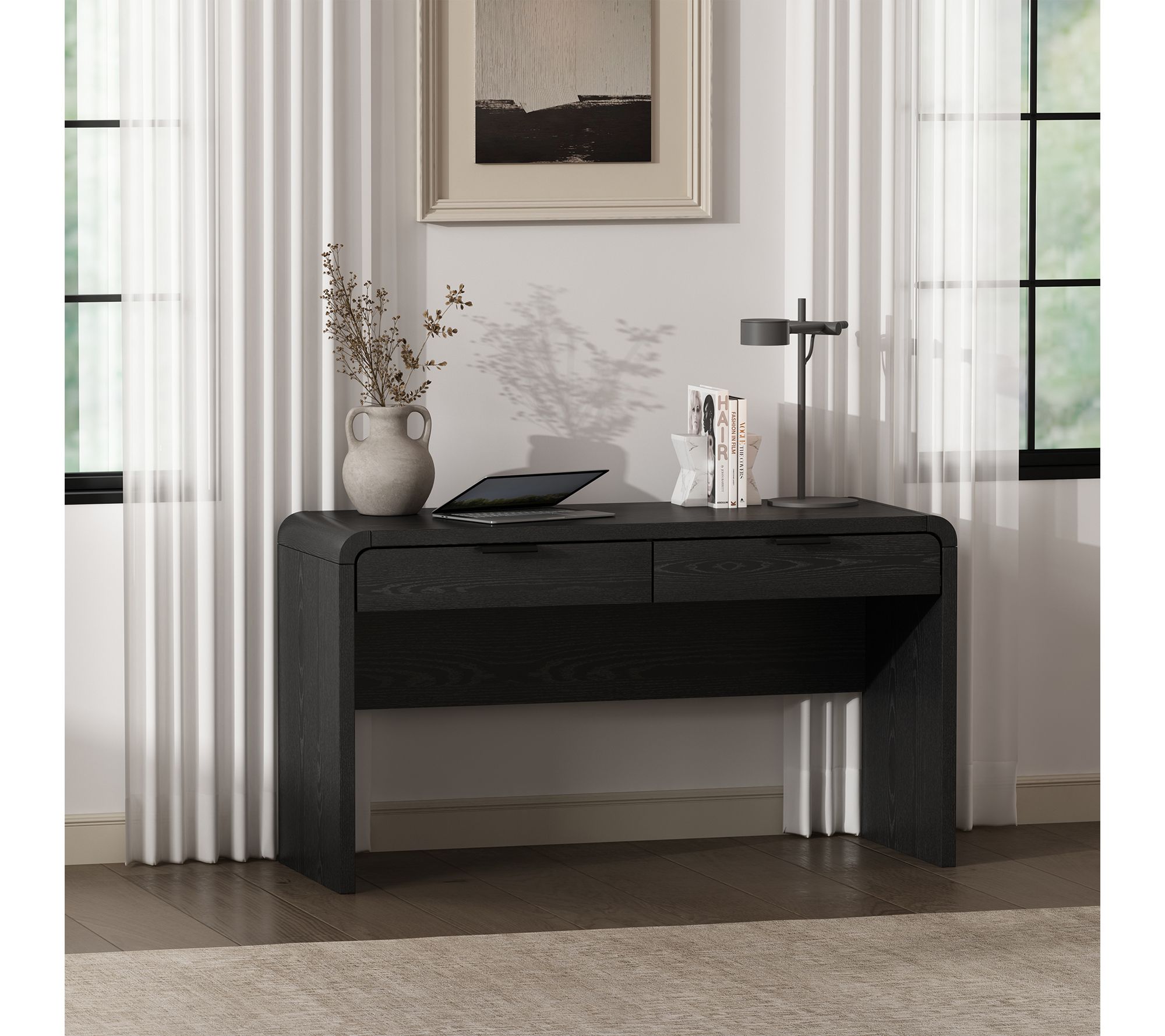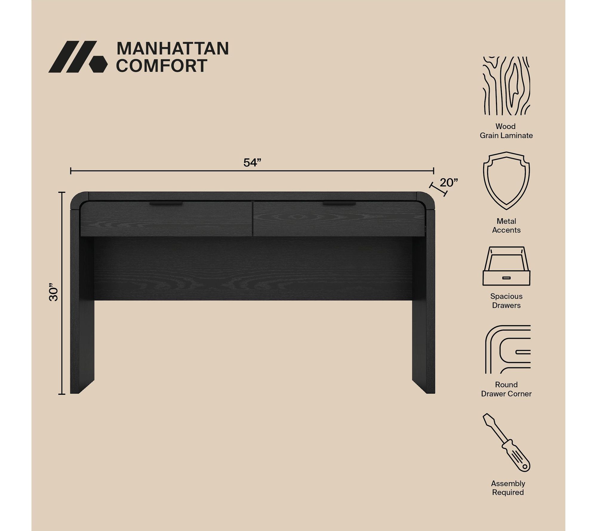 The gentle curves and sleek silhouette of this office desk create a soothing workspace for big ideas, daily tasks, or creative moments. With two spacious drawers and a generous 54" length, you'll find the ideal balance of storage and style, whether you're powering through a workday or writing your next chapter. From Manhattan Comfort.
