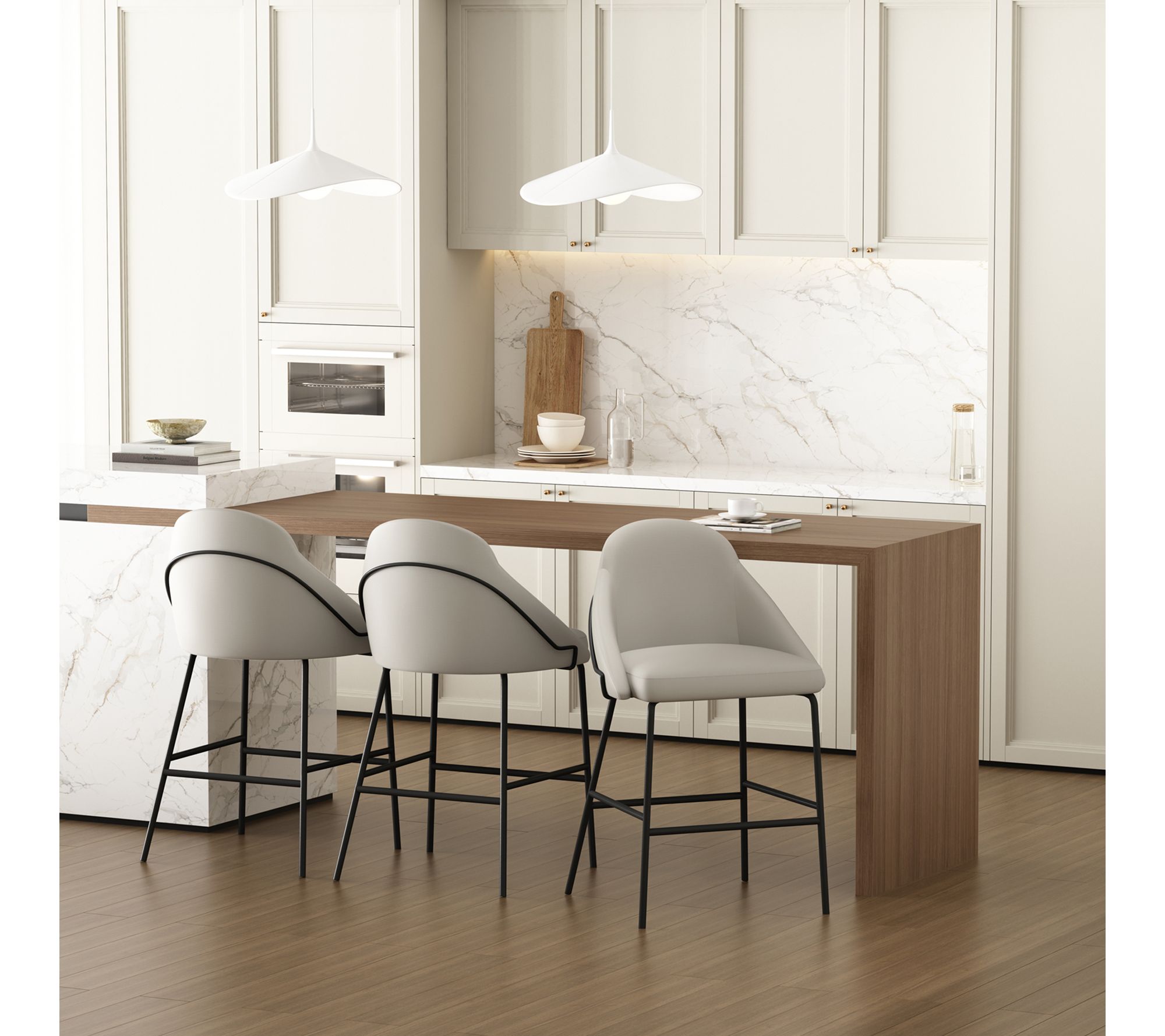 Gather friends and family around your kitchen island or bar with this modern counter stool set, designed to blend timeless elegance with everyday comfort. Sculpted curves, plush seating, and a luxurious leatherette finish create an inviting atmosphere for lively conversations or quiet morning coffee. From Manhattan Comfort.