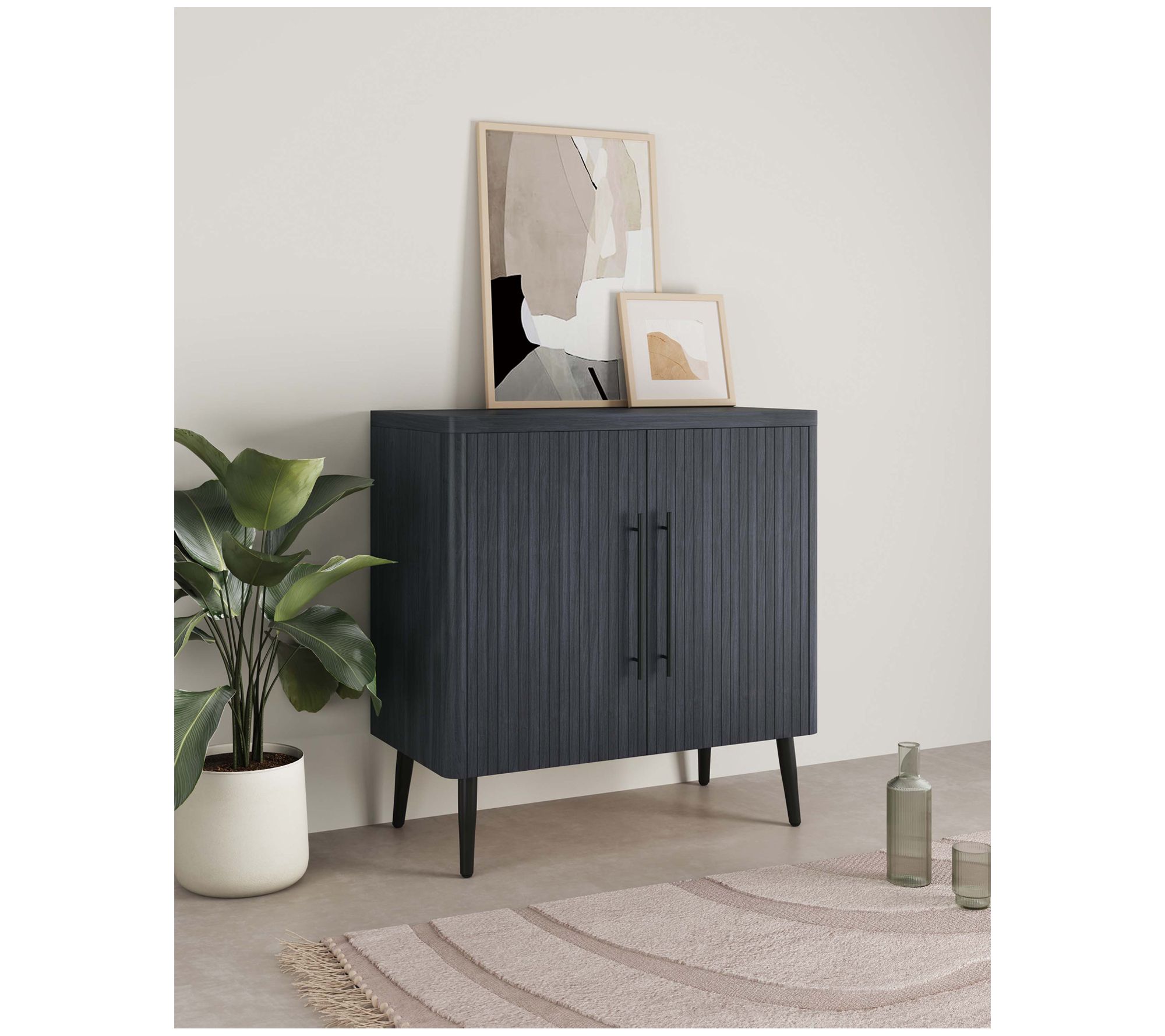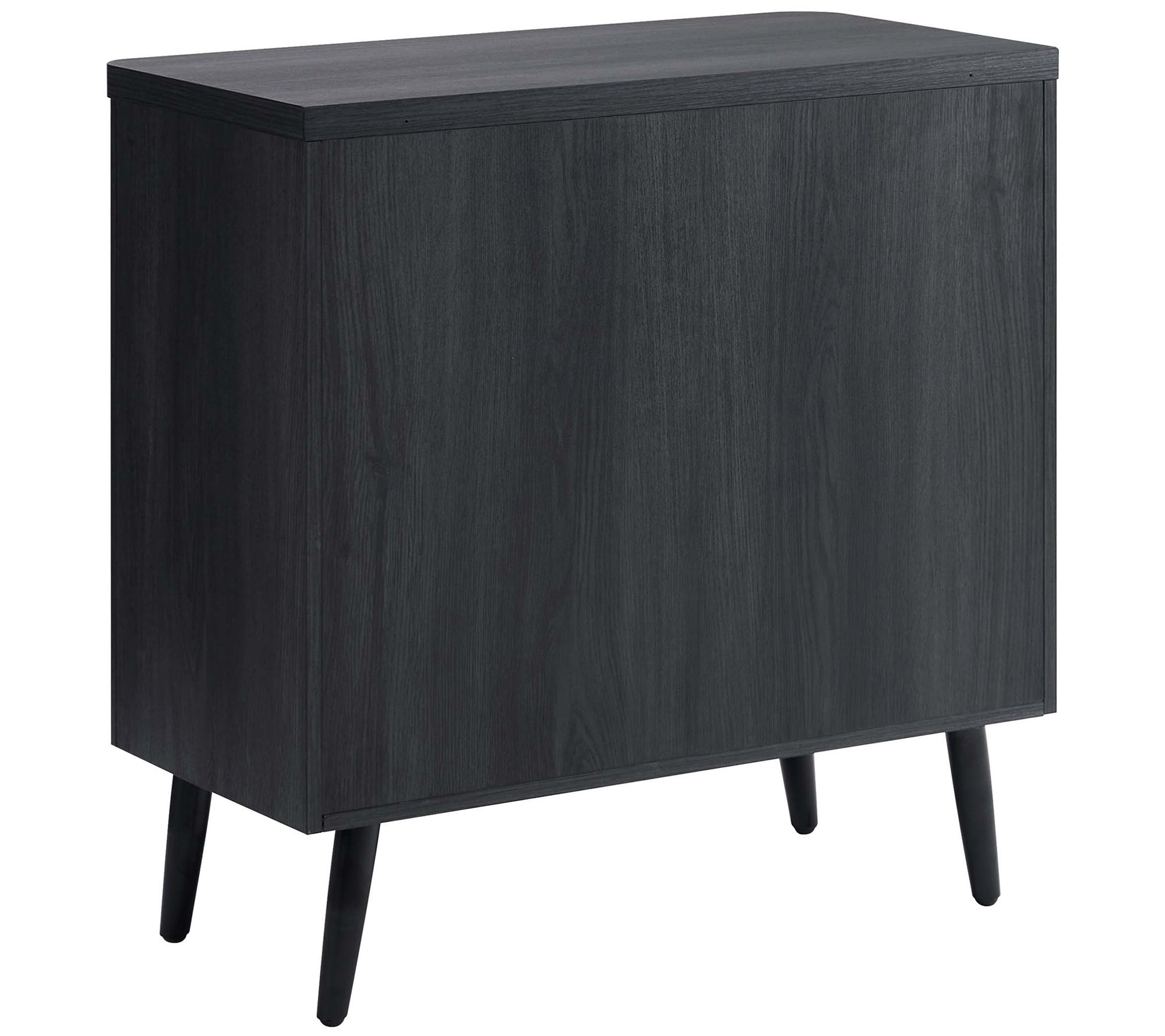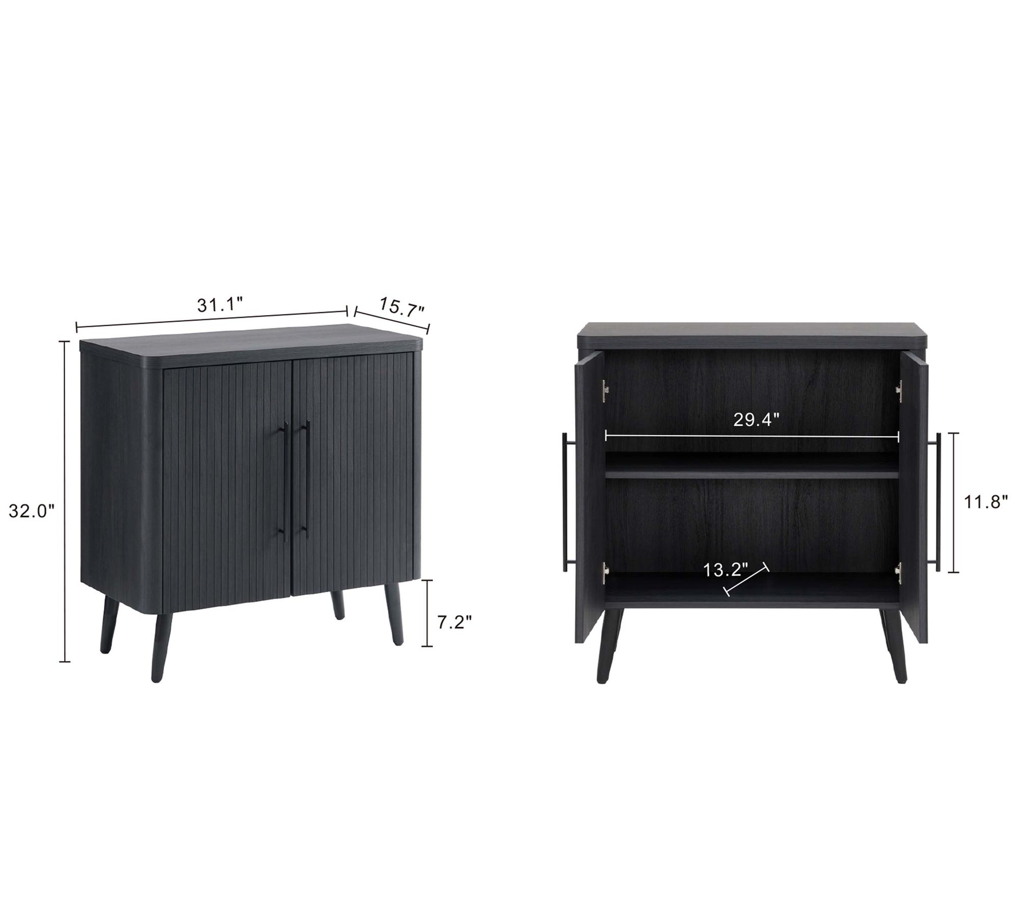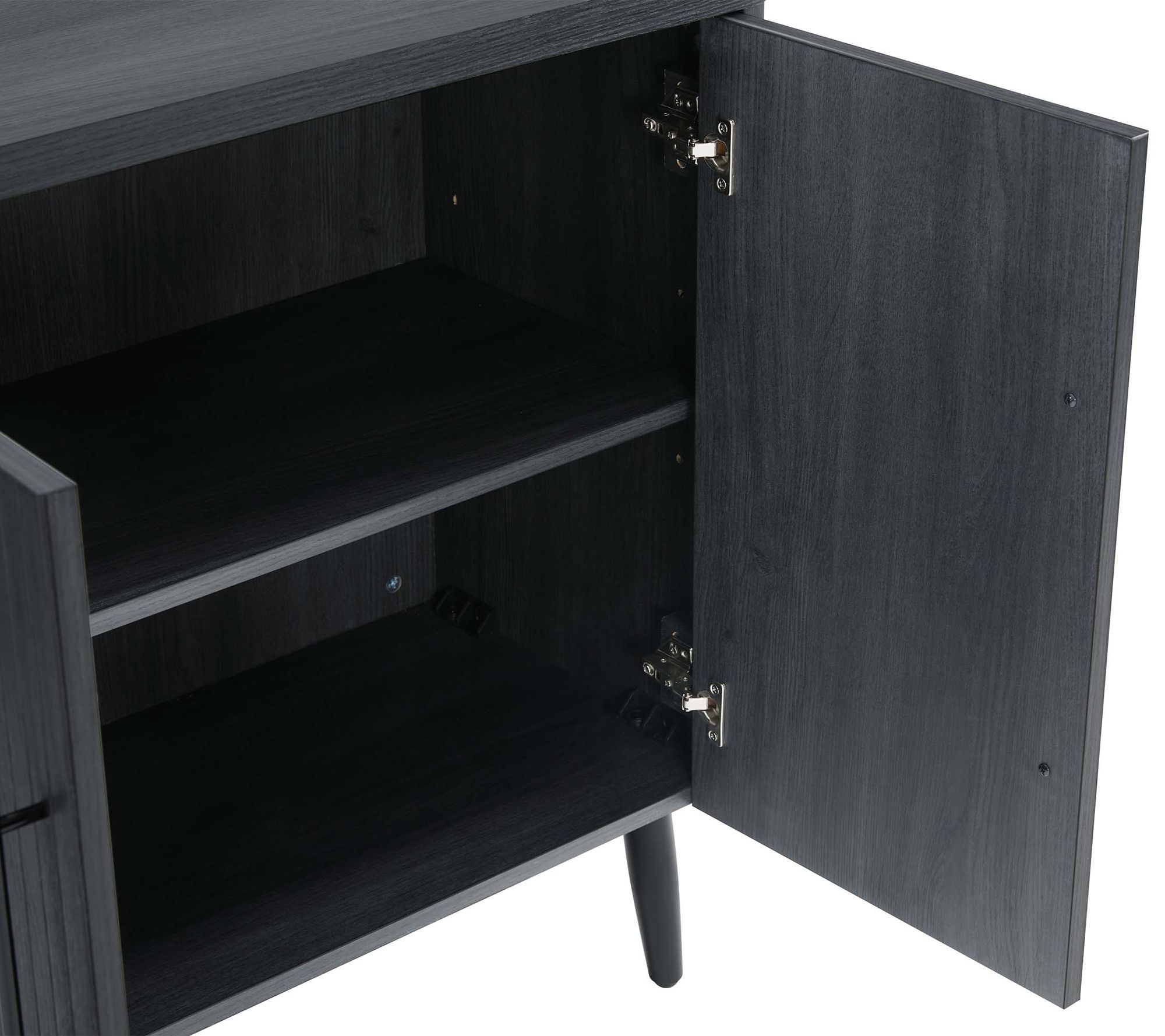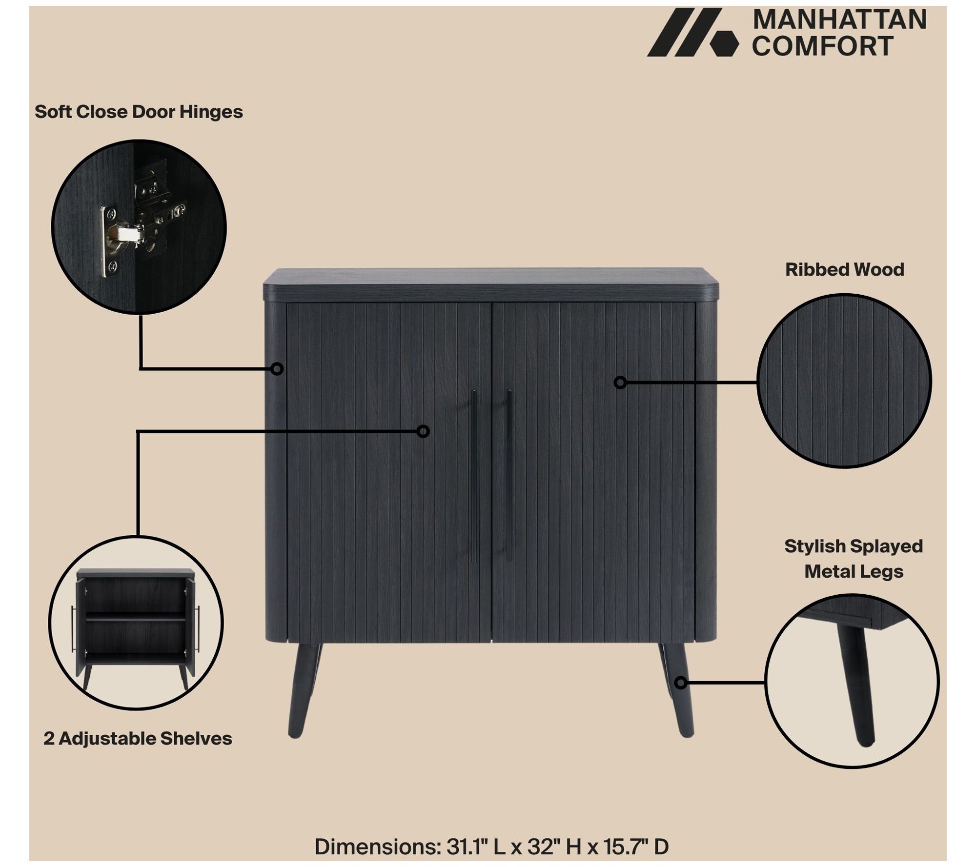 Transform your living space with this sophisticated accent cabinet, perfect for a home office, kids room, living room, or bedroom. The sleek black metal handles and splayed metal legs impart mid-century modern charm. Enjoy the practicality of two hidden adjustable cubby shelves and doors with soft close features -- all wrapped in a stylish package. From Manhattan Comfort.
