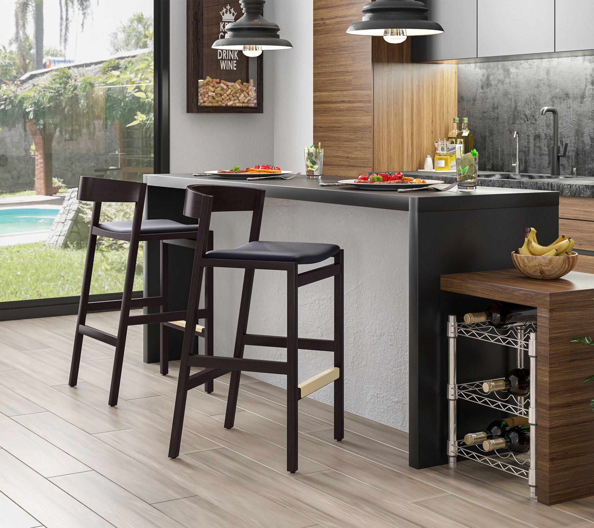 • Includes two counter stools