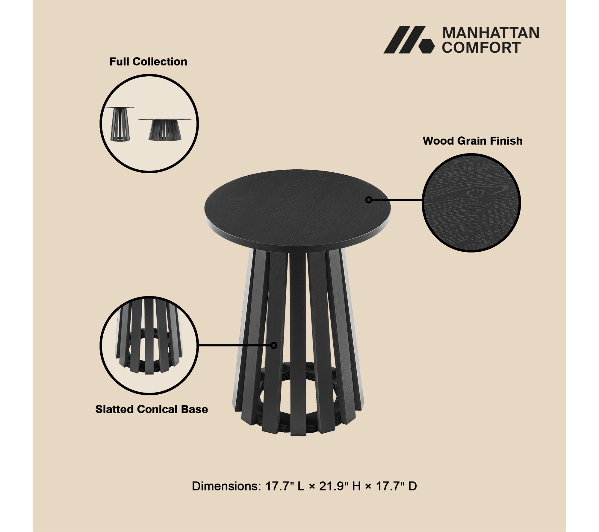 A cozy evening feels even more inviting with this sculptural accent by your side. Styled beside your sofa or nestled next to your favorite reading chair, its round tabletop is ready for everything from a lamp to your latest read. The conical slatted base brings airy dimension and a dash of organic texture, making any moment at home just a little more special. From Manhattan Comfort.