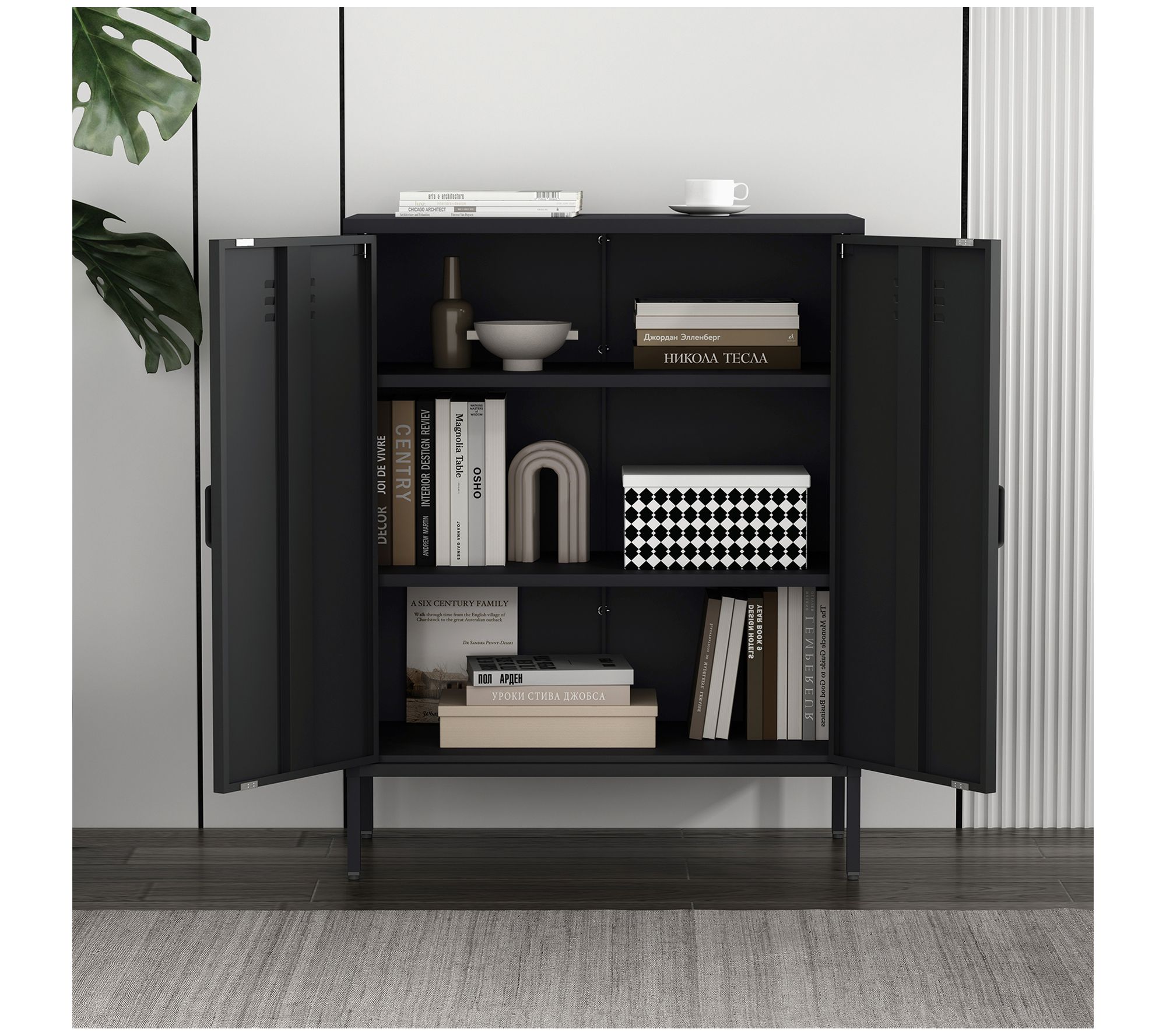 The Naomi accent cabinet brings a chic, industrial flair with its clean lines and sleek, minimalist silhouette. Imagine it gracing your living room or office, offering not just aesthetic appeal but practical storage solutions with its vented doors and adjustable shelves. From Manhattan Comfort.