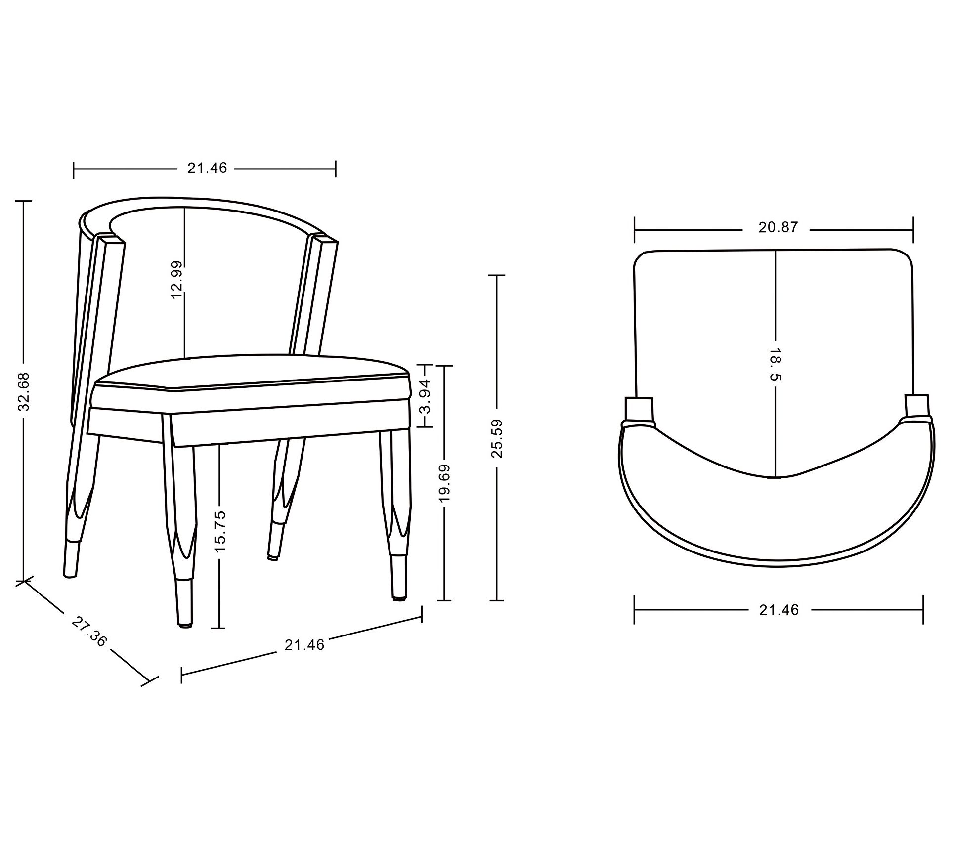 Measures 21.46"L x 27.36"D x 31.5"H; seat height 19.69", inner seat depth 18.5", inner seat width 20.87"