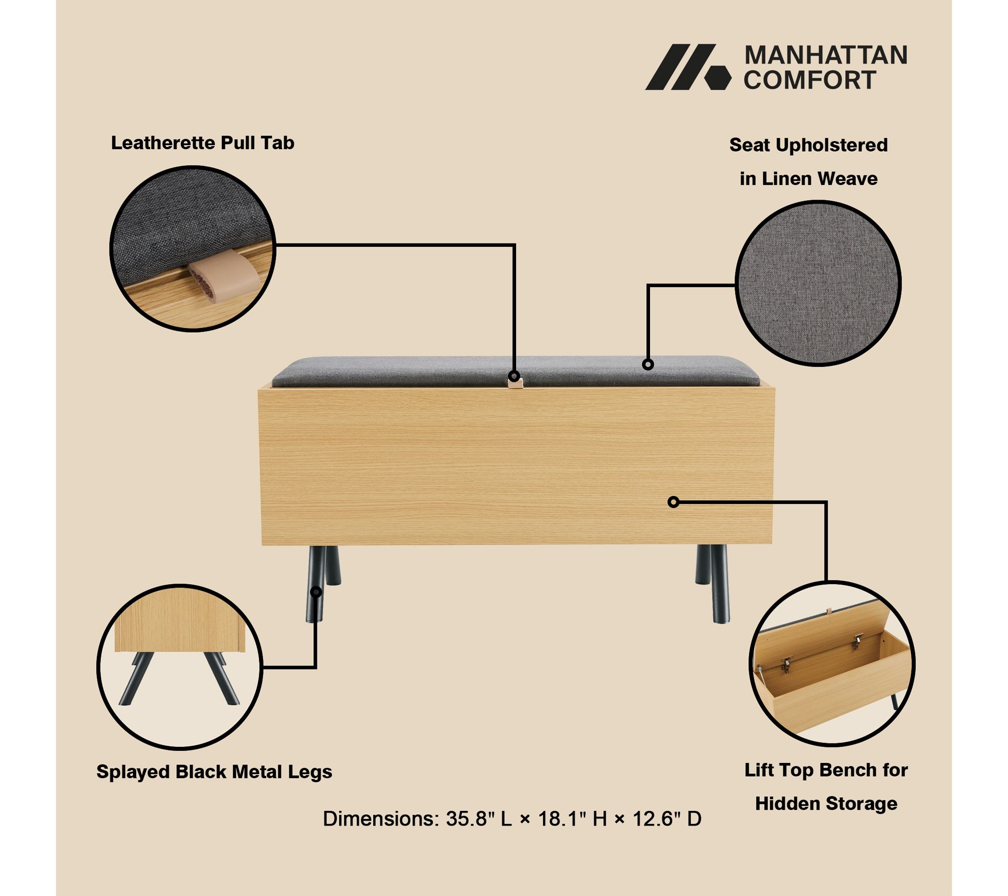 Whether you're slipping off your shoes after a long day or organizing entryway essentials for the week ahead, this accent bench brings a moment of calm to busy spaces. The cushioned linen seat invites lingering, while clever storage under the lift-top keeps everything in order. From Manhattan Comfort.