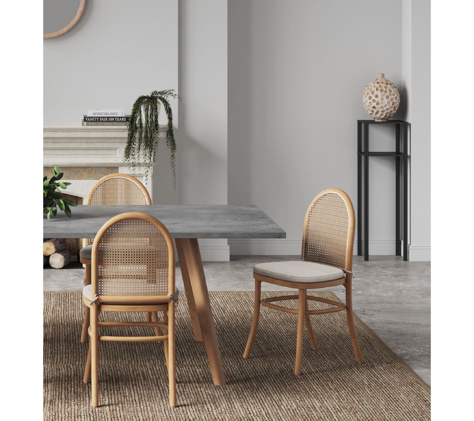 A relaxed meal or lively gathering feels even more inviting with seating that strikes the right balance between comfort and style. Warm wood grain, natural cane accents, and a curved, supportive back lend a modern touch to the dining room, while included cushions create extra comfort for long dinners with friends and family. From Manhattan Comfort.