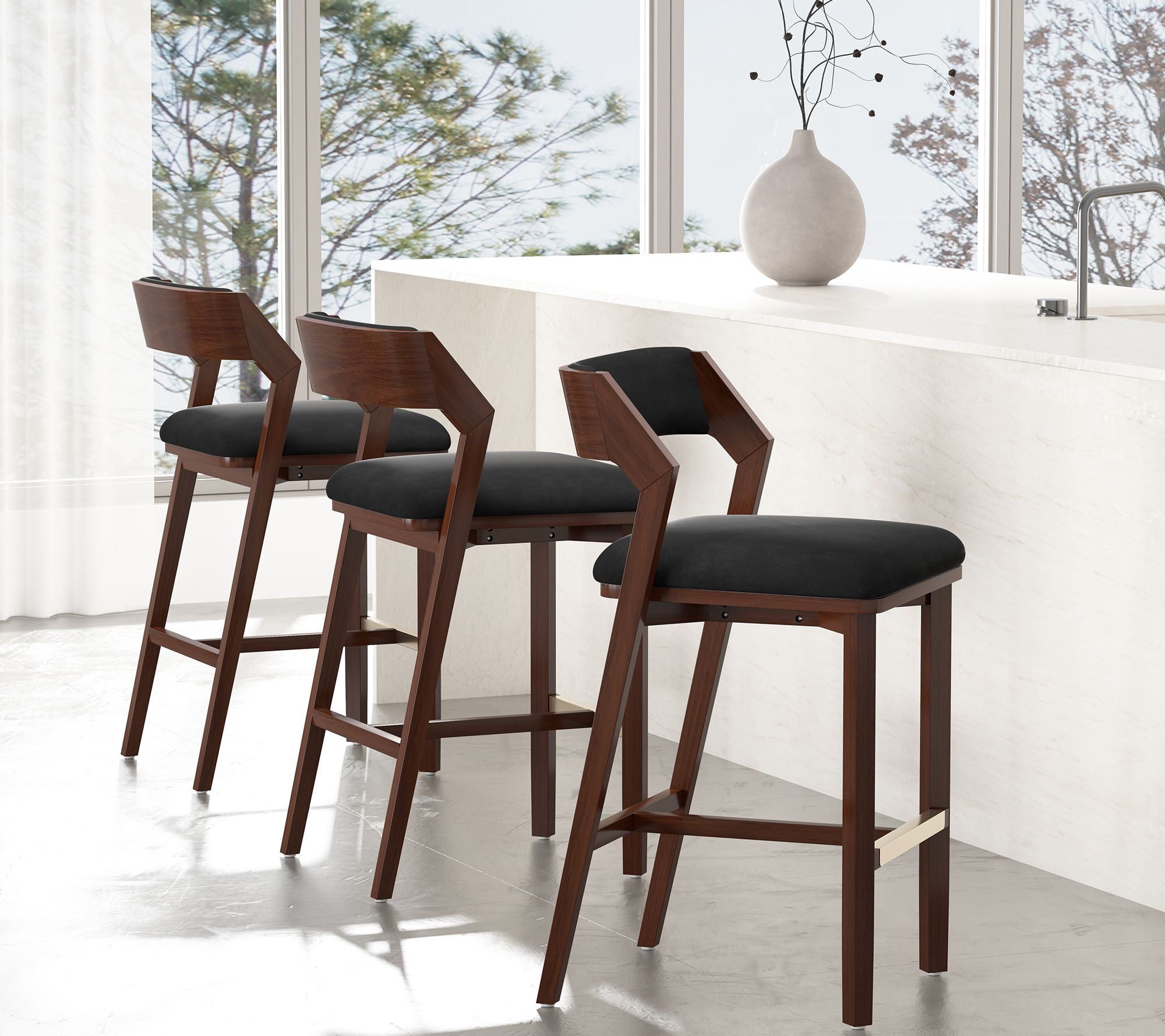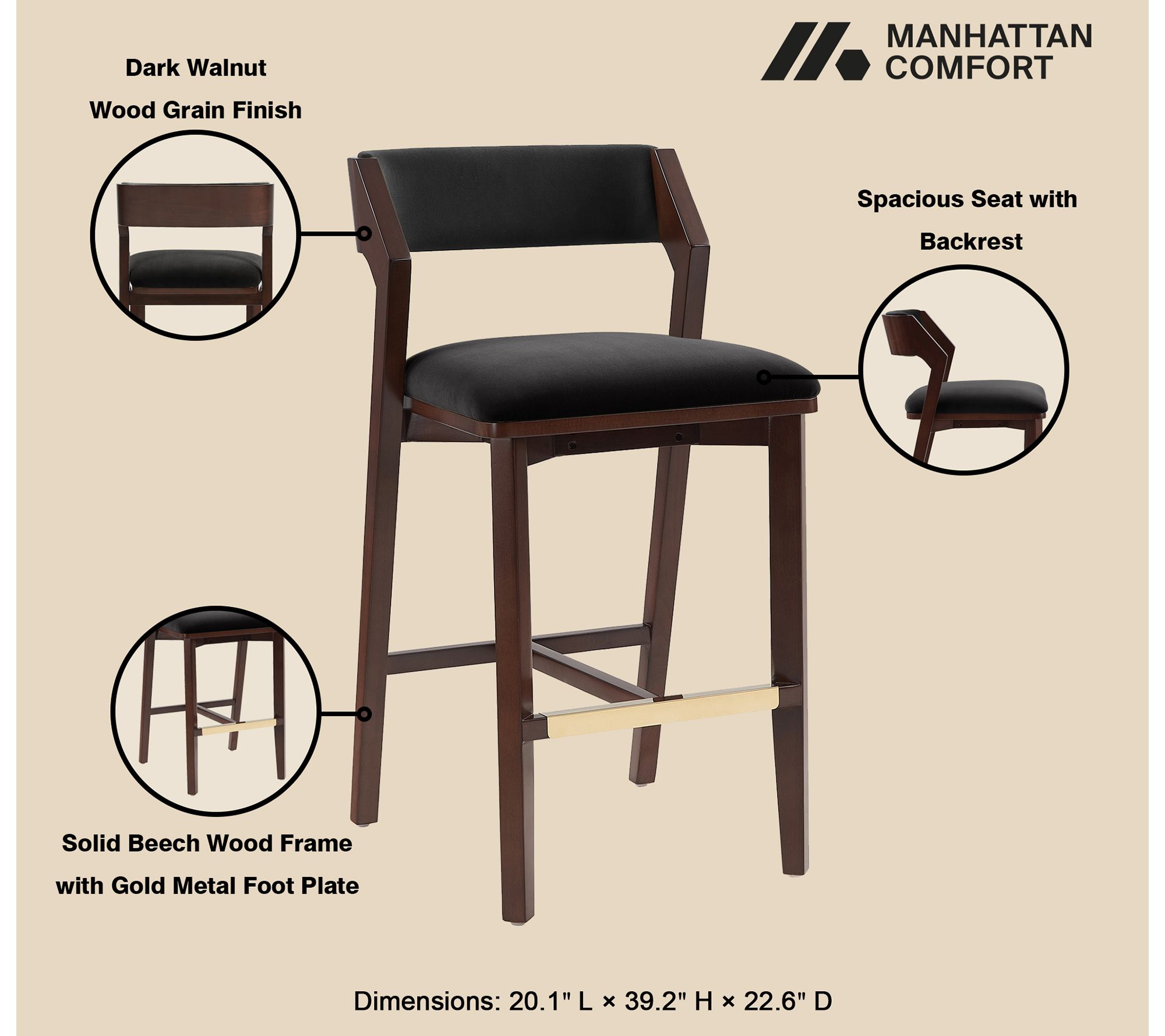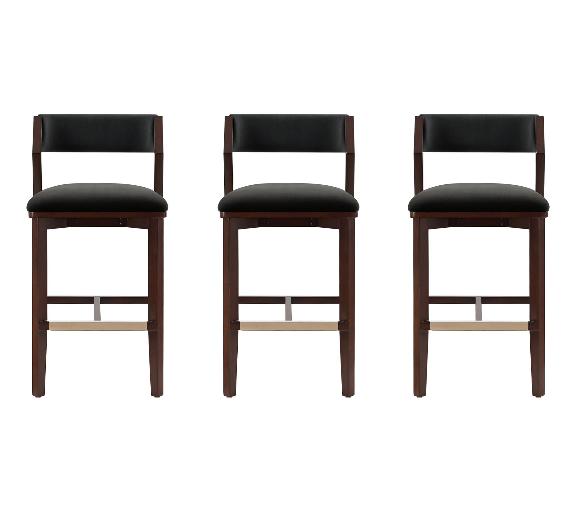 Hosting friends for a cozy cocktail hour or enjoying a leisurely brunch just got more stylish with this set of three barstools. Velvet upholstery and a padded, rounded backrest create a comfortable seat, while the goldtone footrest and beech wood frame exude modern glam. Delivered fully assembled, they're ready to bring a refined touch to your kitchen or bar. From Manhattan Comfort.