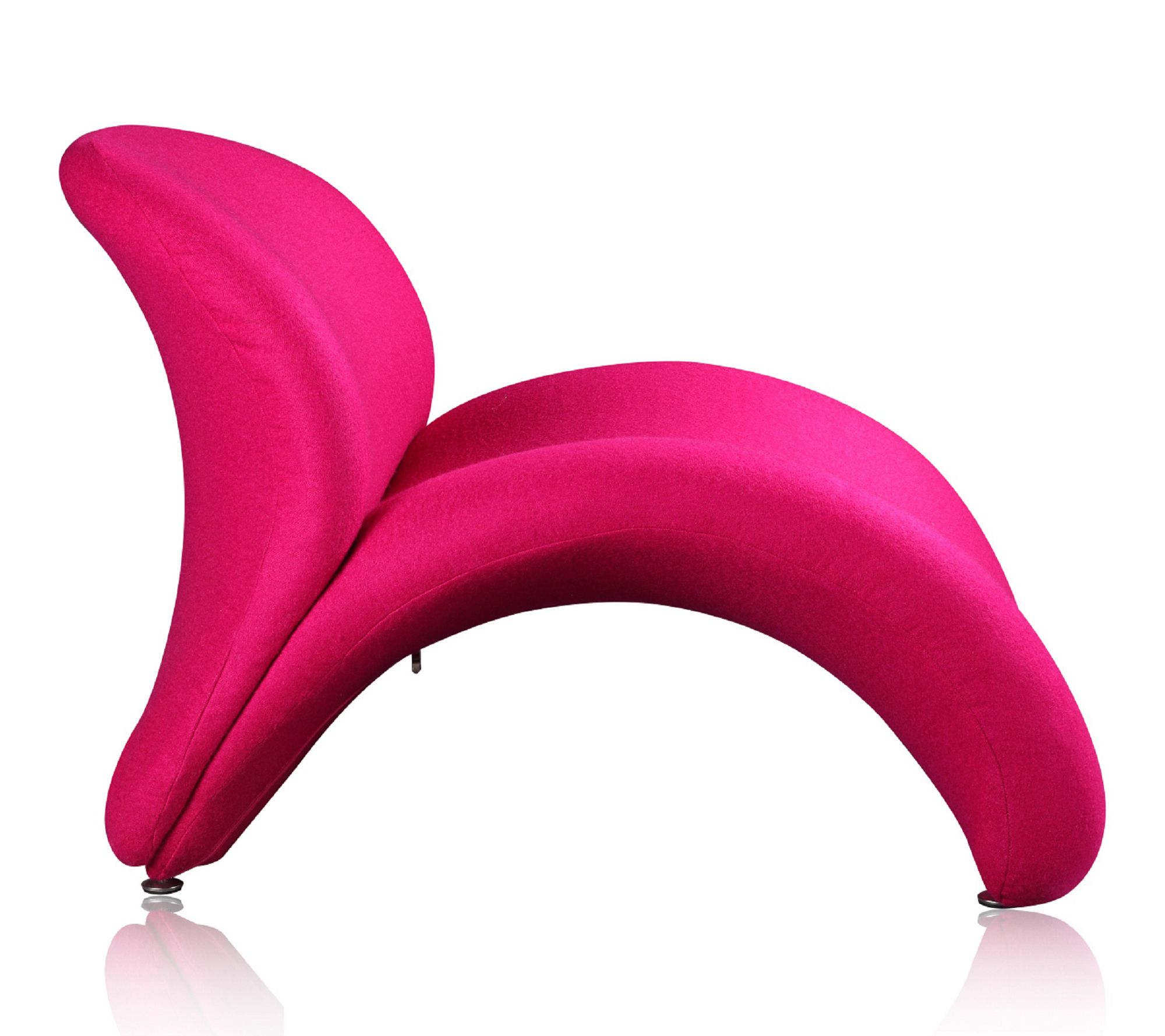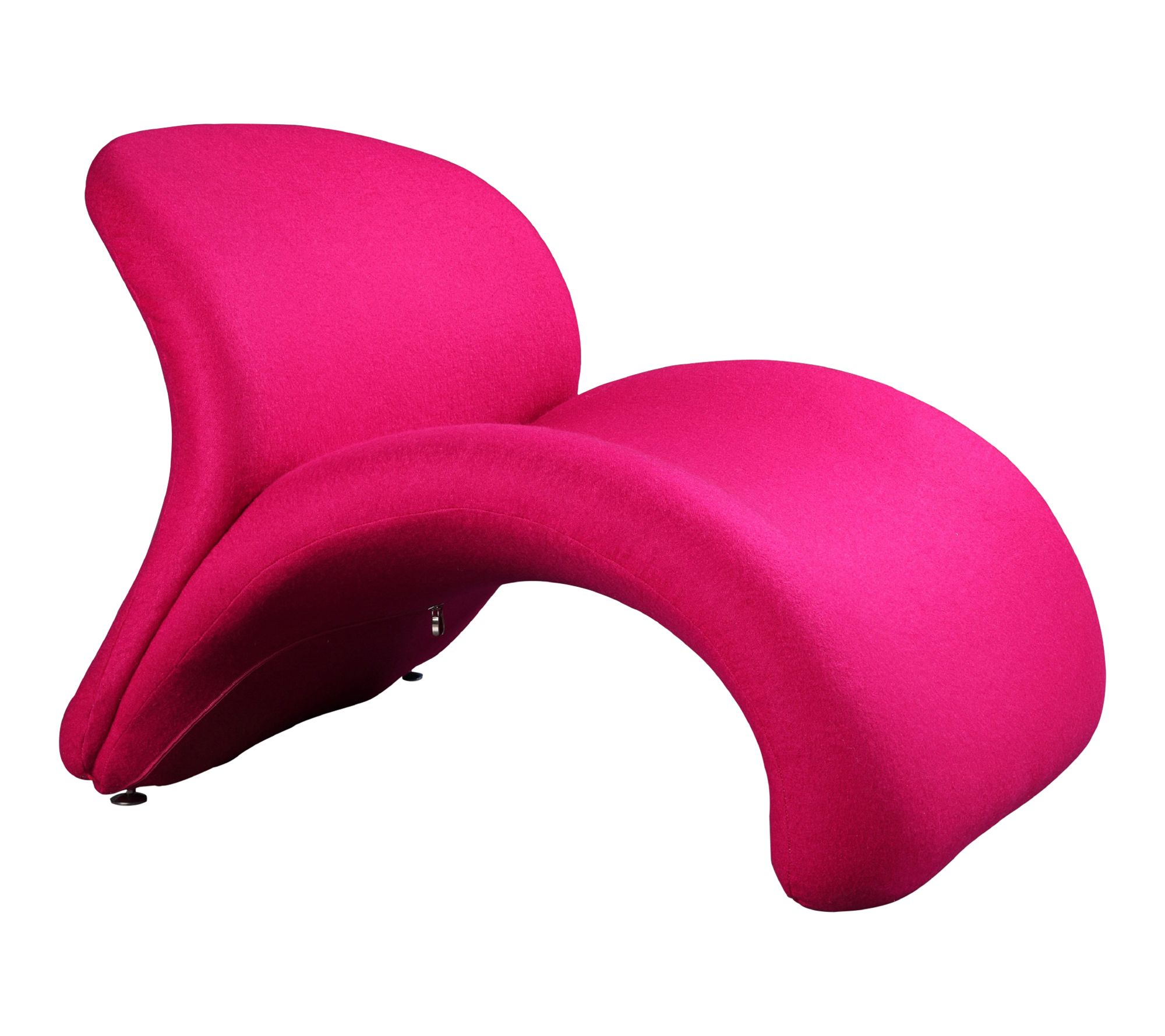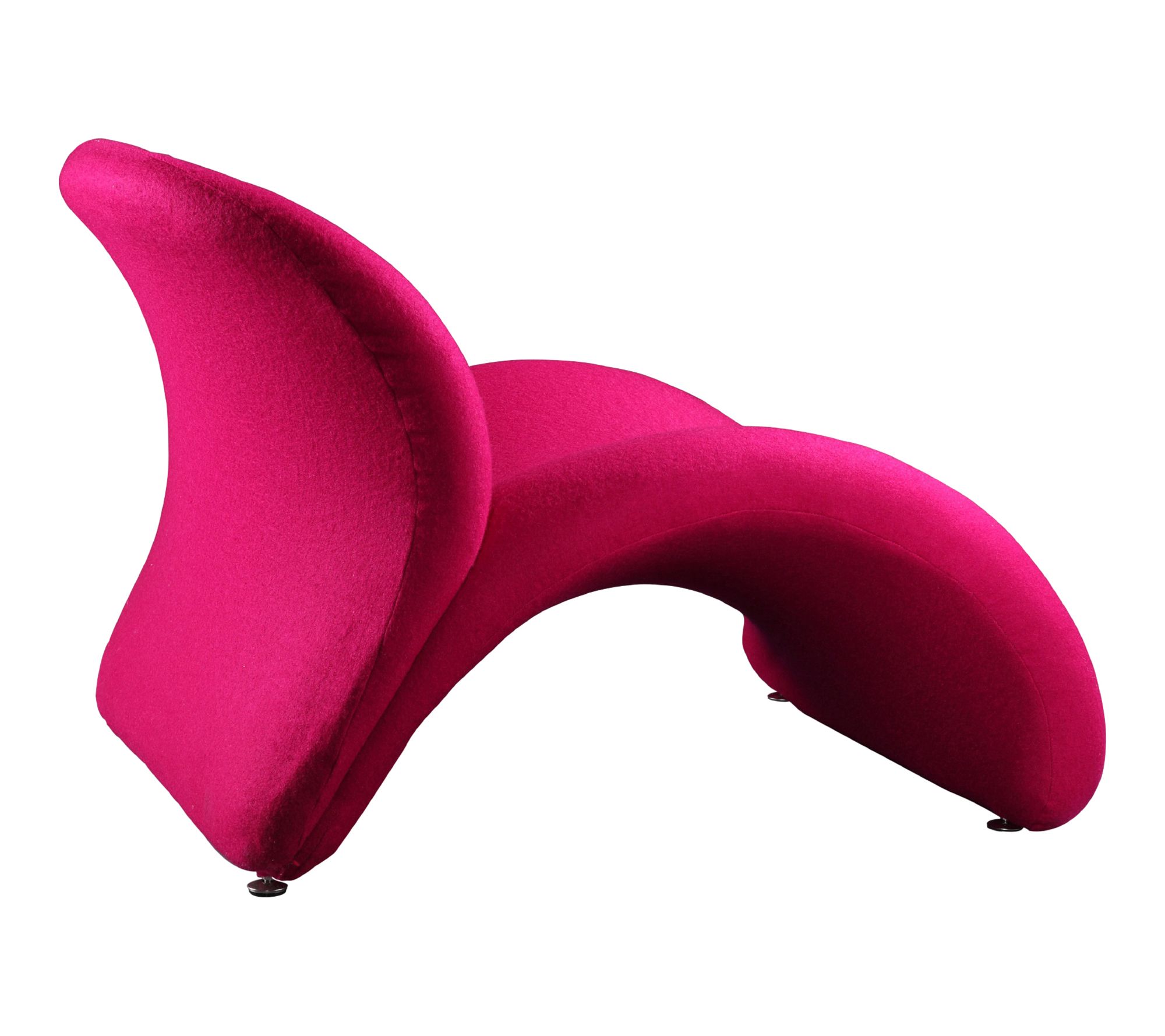 • Modern abstract lounge design with distinctive tongue silhouette; fully upholstered in wool blend fabric; framed with metal and three geometric legs