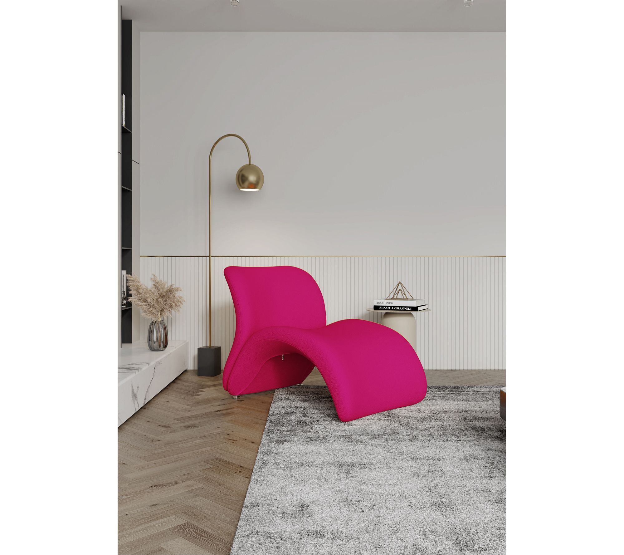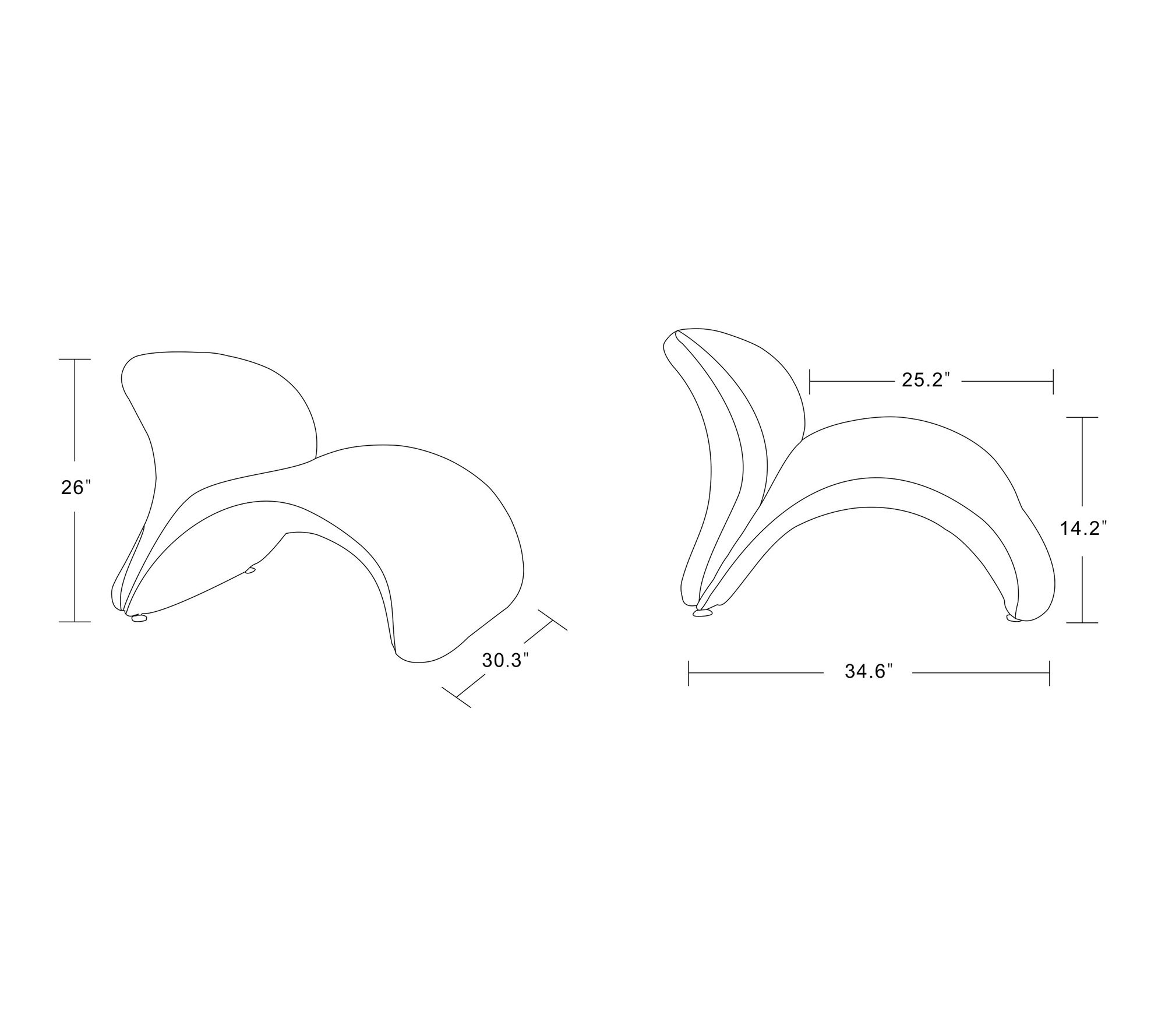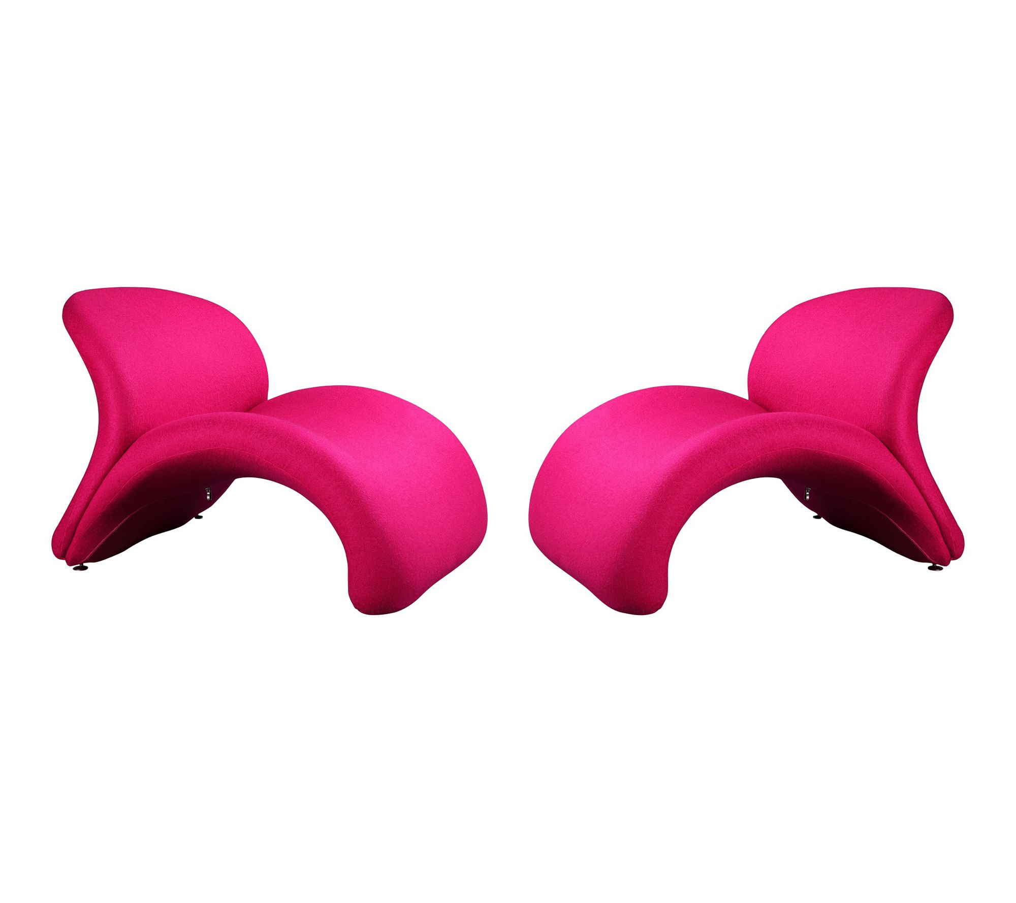 • Modern abstract lounge design with distinctive tongue silhouette; fully upholstered in wool blend fabric; framed with metal and three geometric legs