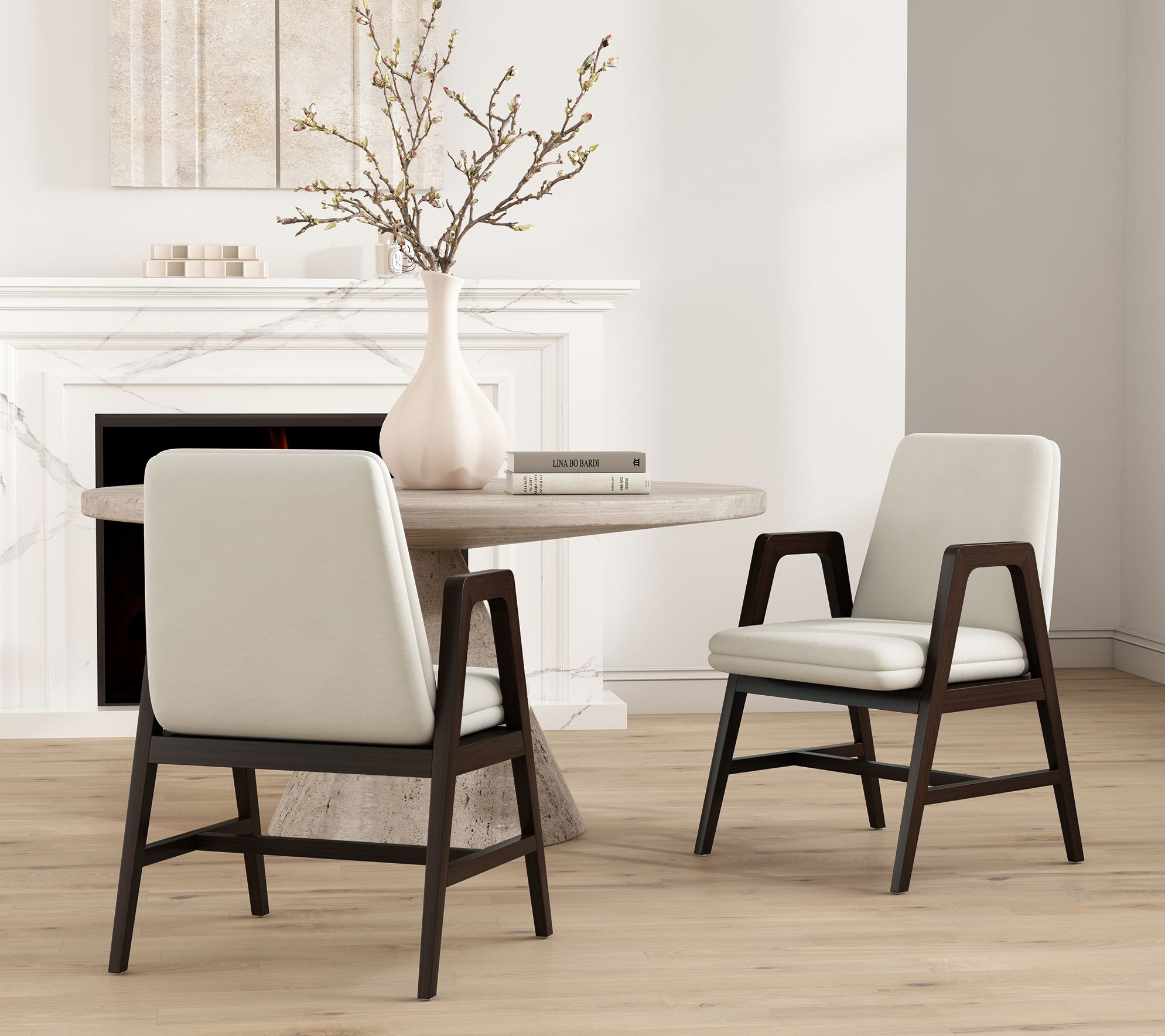 • Modern design with sculptural open arms and backrest