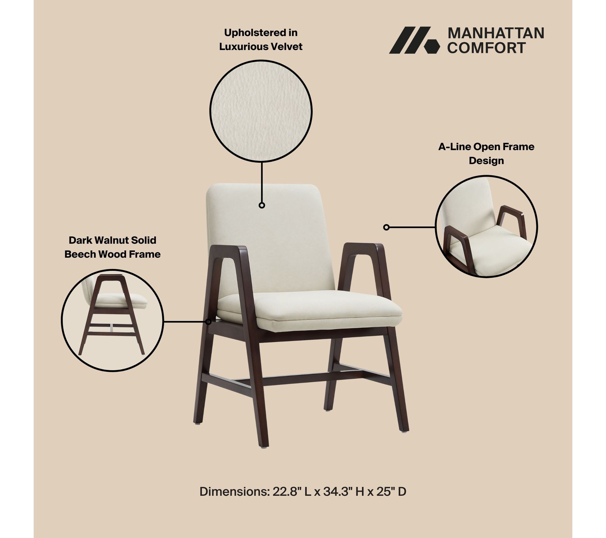 Infuse your dining area with modern charm and comfort by adding this set of two Stella dining armchairs. The rich walnut-stained beech wood frame, open arms, and plush velvet upholstery create a stylish, sculptural look that feels just as inviting at a dinner party as it does in a quiet reading nook. From Manhattan Comfort.