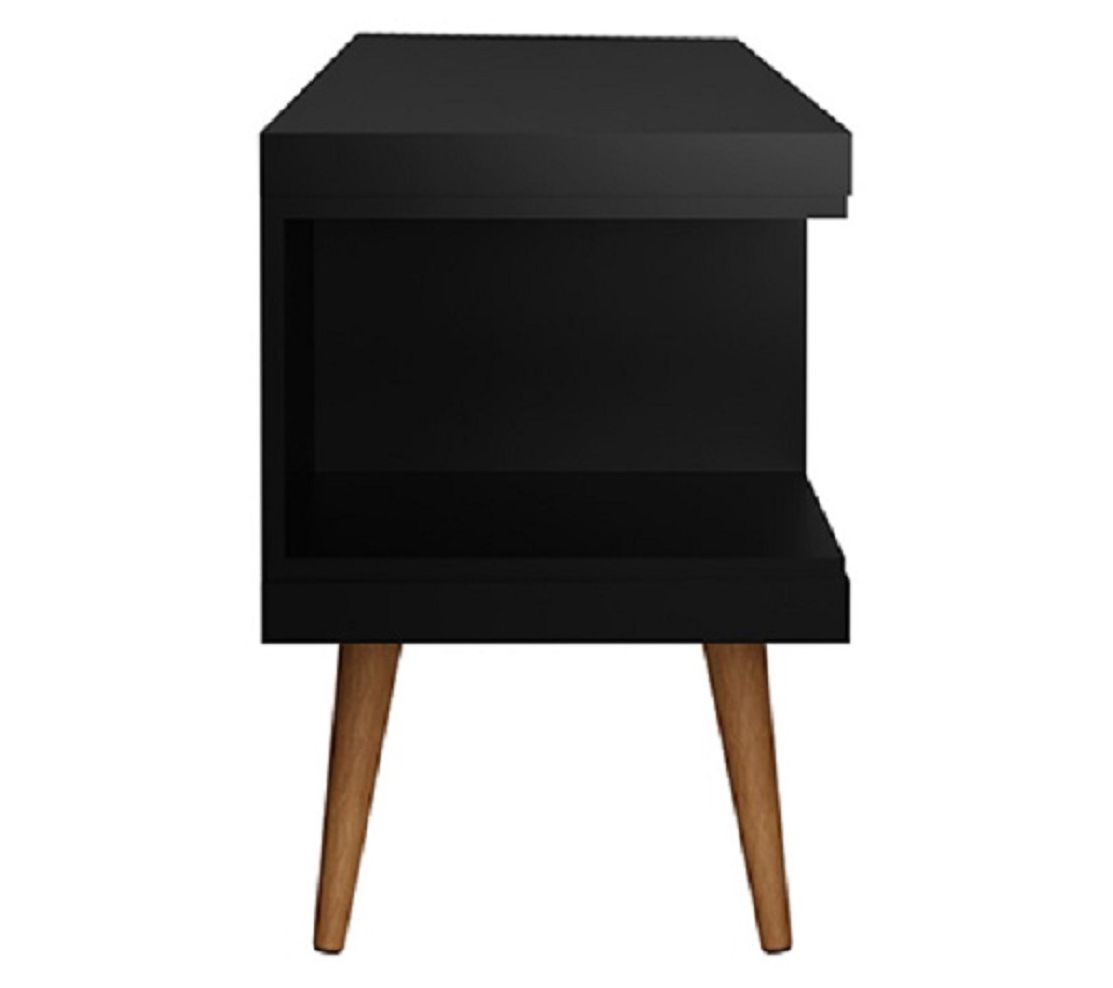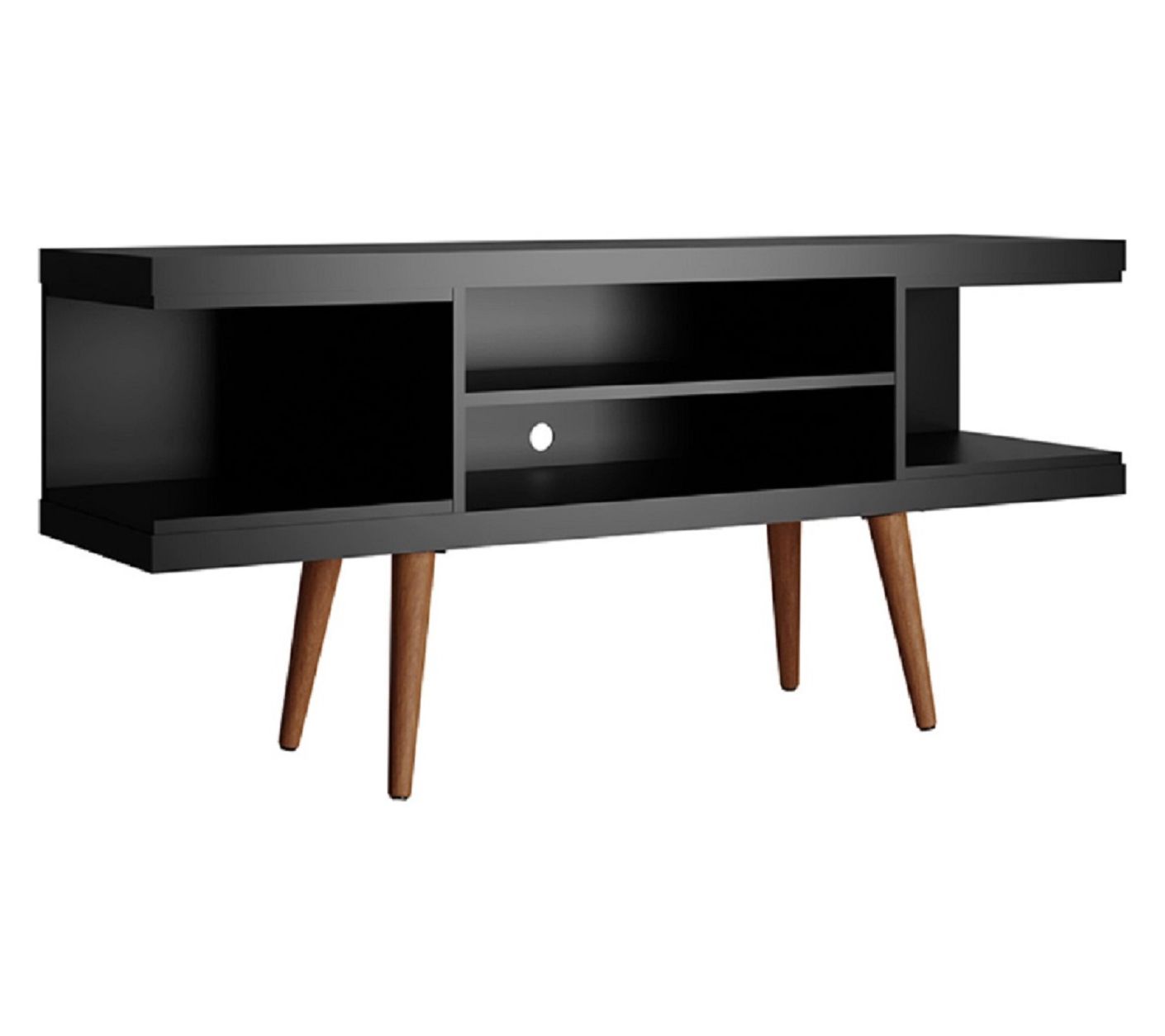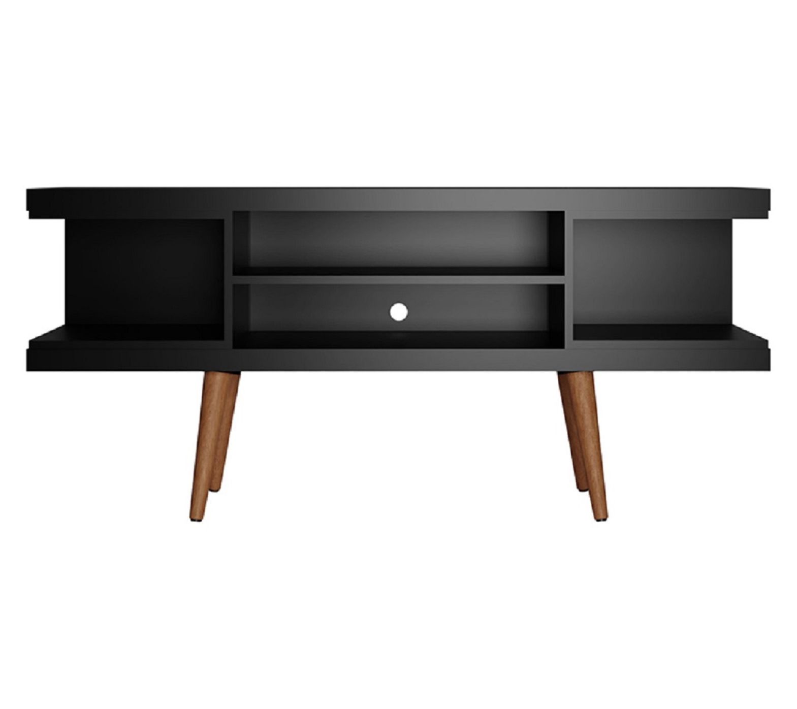 Movie nights and game-day gatherings feel a little more organized and a lot more stylish with this streamlined entertainment hub as the center of your space. Splayed wood legs anchor its mid-century vibe, while open shelving keeps remotes, consoles, and speakers right where you need them. Cords stay neatly out of sight so your living room or bedroom always looks pulled together. From Manhattan Comfort.