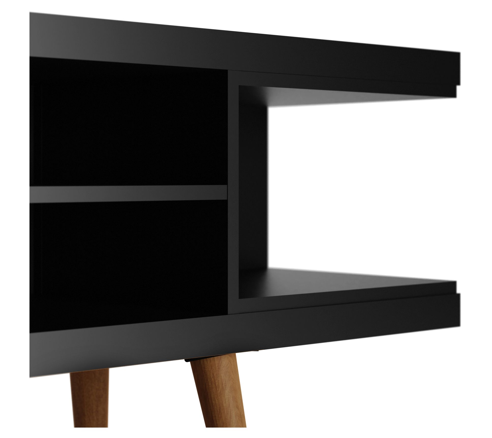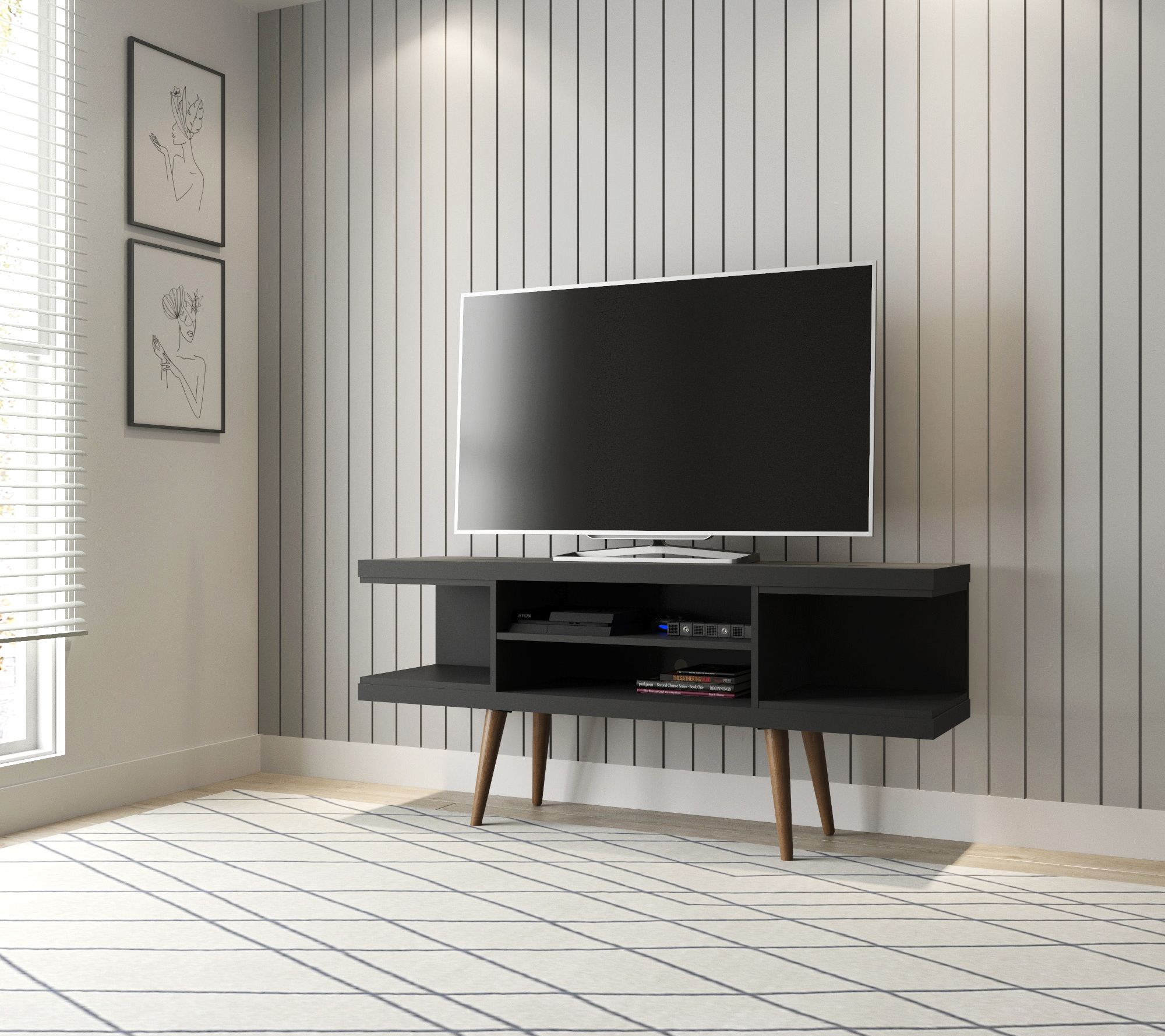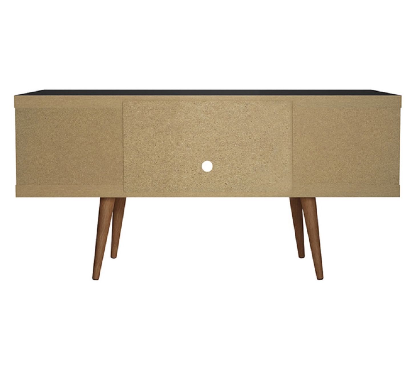 Movie nights and game-day gatherings feel a little more organized and a lot more stylish with this streamlined entertainment hub as the center of your space. Splayed wood legs anchor its mid-century vibe, while open shelving keeps remotes, consoles, and speakers right where you need them. Cords stay neatly out of sight so your living room or bedroom always looks pulled together. From Manhattan Comfort.