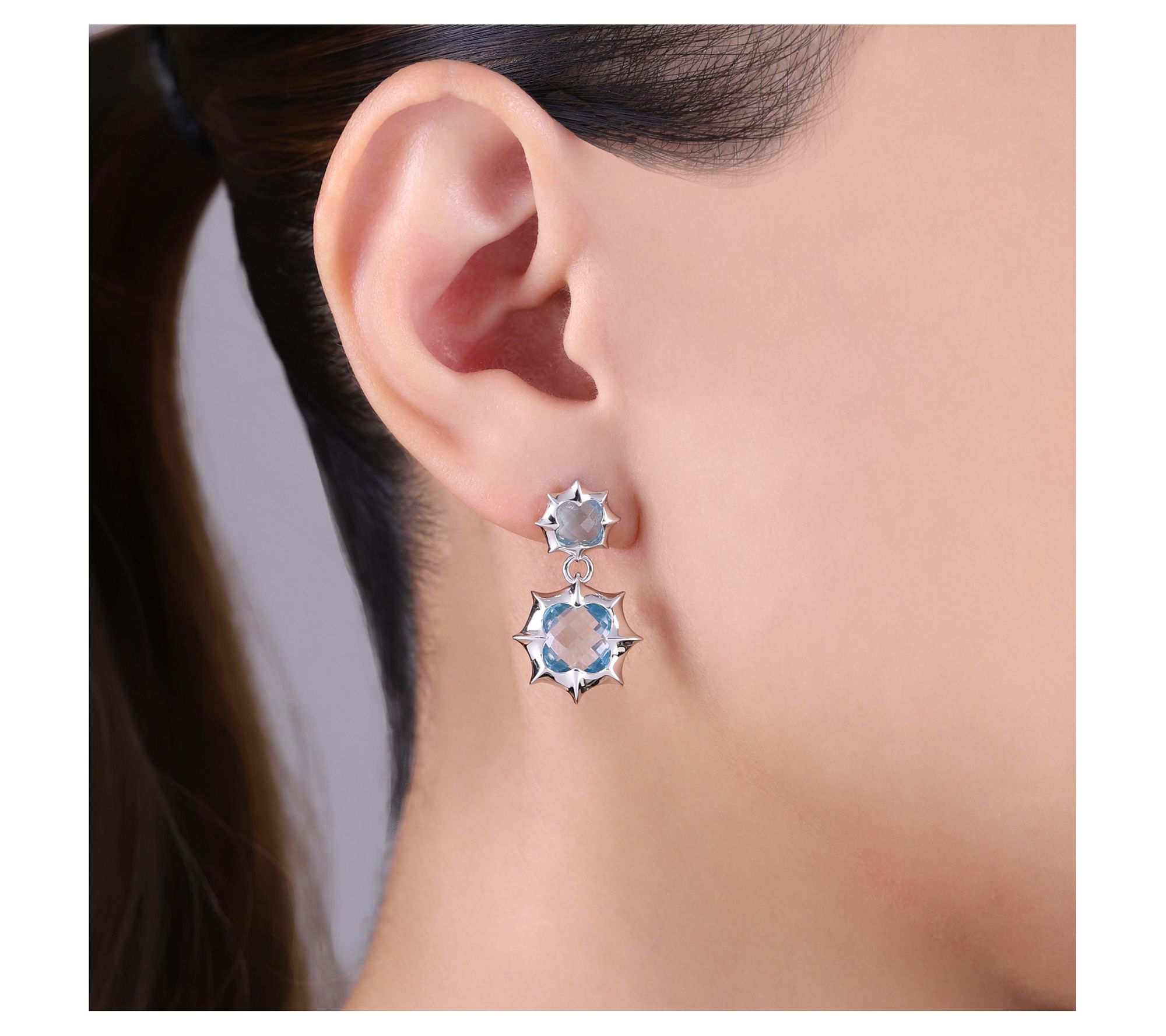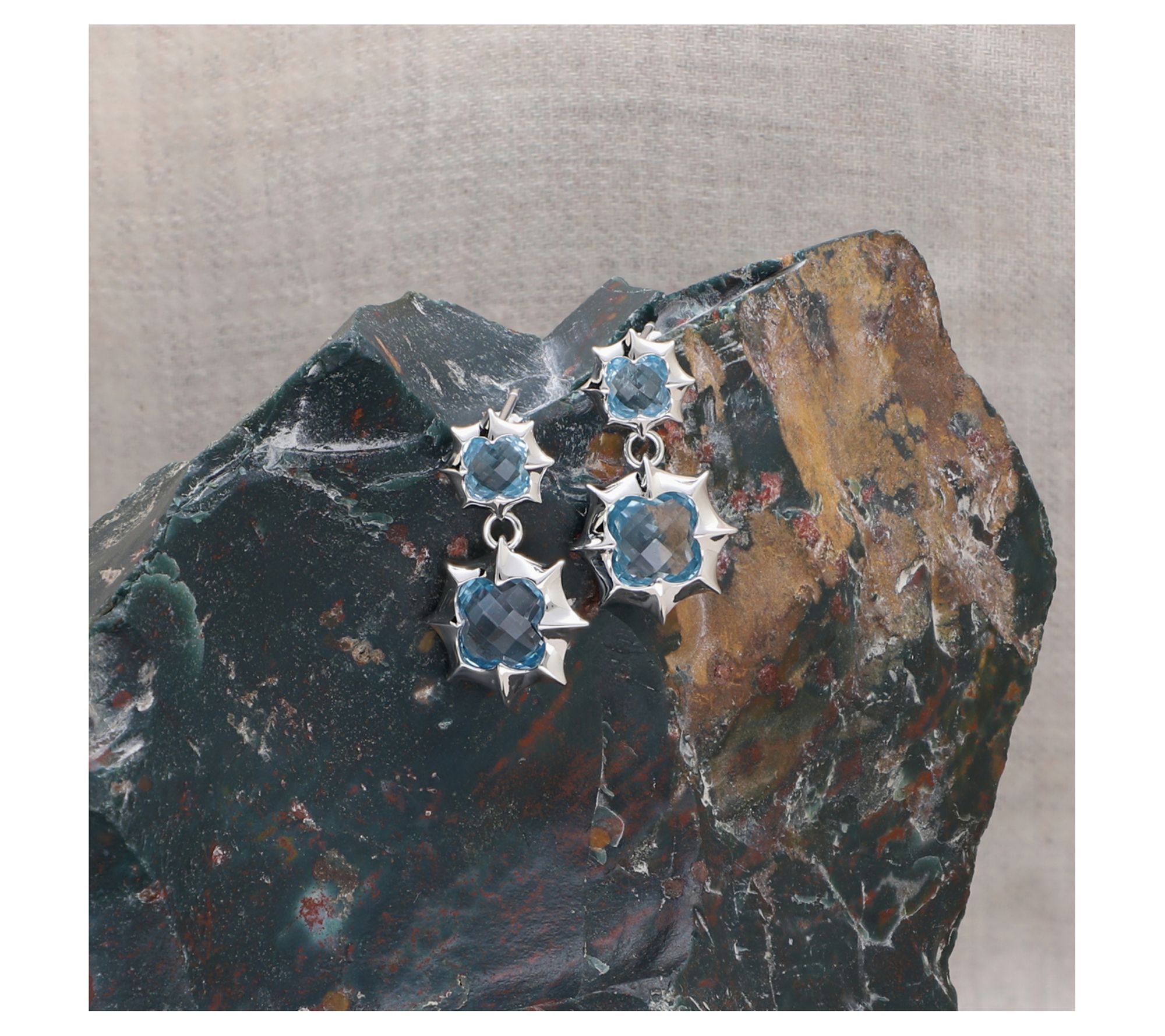 Featuring pineapple-cut sky blue topaz stones set in high-polished spiked frames, these earrings offer movement and a fresh accessory perspective. From Margo Manhattan.