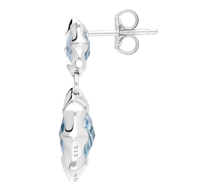 • Pineapple-cut, bezel-set sky blue topaz; polished spiked frames; dangling design