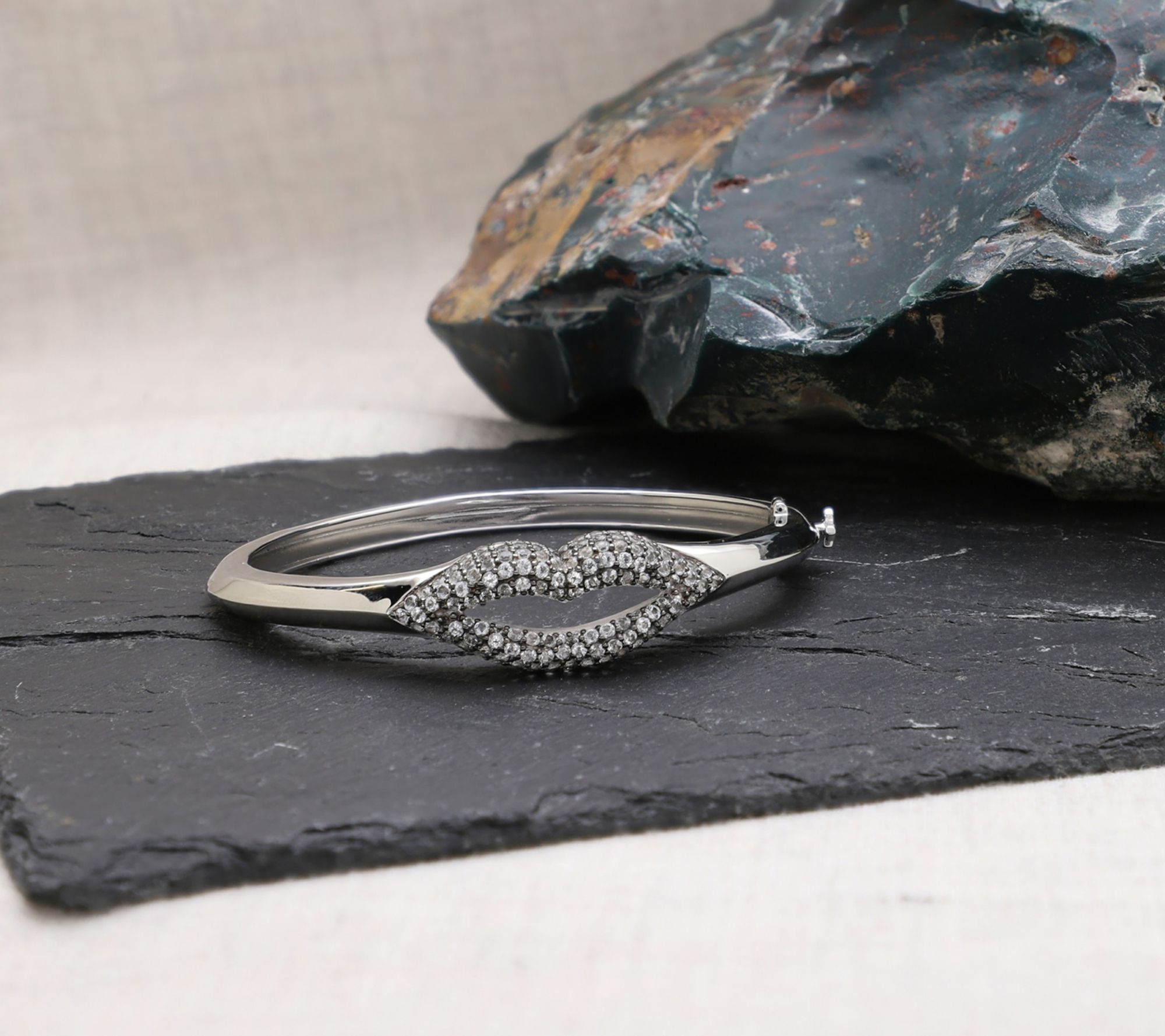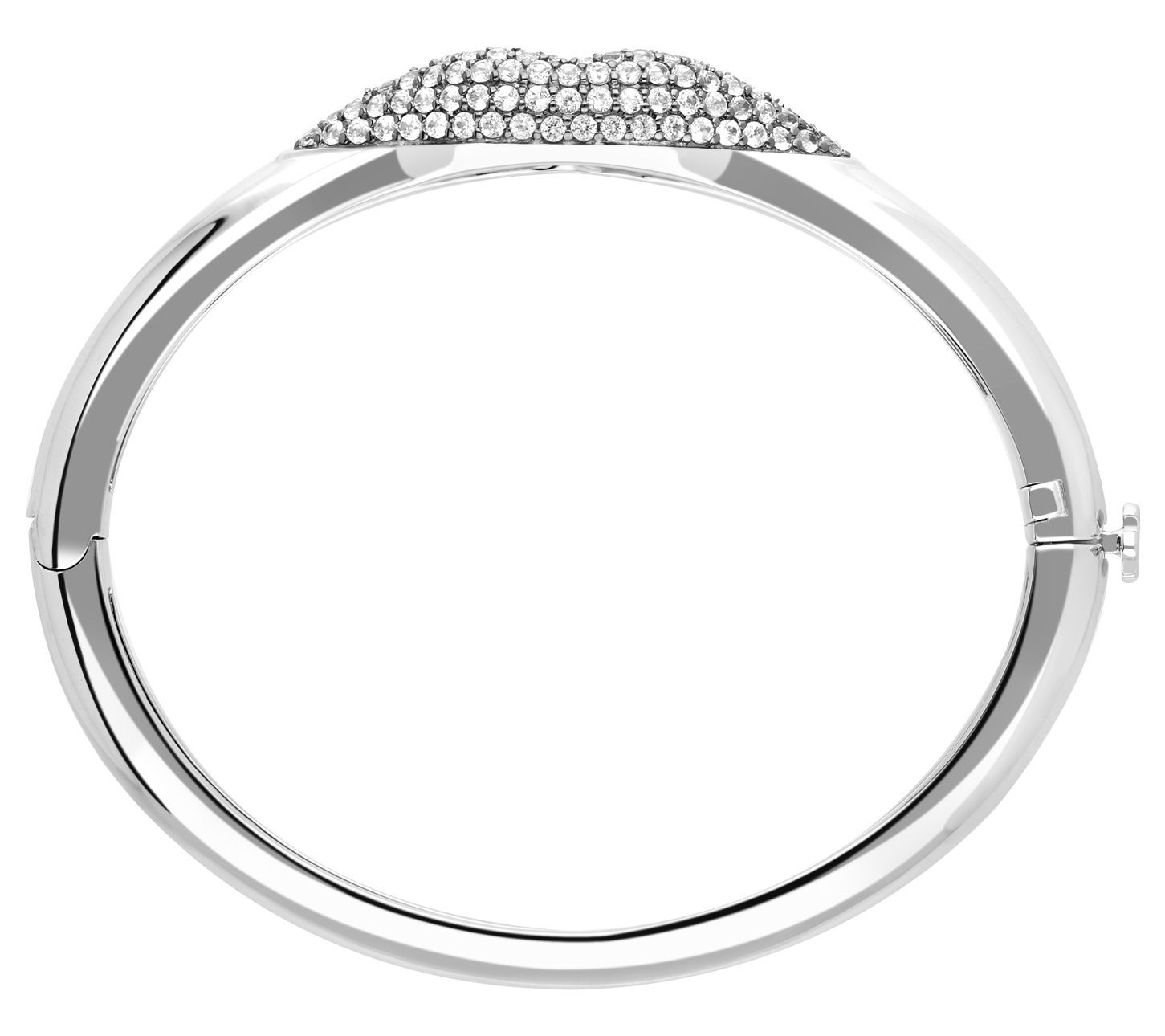 Kiss, kiss. Flush with white topaz and blackened prongs, this high-polish lips bangle is a true statement piece. From Margo Manhattan.