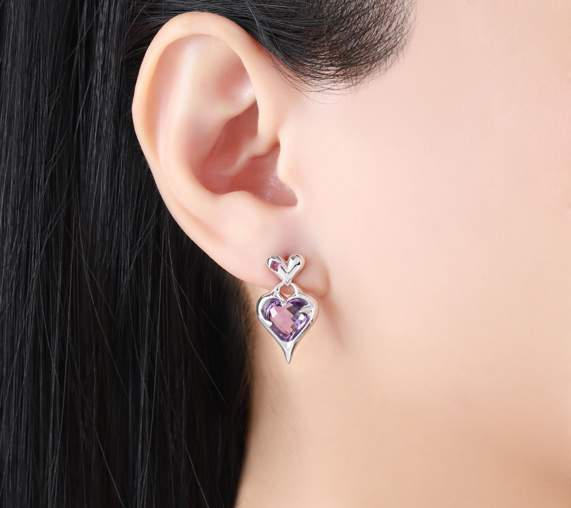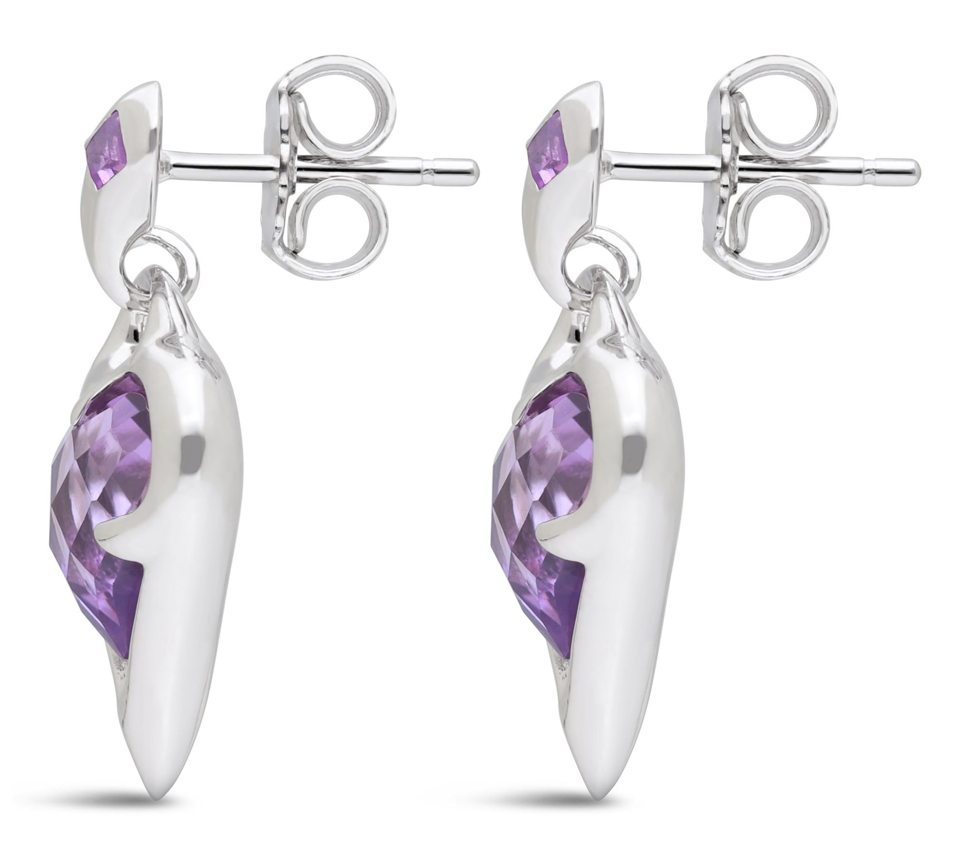 Let your style shine with these dangle earrings, showcasing a radiant pineapple-cut heart amethyst paired with a bezel-set square amethyst atop a high-polished sterling silver frame. Whether you're dressing up for a special dinner or adding a pop of color to your everyday look, these earrings offer a captivating touch of sacred love. From Margo Manhattan.