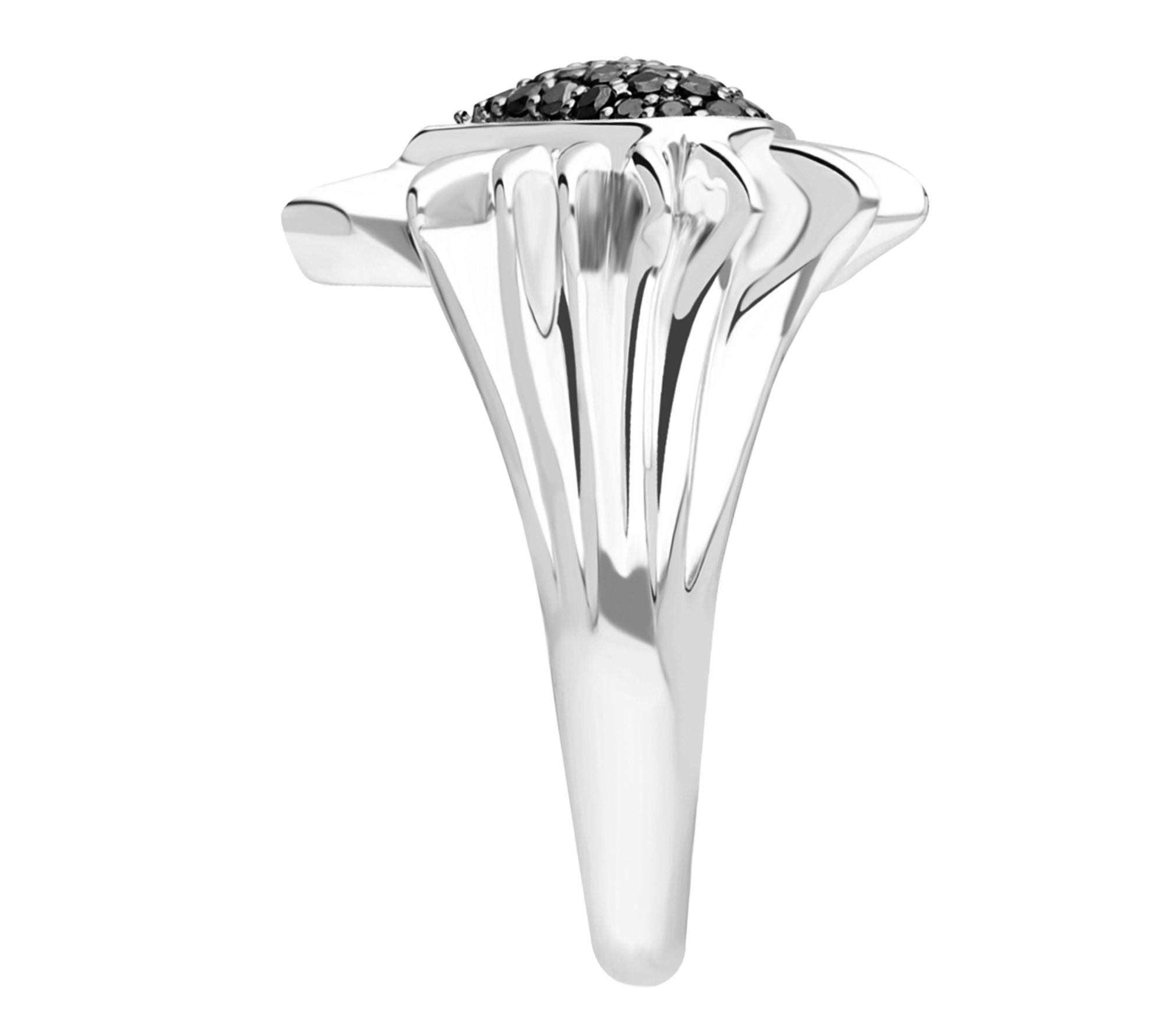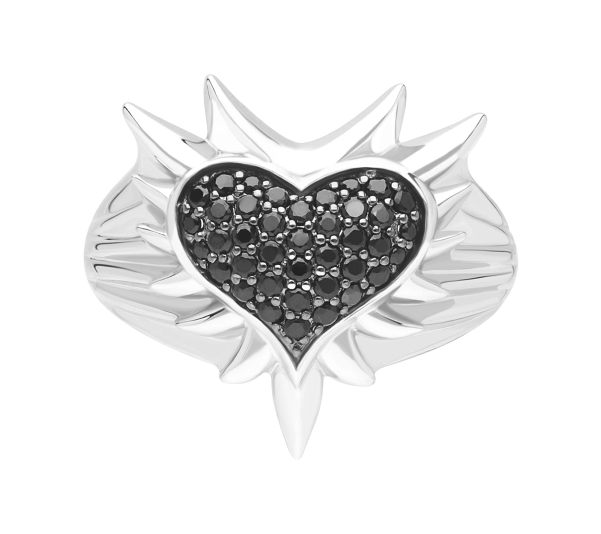 Cocktail ring with round-cut pave-set black spinel stones in heart-shaped center; spiked frame; polished finish