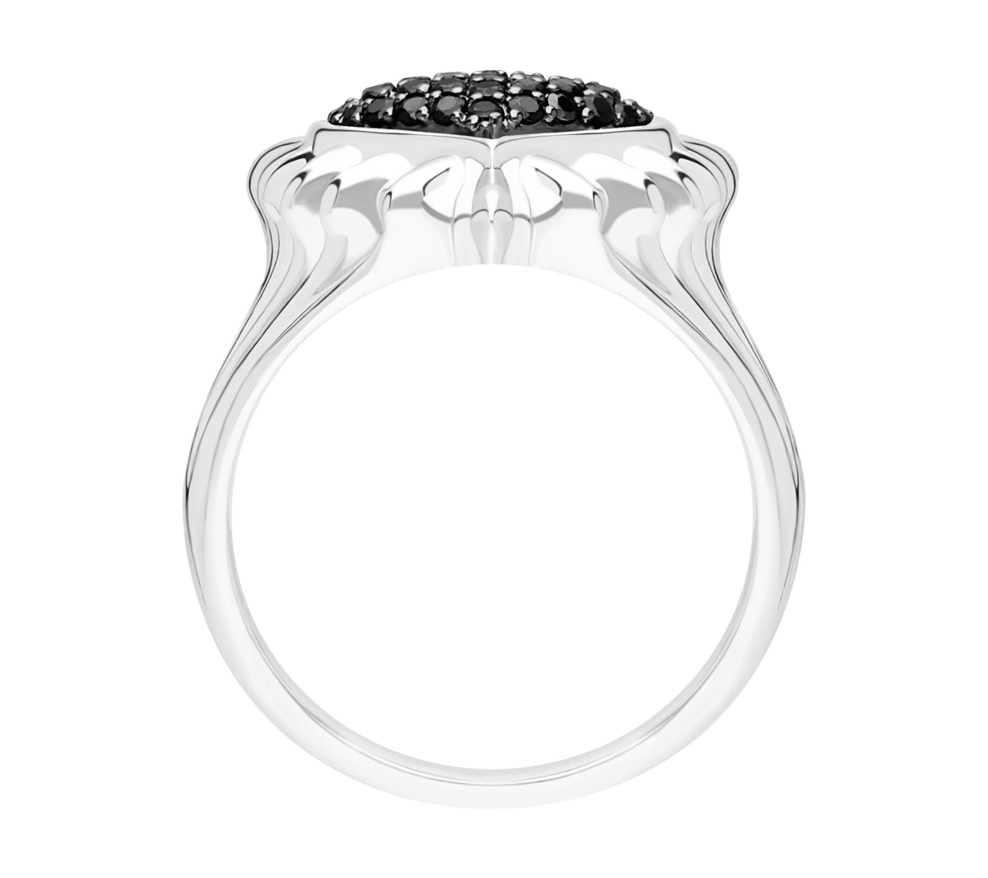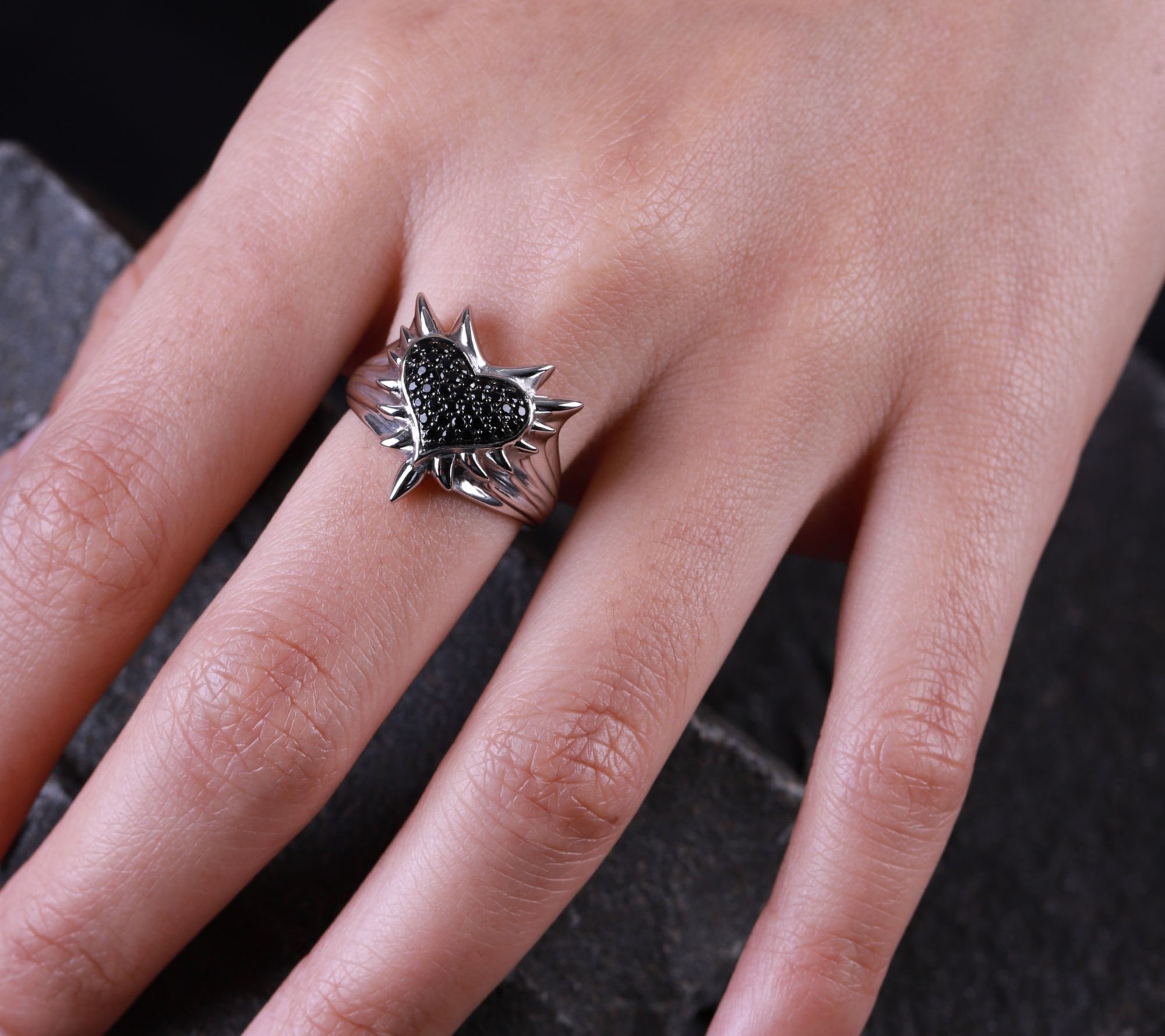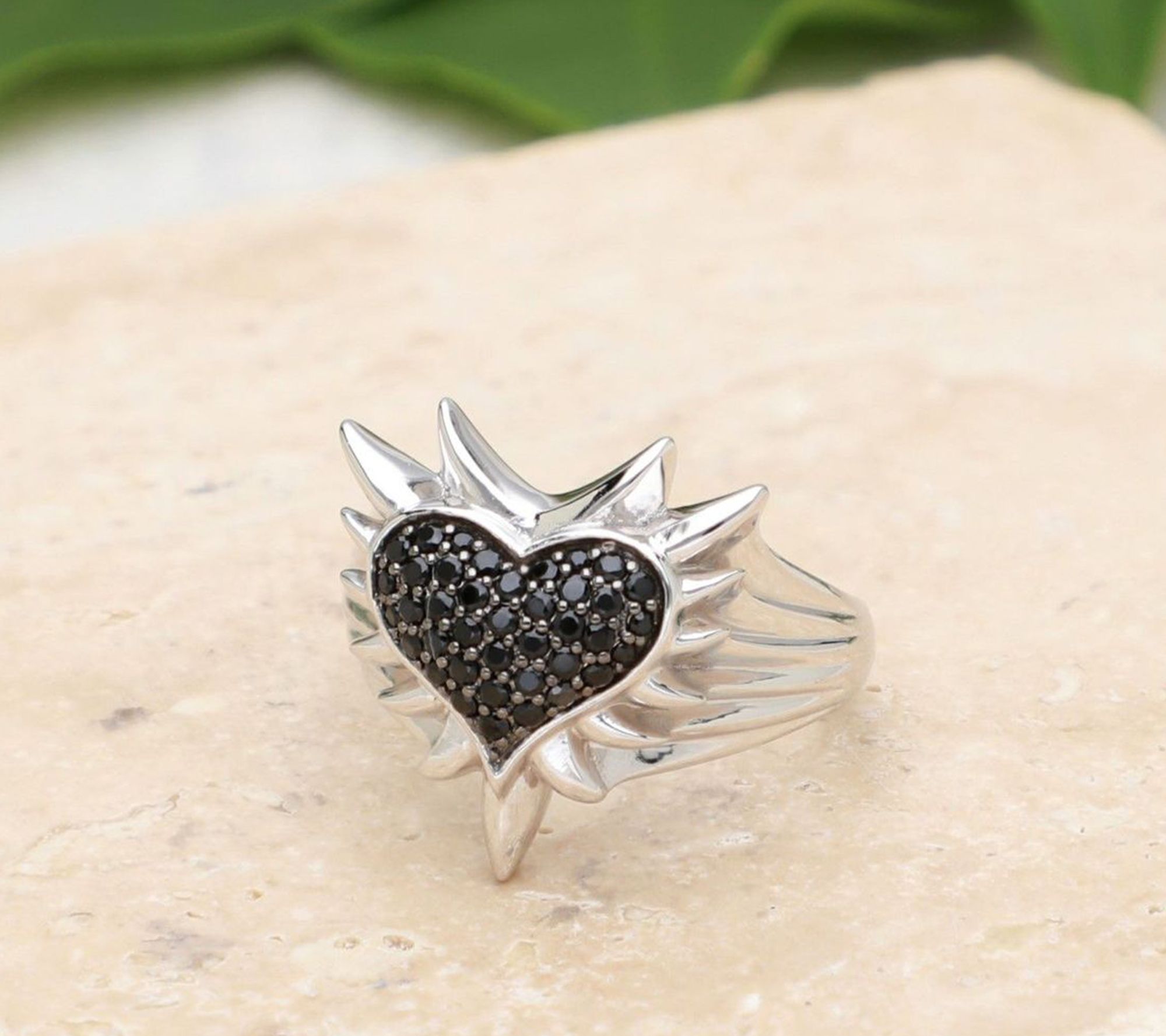 Fall in love with this black spinel cocktail ring with a polished finish and spiky design that adds an edgy heartfelt touch to your look. From Margo Manhattan.