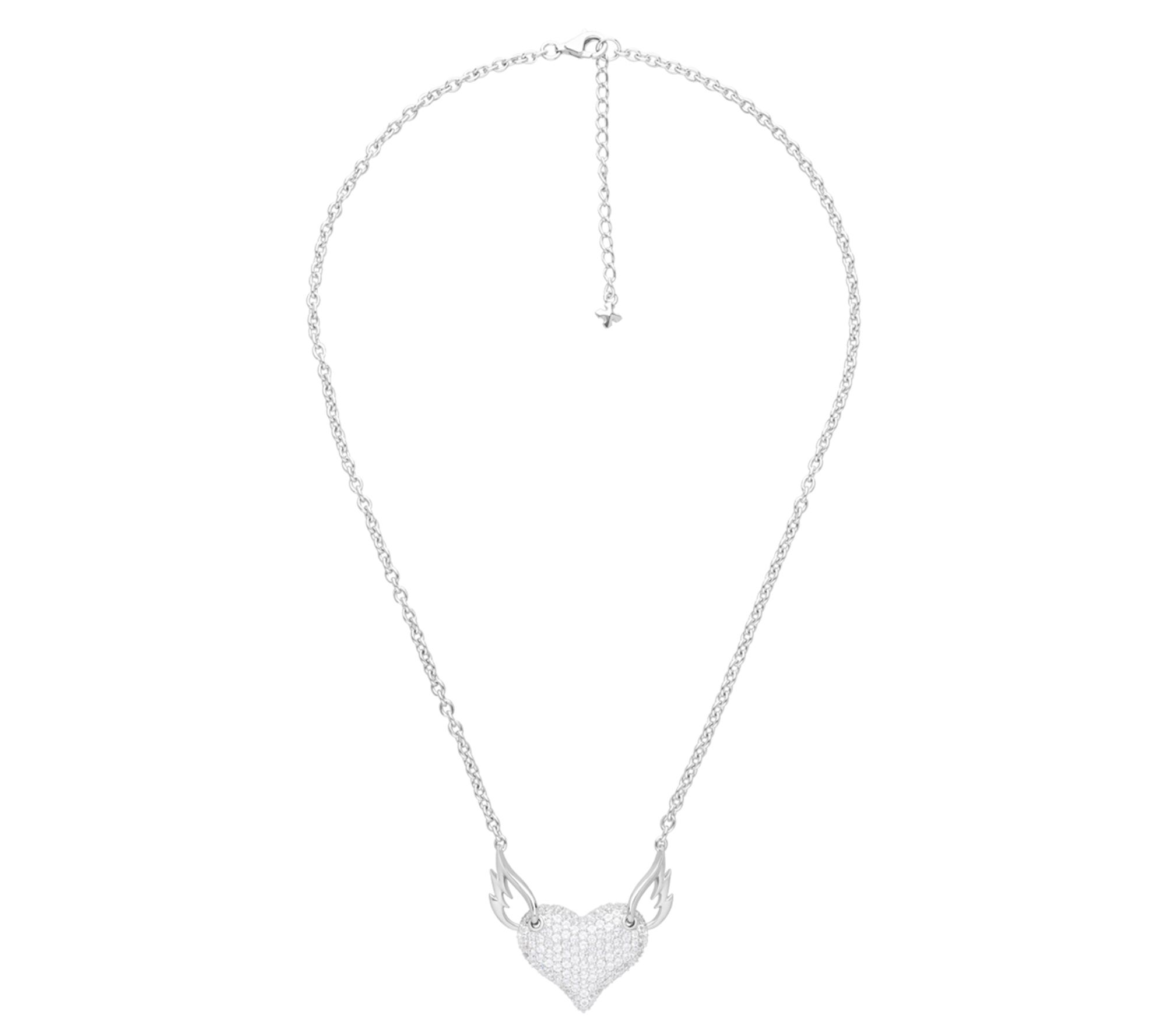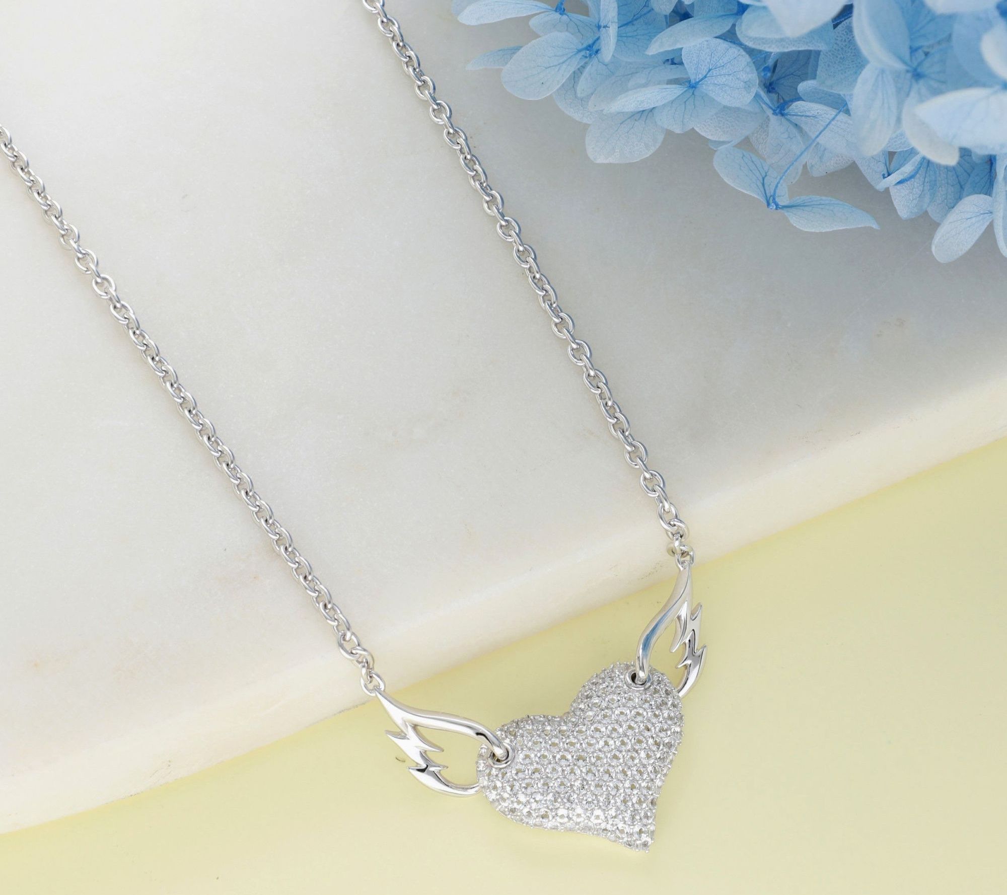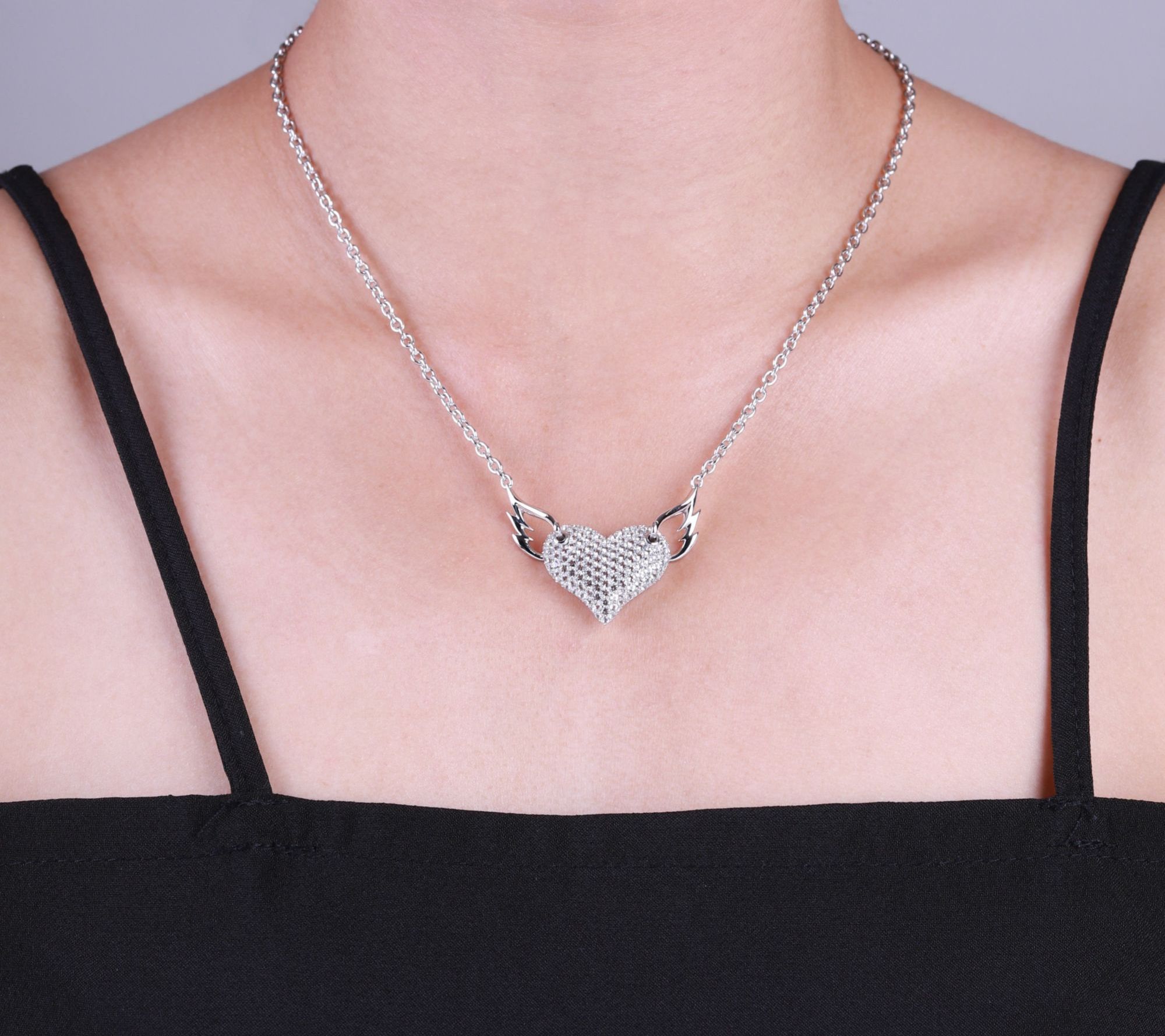 - Winged heart pendant with round-cut, pave-set white topaz or black spinel gemstones; oval-link chain