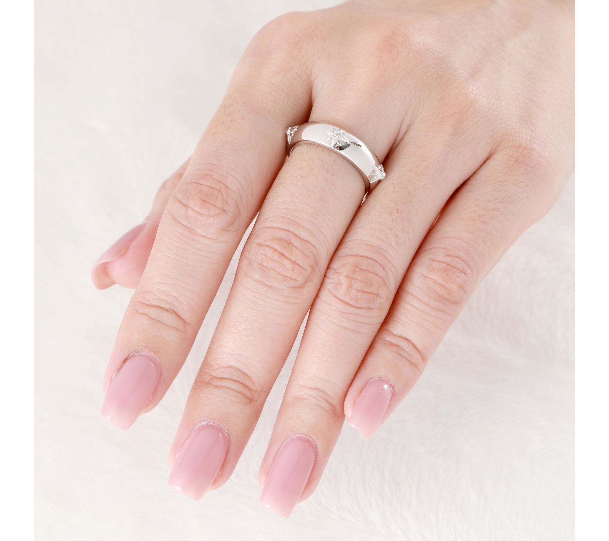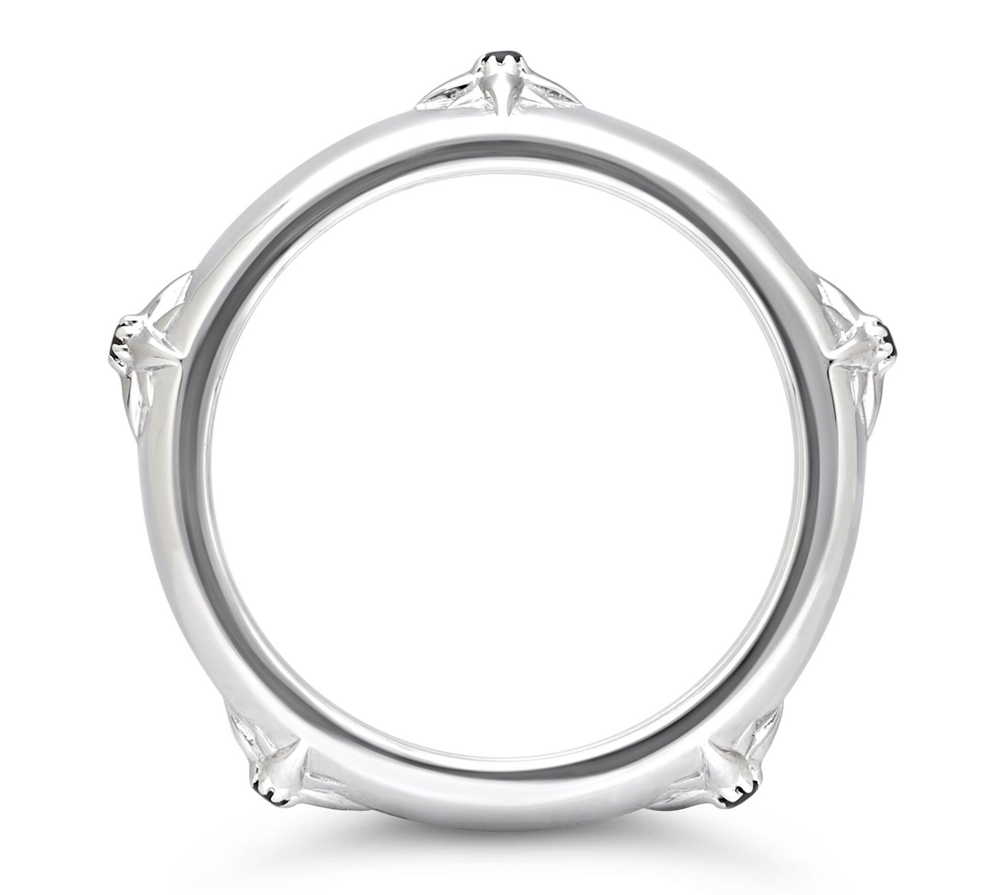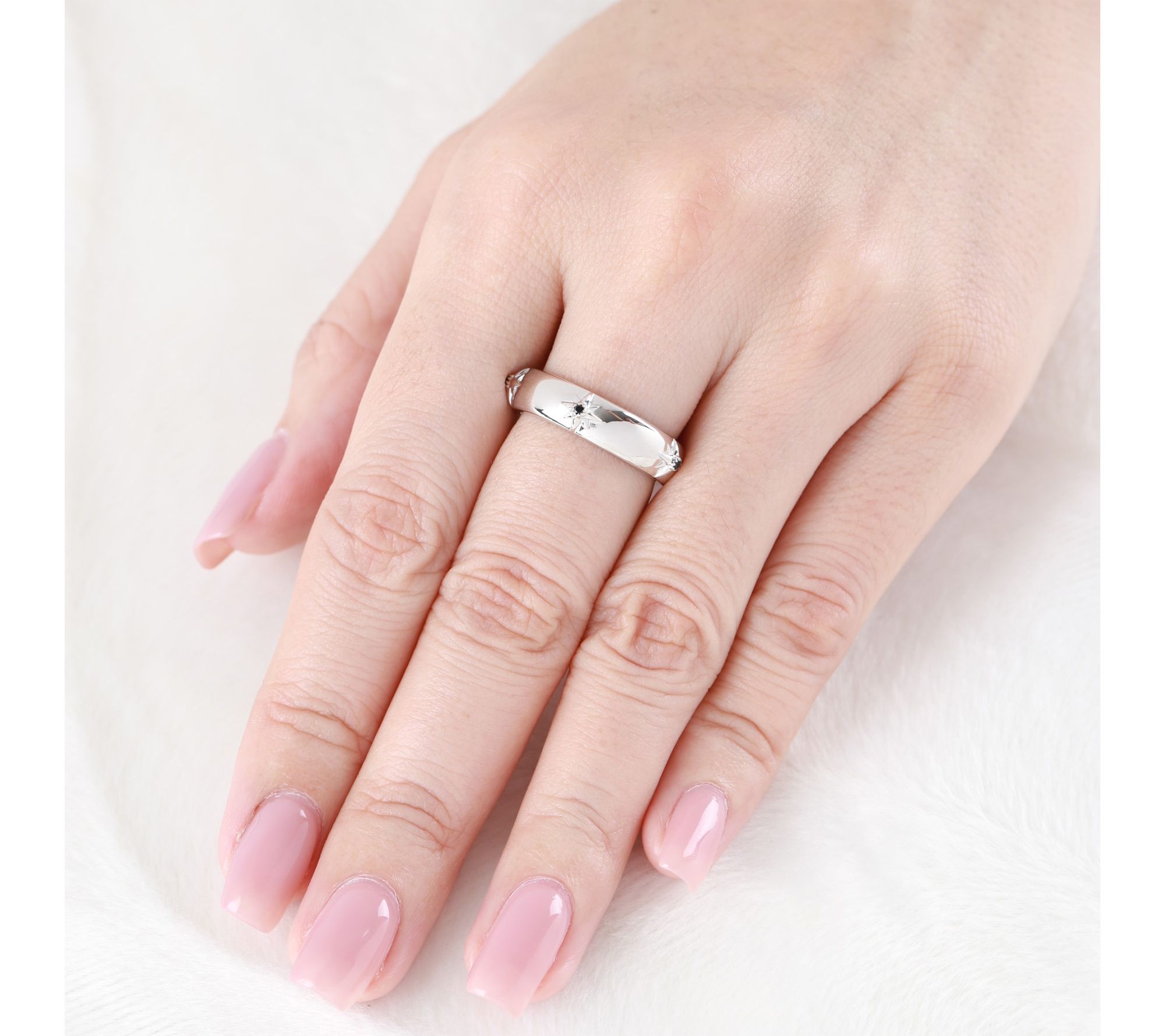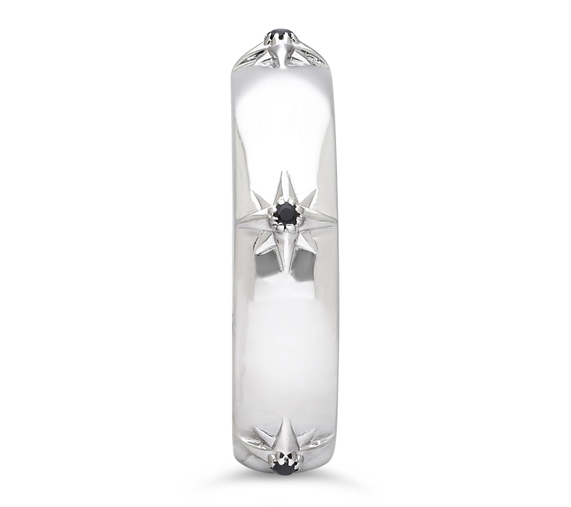 Starburst design with choice of black spinel or white topaz stones; high-polished finish; band style
