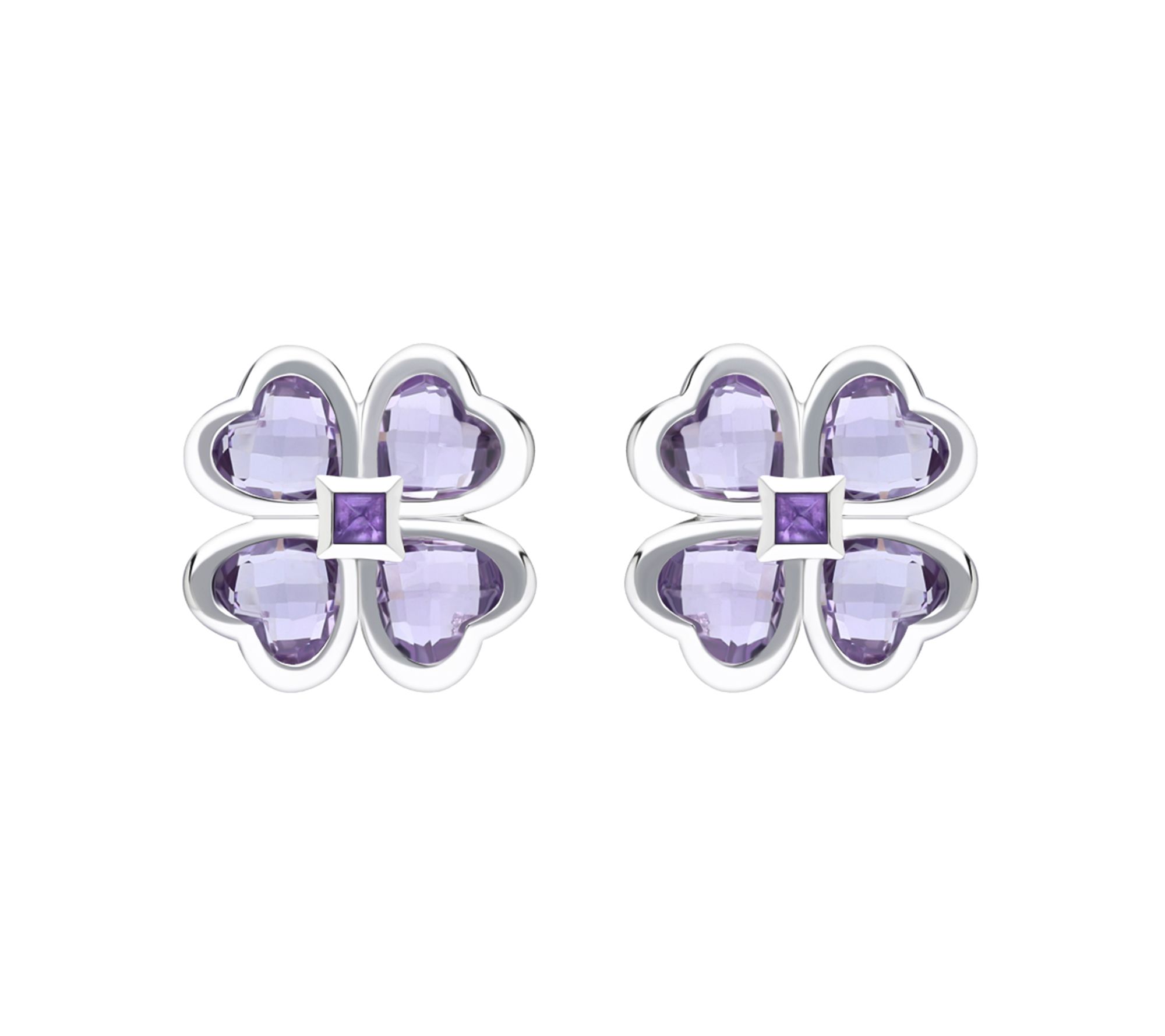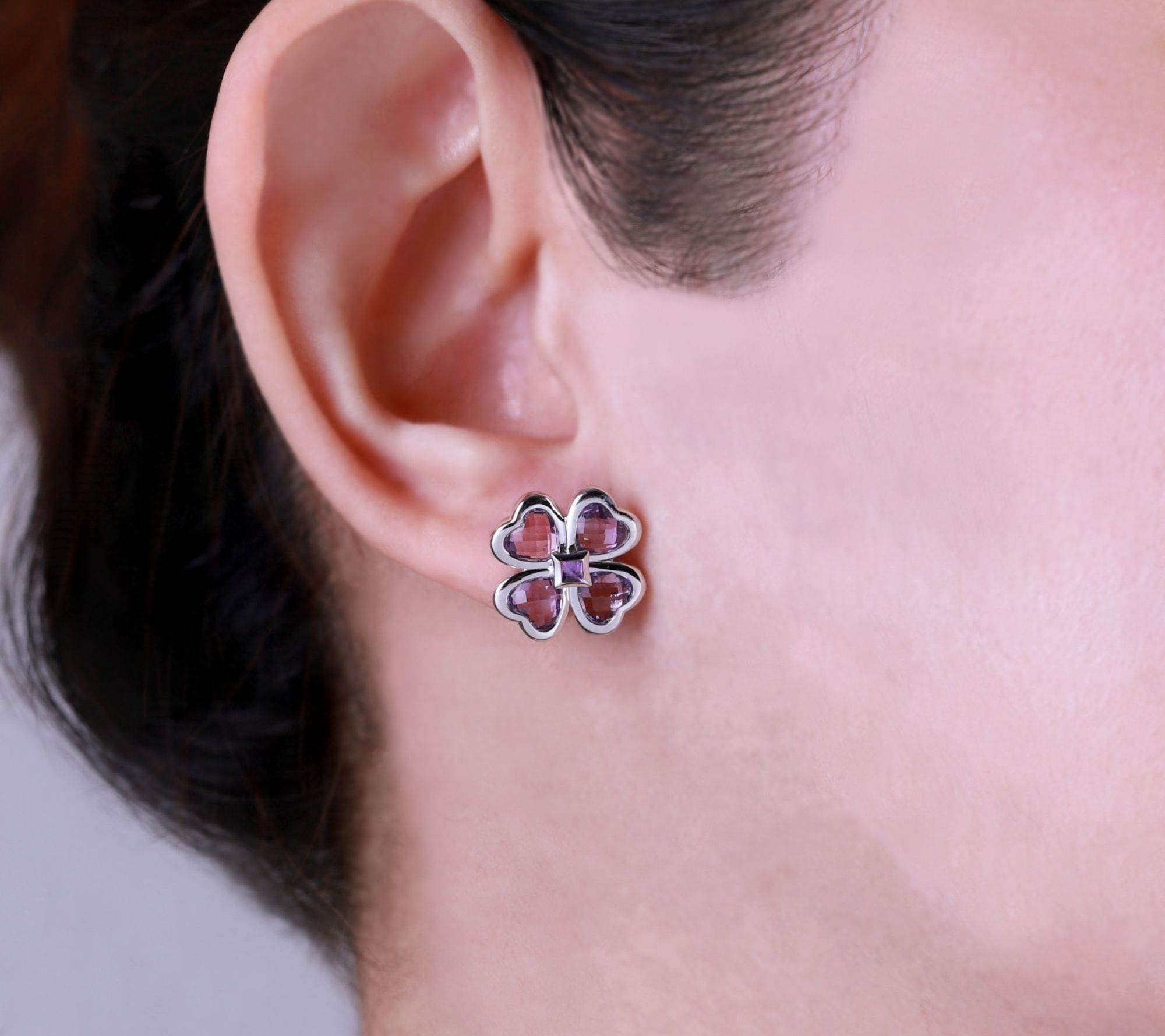 • Stud earrings with four heart-shaped pink amethyst stones that form a clover; square bezel-set purple amethyst in center; polished finish