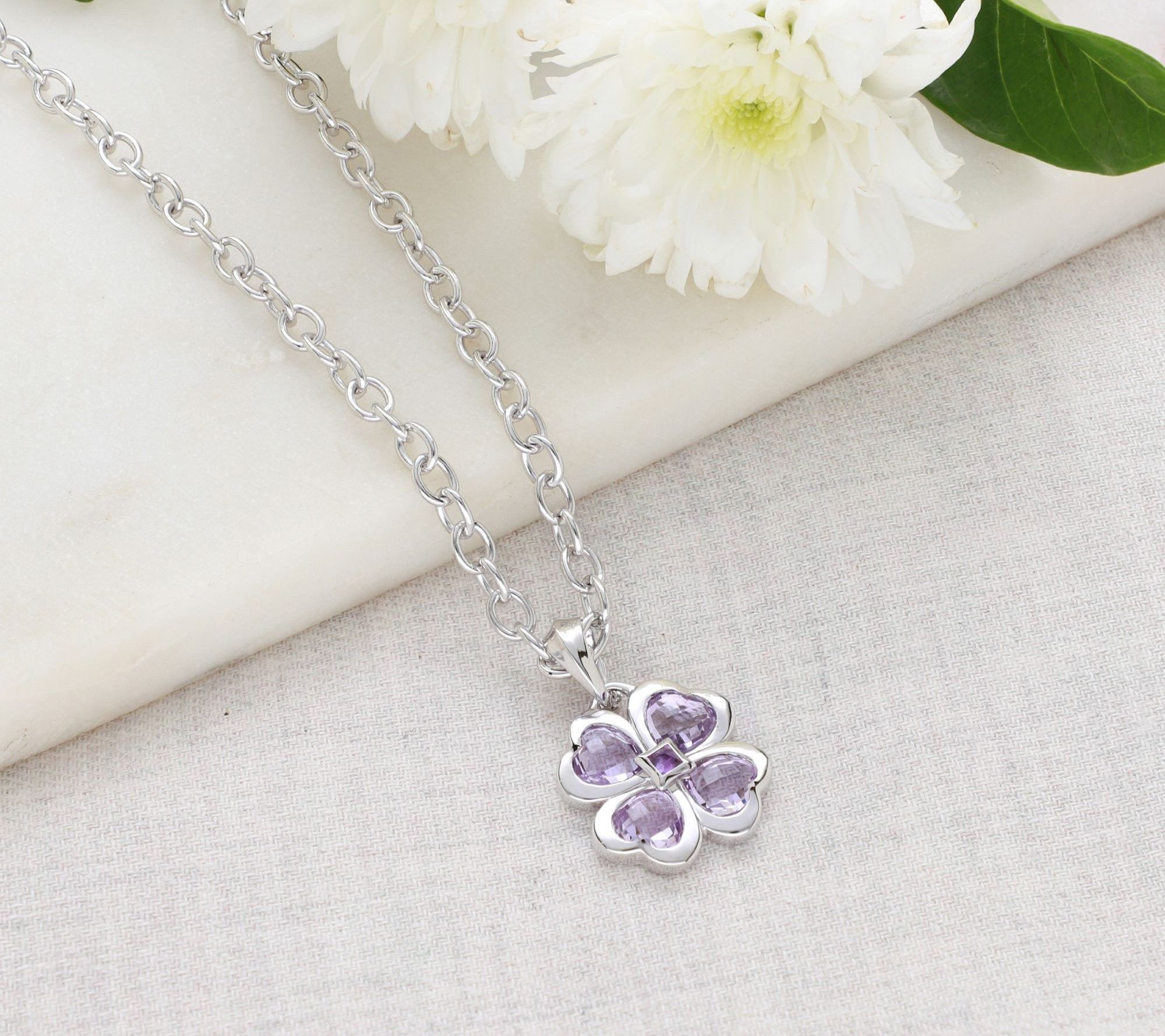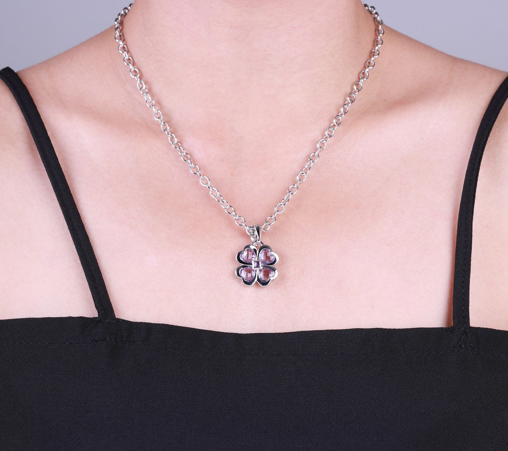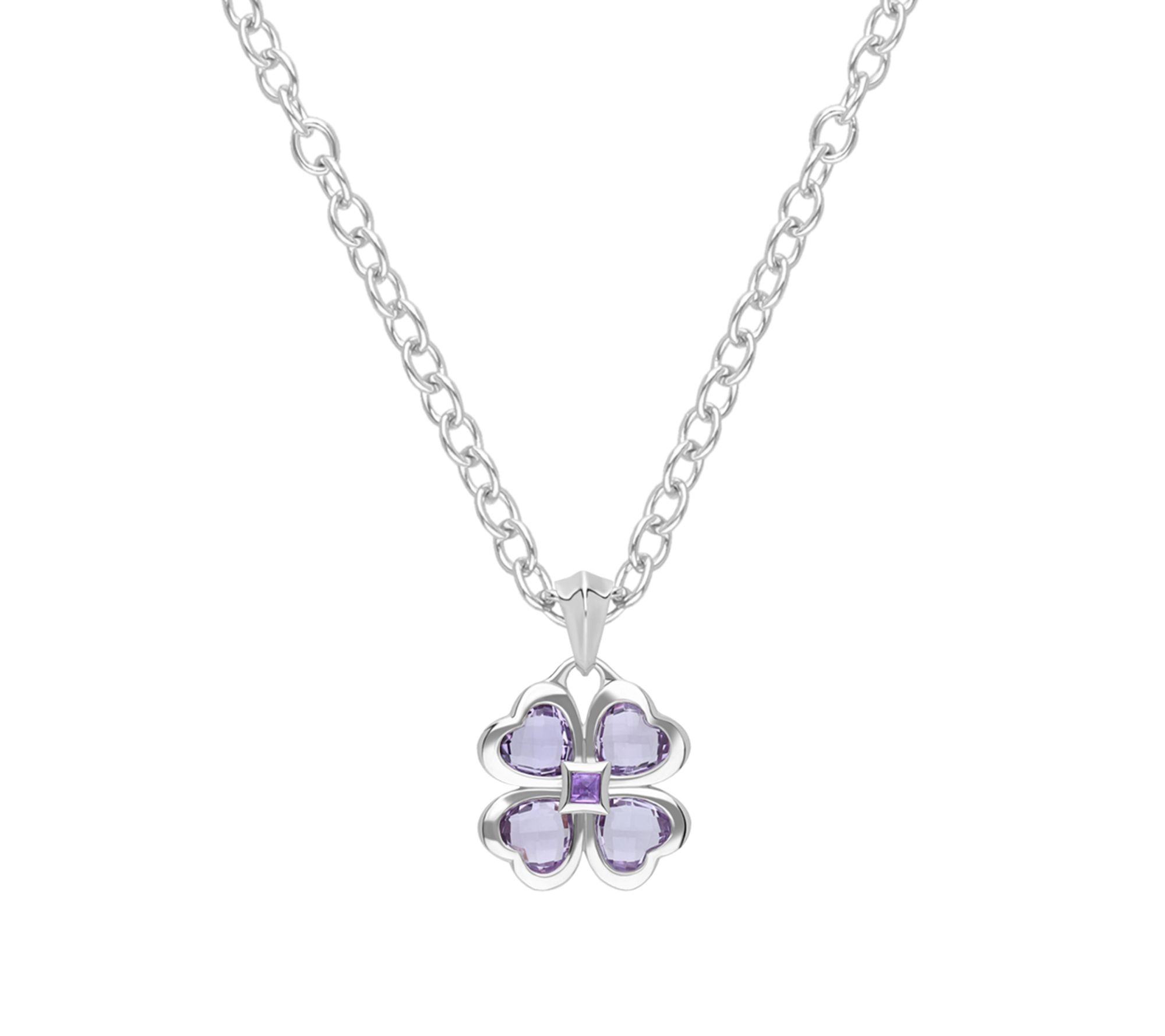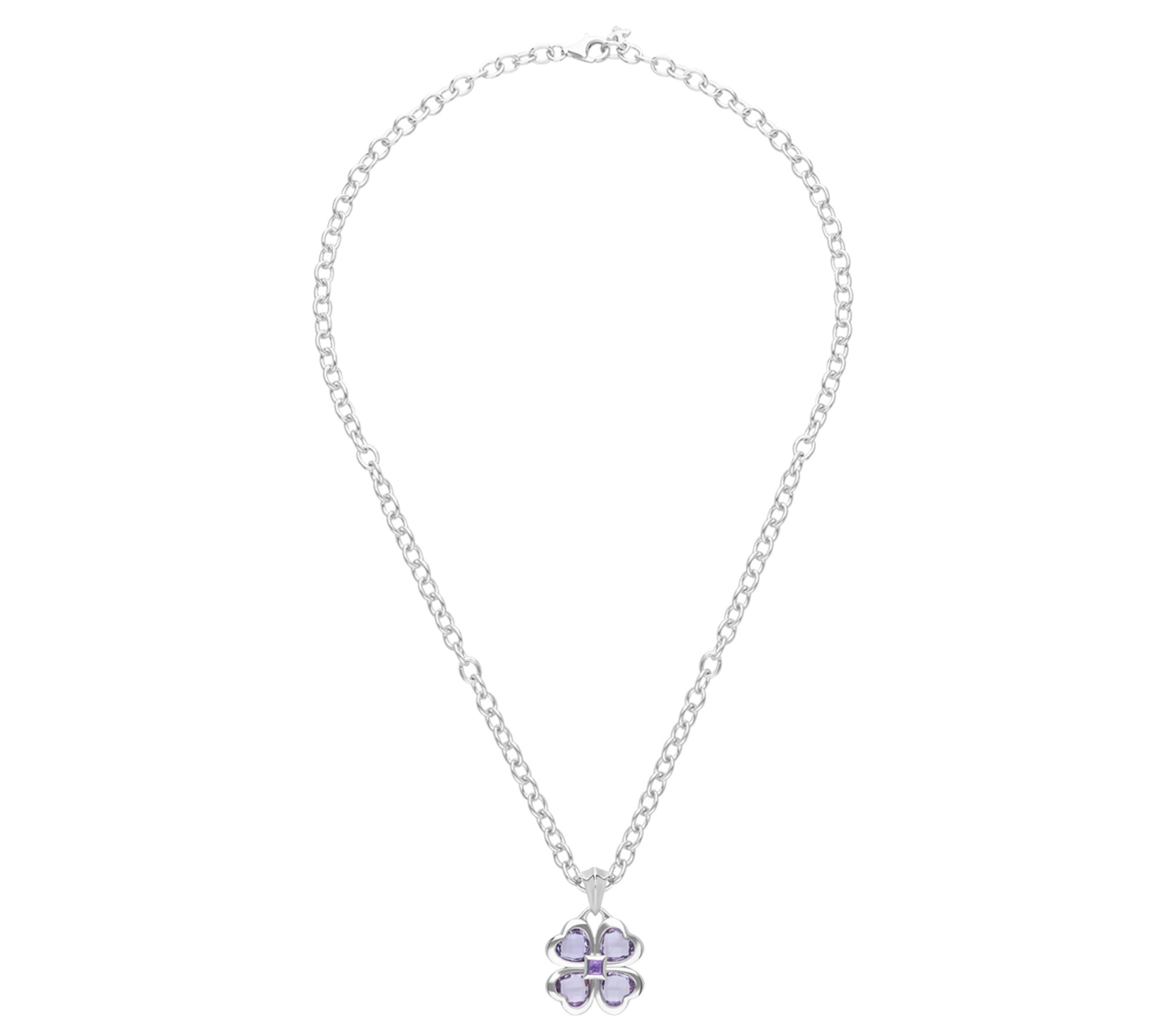 - Four heart-shaped faceted bezel-set pink amethyst stones form a clover; square bezel-set purple amethyst center; fluted high-polish bale; oval link chain