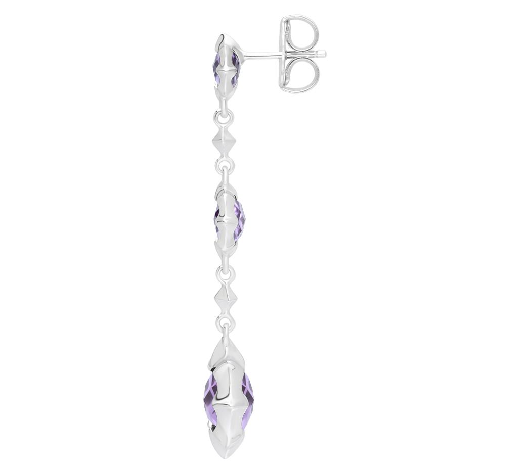 • Three graduated pineapple-cut, clover-shaped and bezel-set amethyst stone dangles; links allow for movement