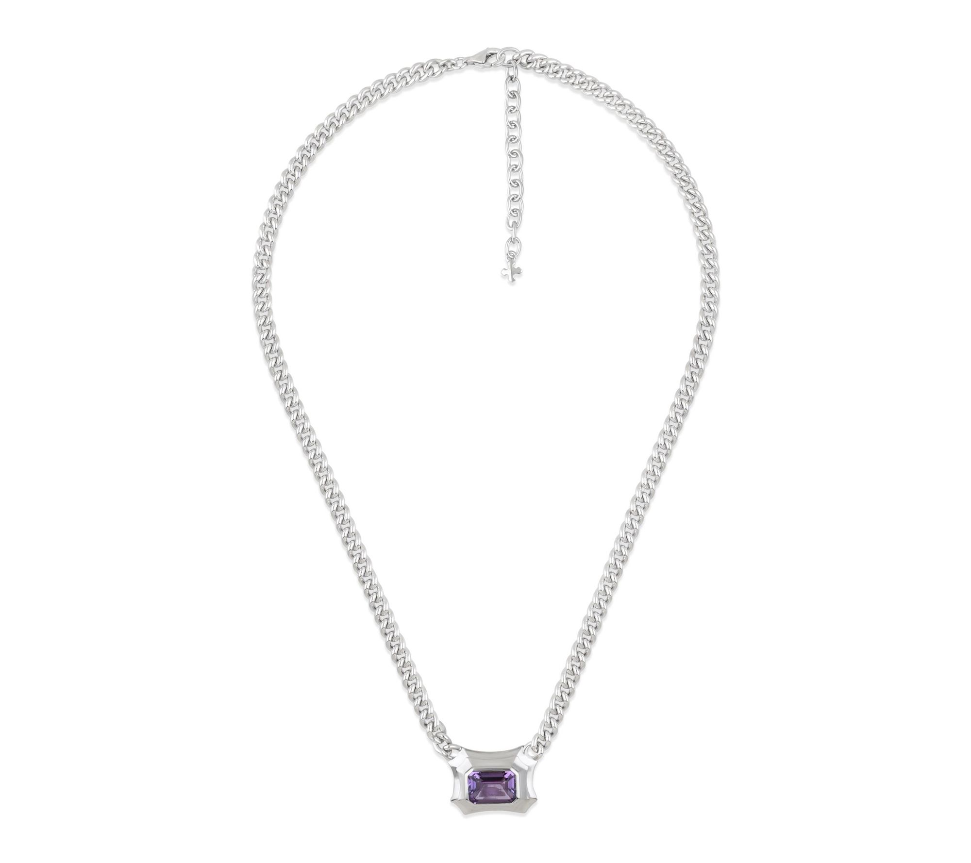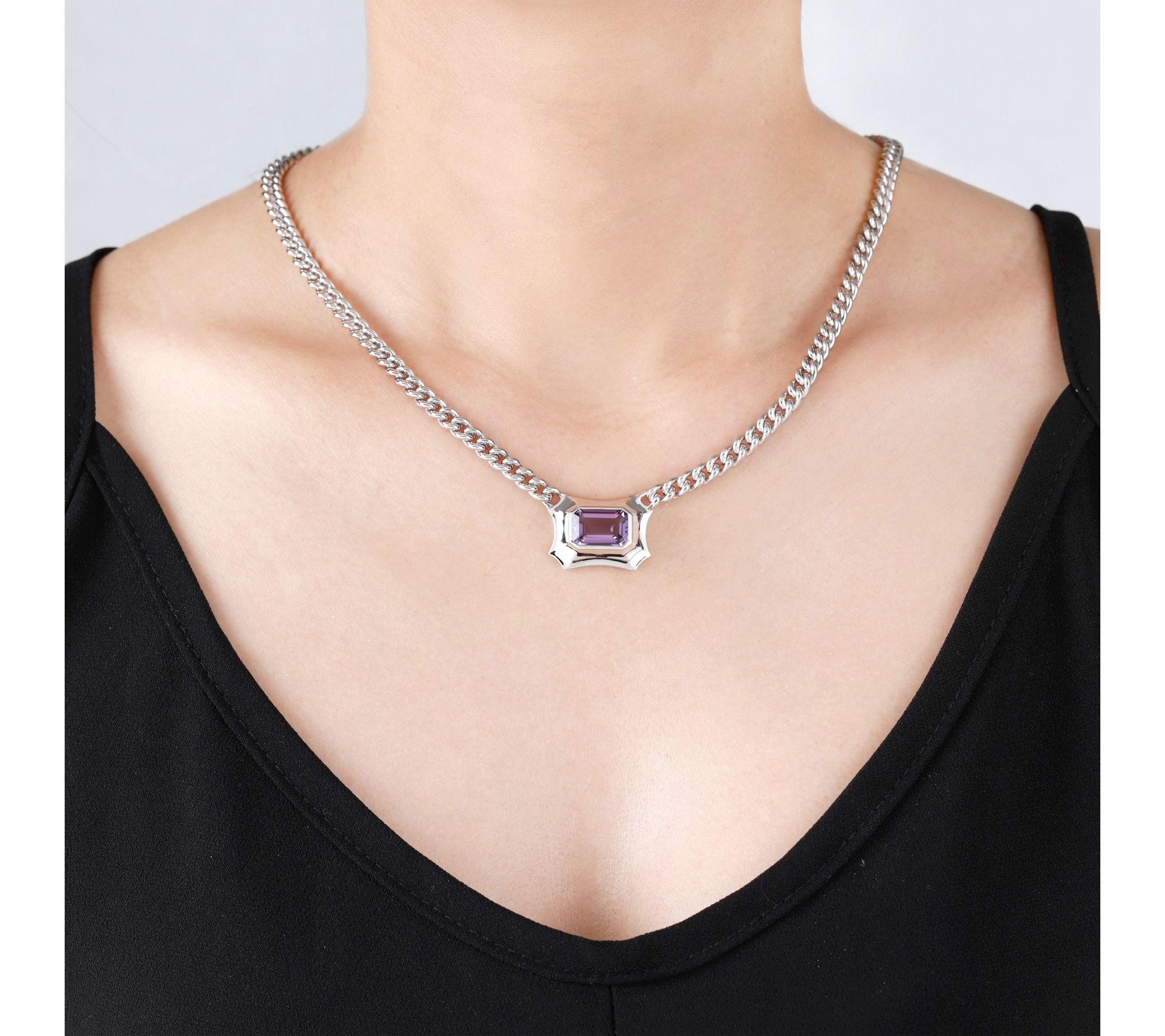 Radiating sophisticated beauty, this sterling silver necklace features a bold octagon-cut amethyst set in a dazzling high-polished Violetta design. The chunky curb chain and stepped bezel setting make it a standout accessory for glamorous evenings or special celebrations, adding a touch of color and artistry to every look. From Margo Manhattan.