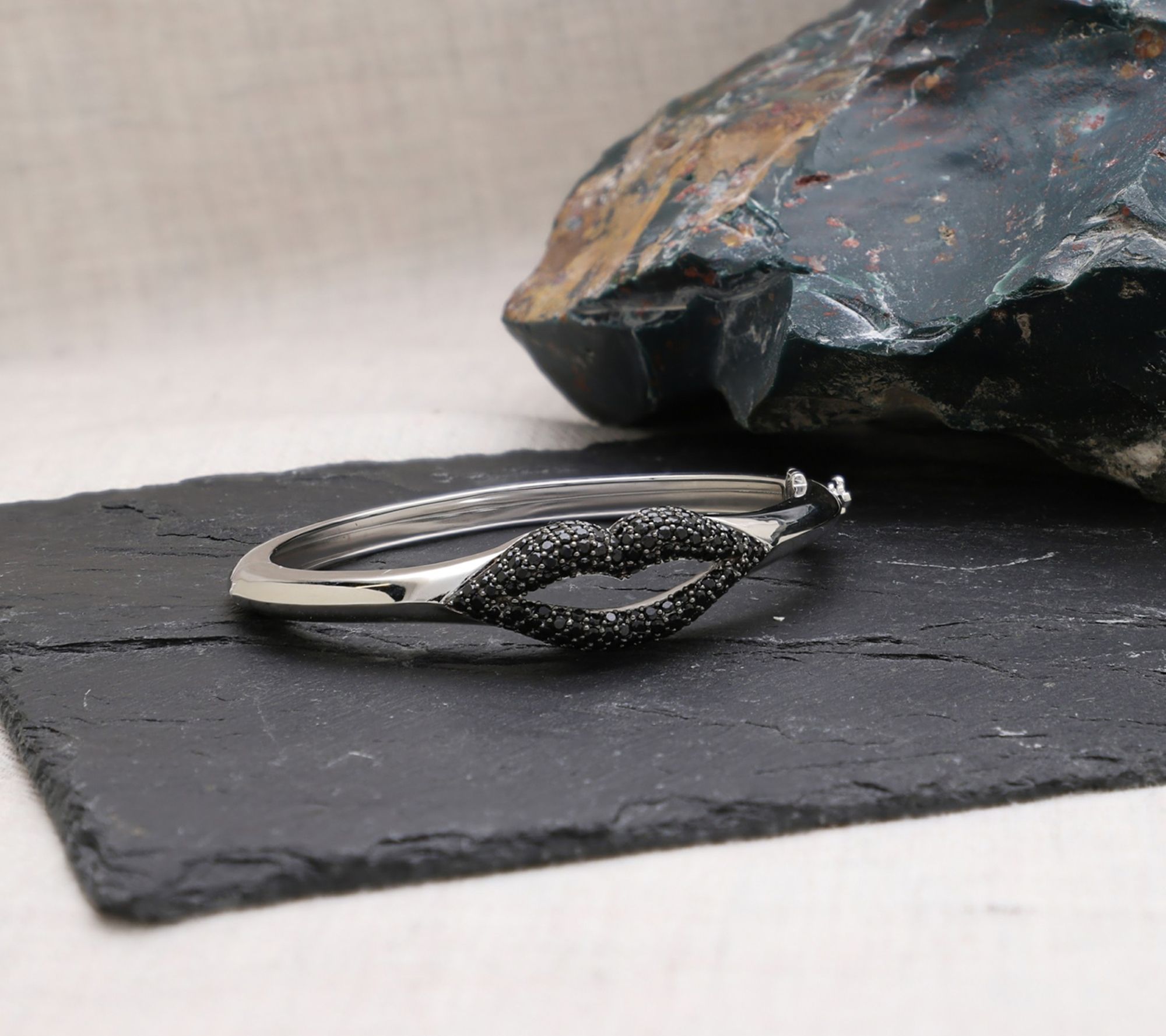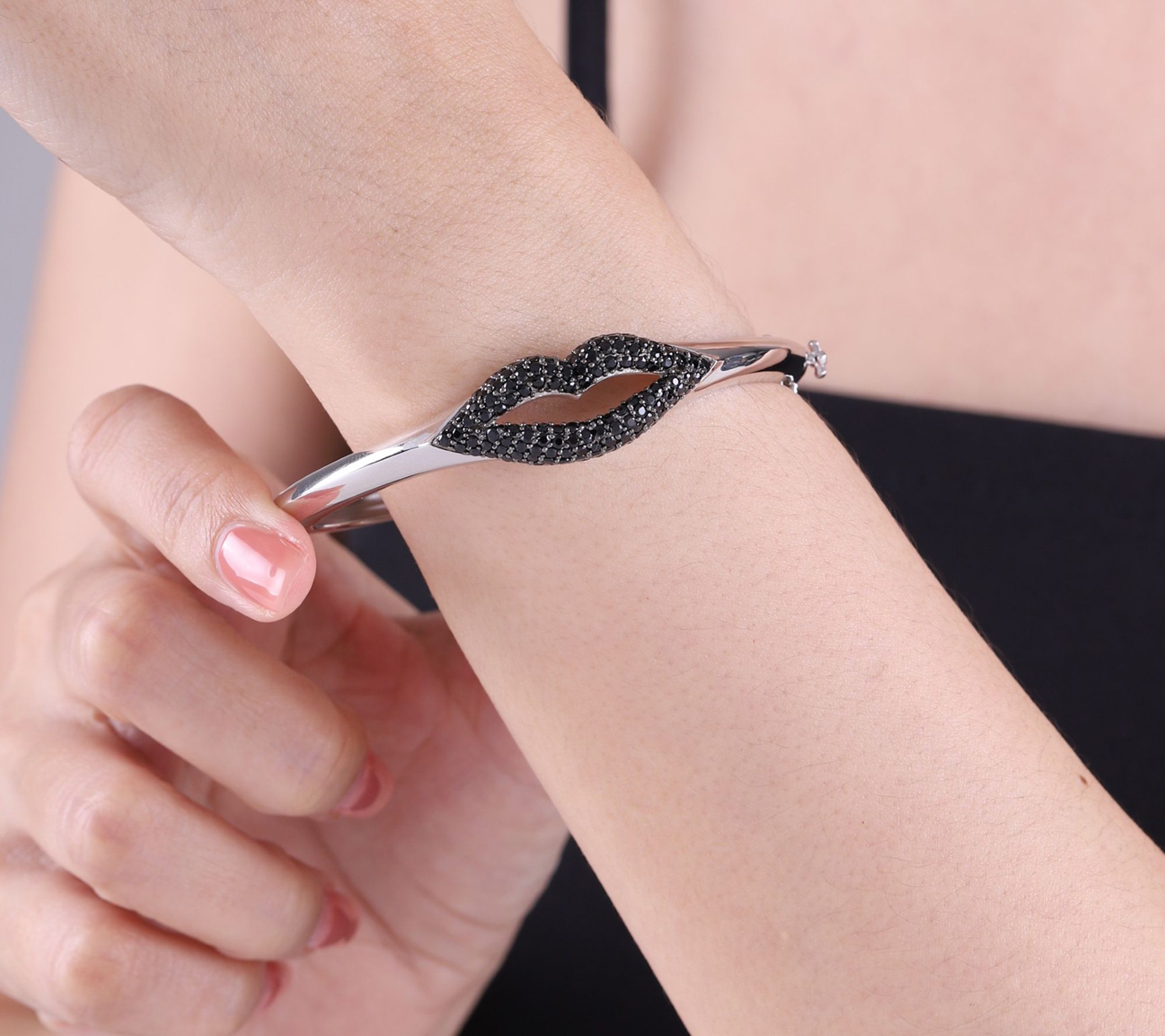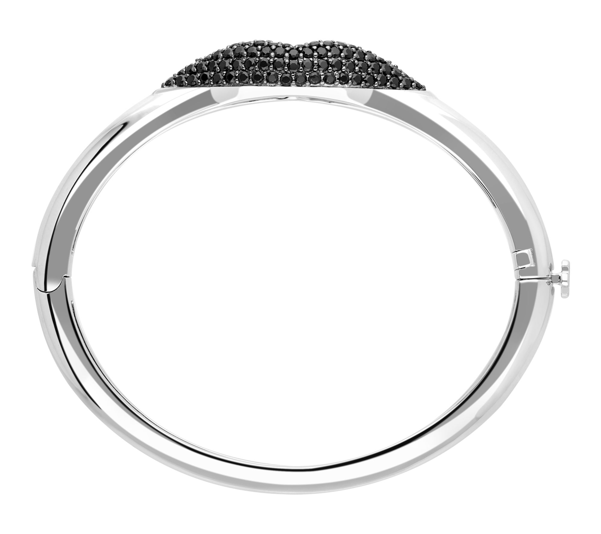 Kiss, kiss. Flush with black spinel and blackened prongs, this high-polish lips bangle is a true statement piece. From Margo Manhattan.