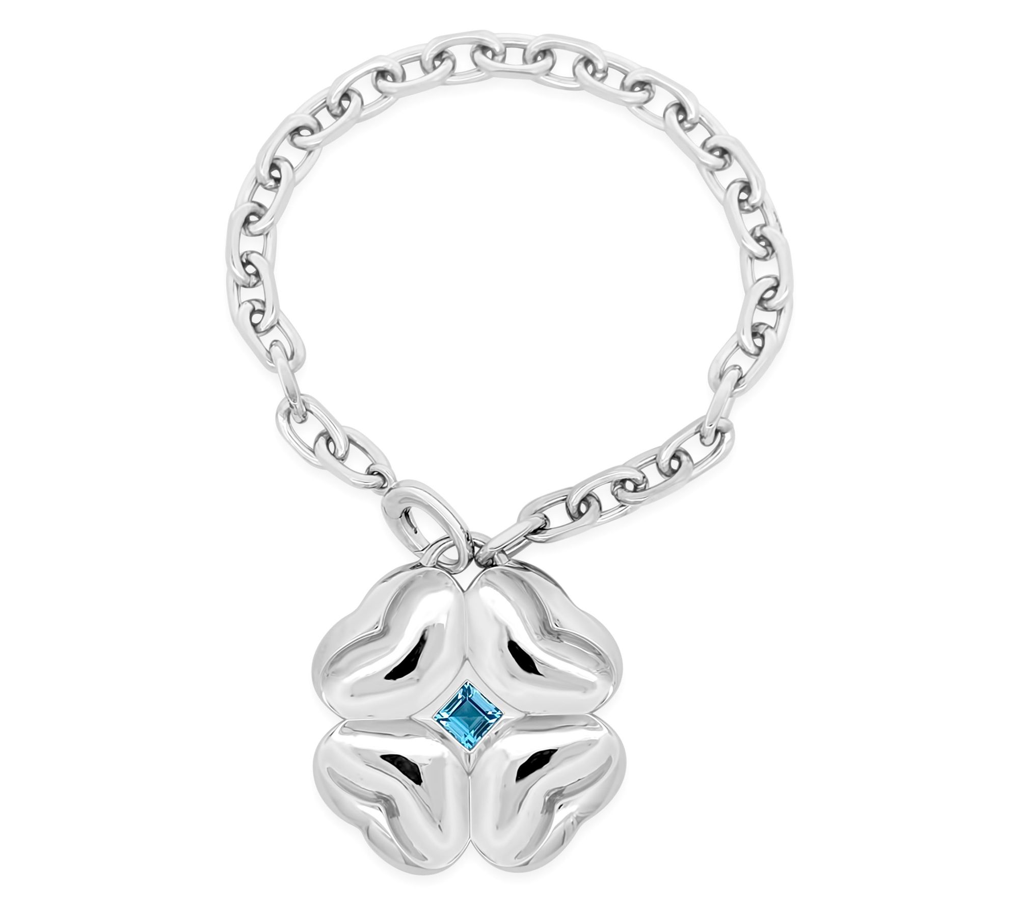 Cable link chain; flower charm with square, bezel-set Swiss blue topaz gemstone