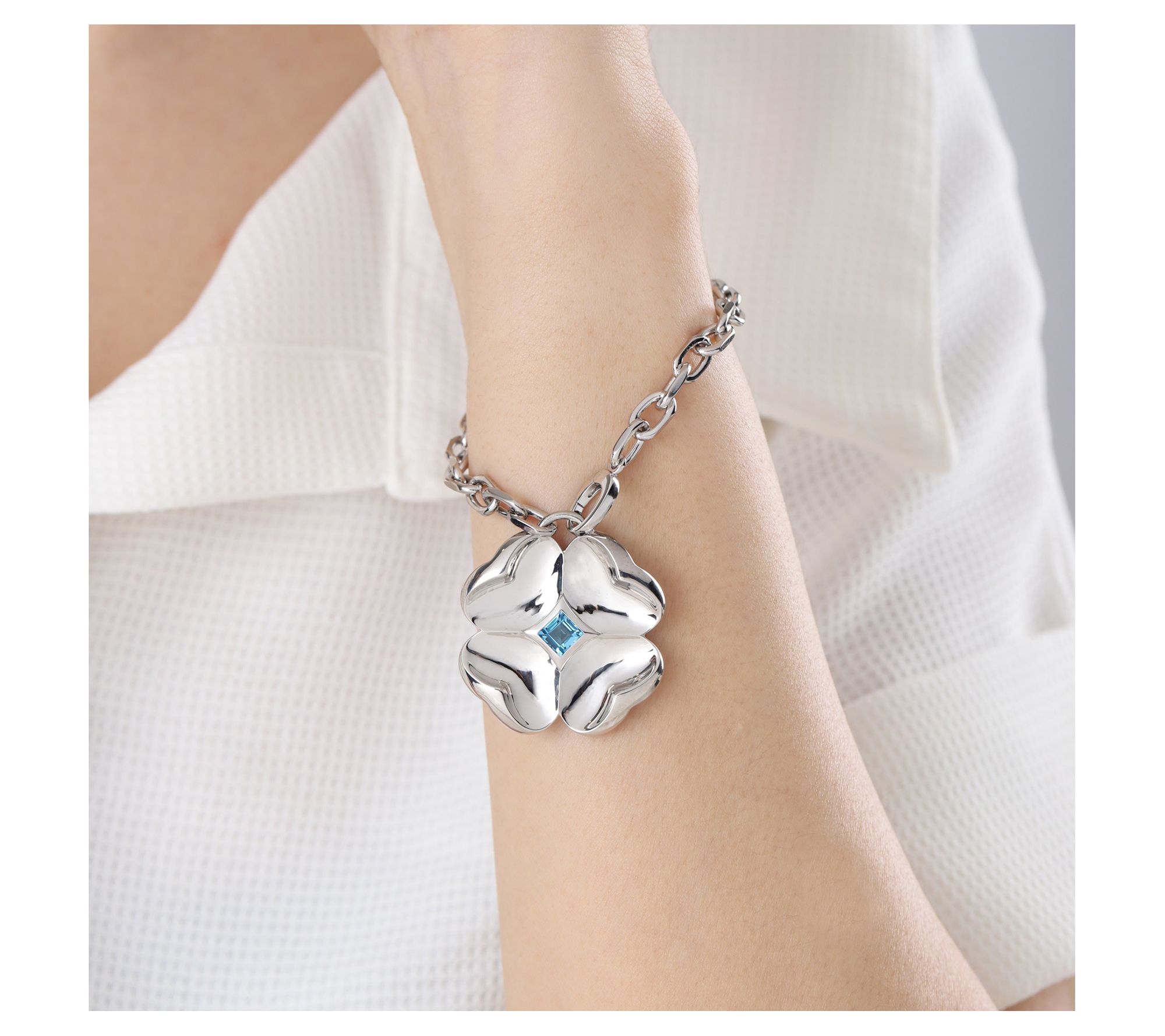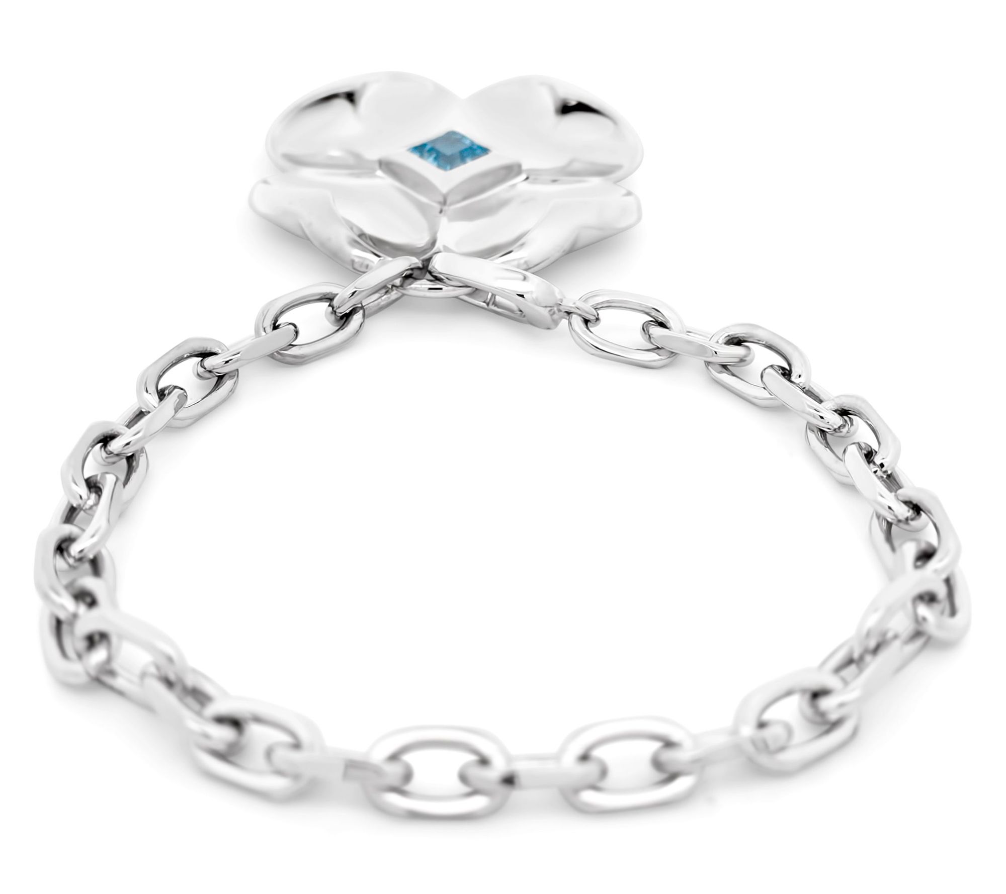 Let this sterling silver bracelet add a playful pop of color to any outfit, whether you're heading to brunch with friends or dressing up for a special night out. The sparkling Swiss blue topaz at the heart of the bold flower charm catches the light beautifully, making this piece a cheerful accessory you'll love to wear with jeans or a favorite dress. From Margo Manhattan.