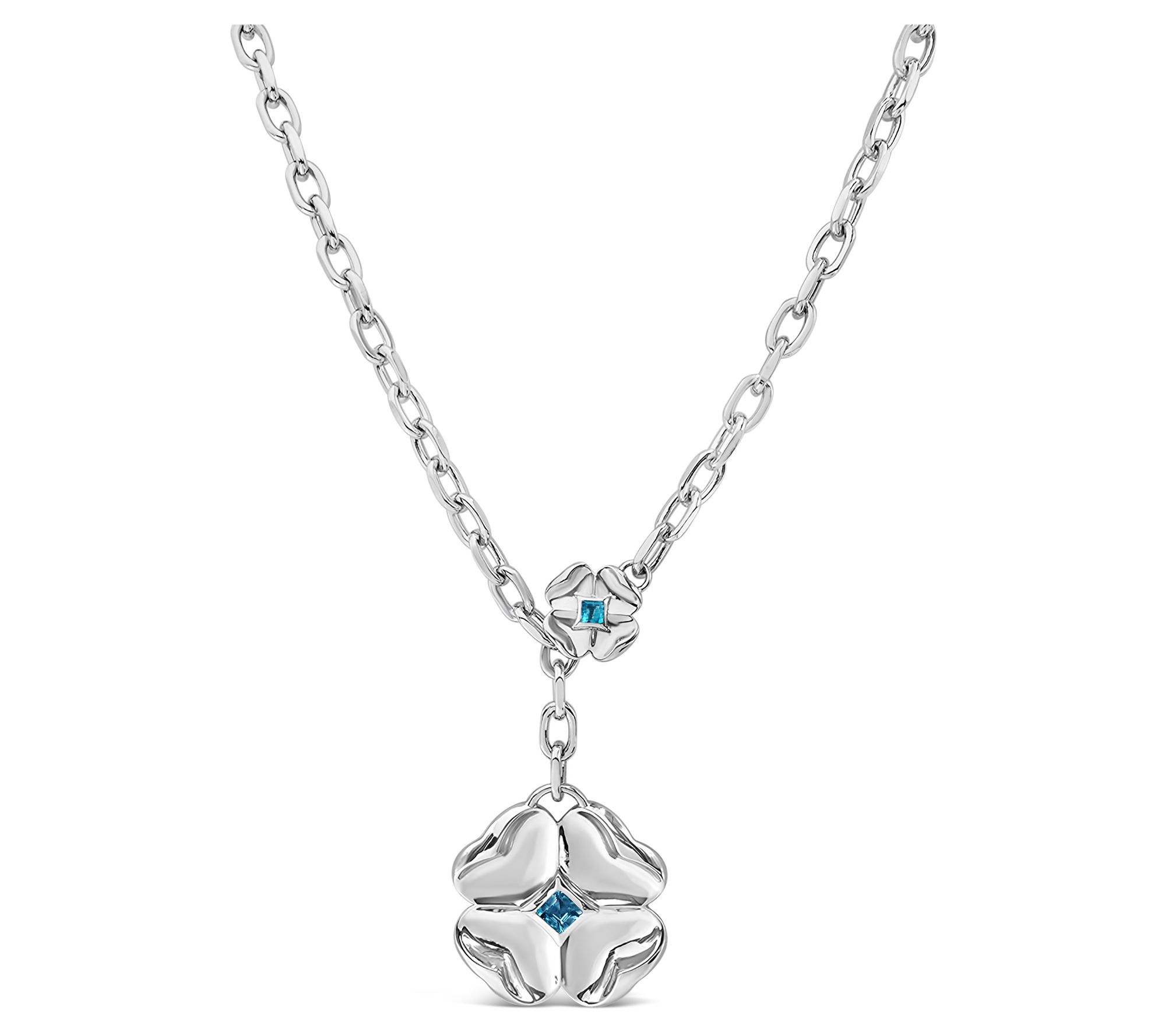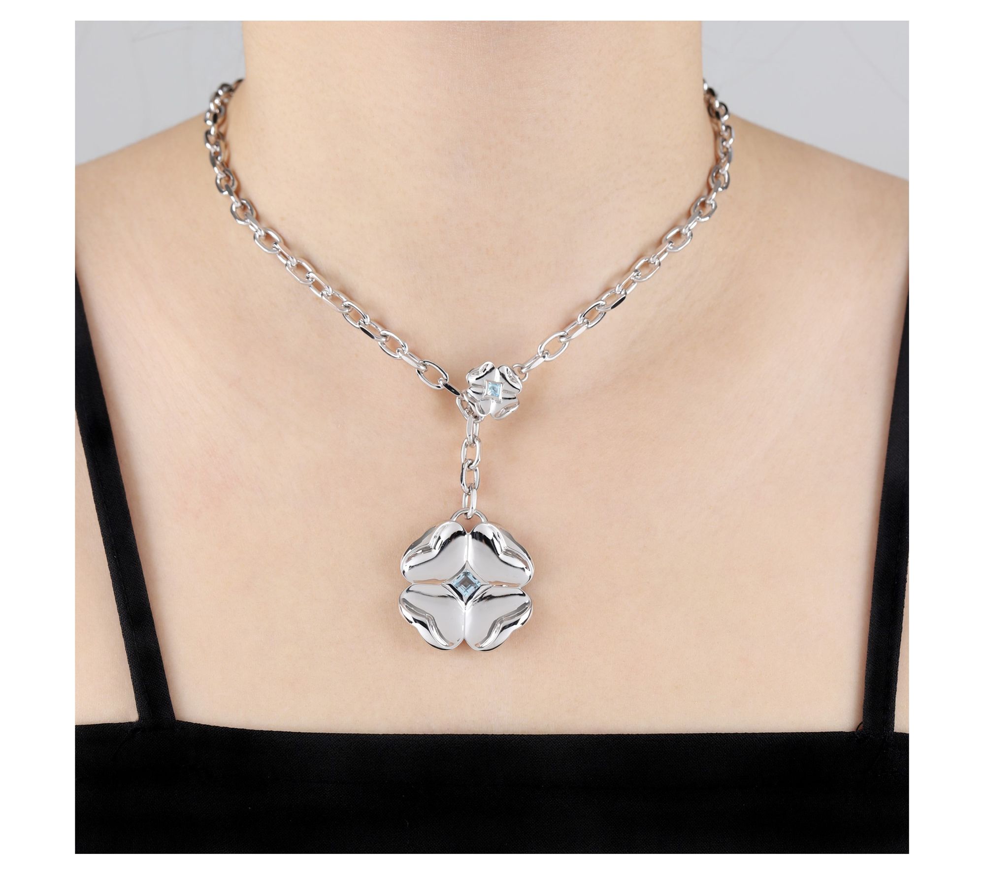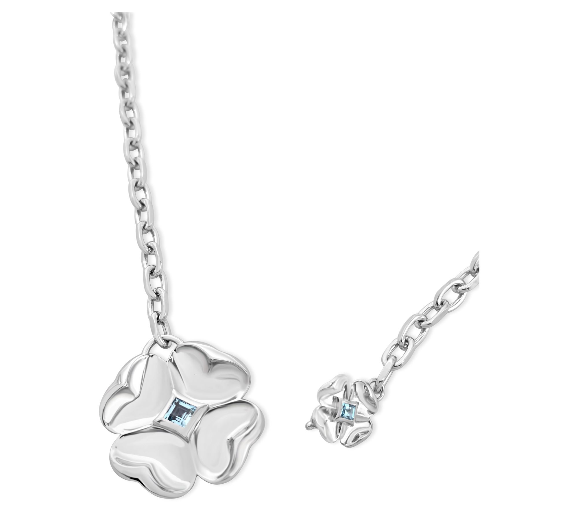 • Large clover charm with bezel-set, square Sky Blue topaz gemstone at center; polished finish