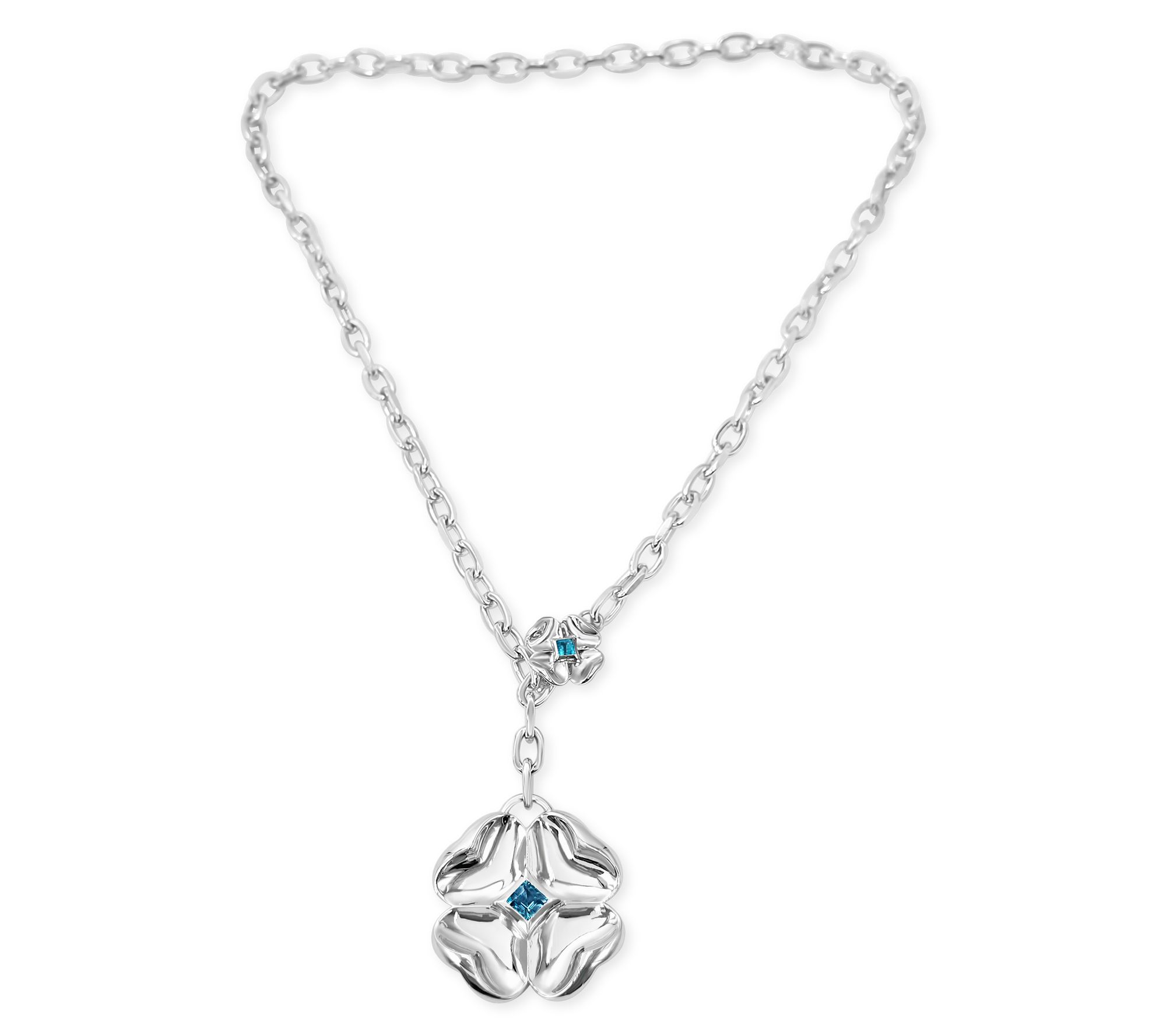 Let your playful side shine with this sterling silver lariat necklace by Margo Manhattan, featuring radiant clover charms accented by vibrant blue topaz stones. Whether you're headed to brunch or dressing up for an evening out, its adjustable chain and snap-close enhancer invite you to personalize your look. From Margo Manhattan.