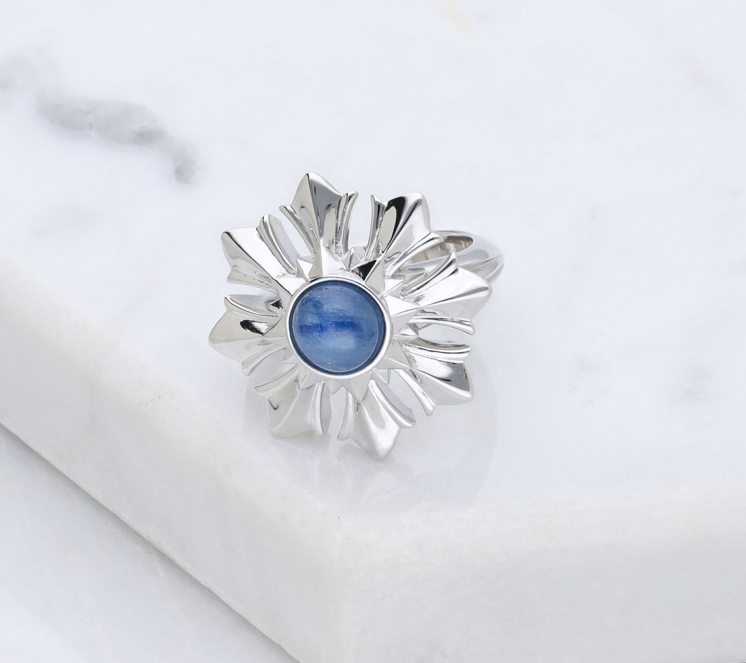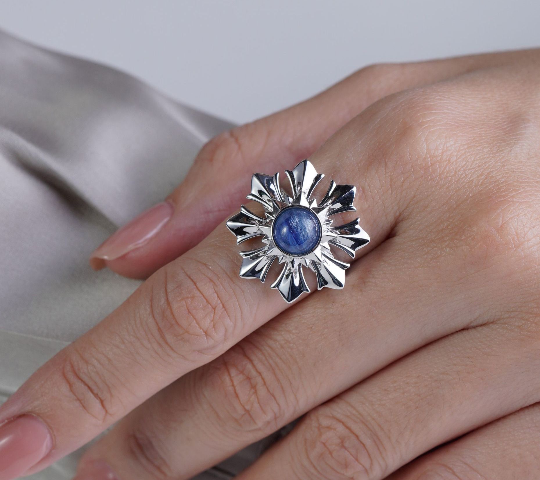 • High-polish starburst; kyanite cabochon center; high-polish shank