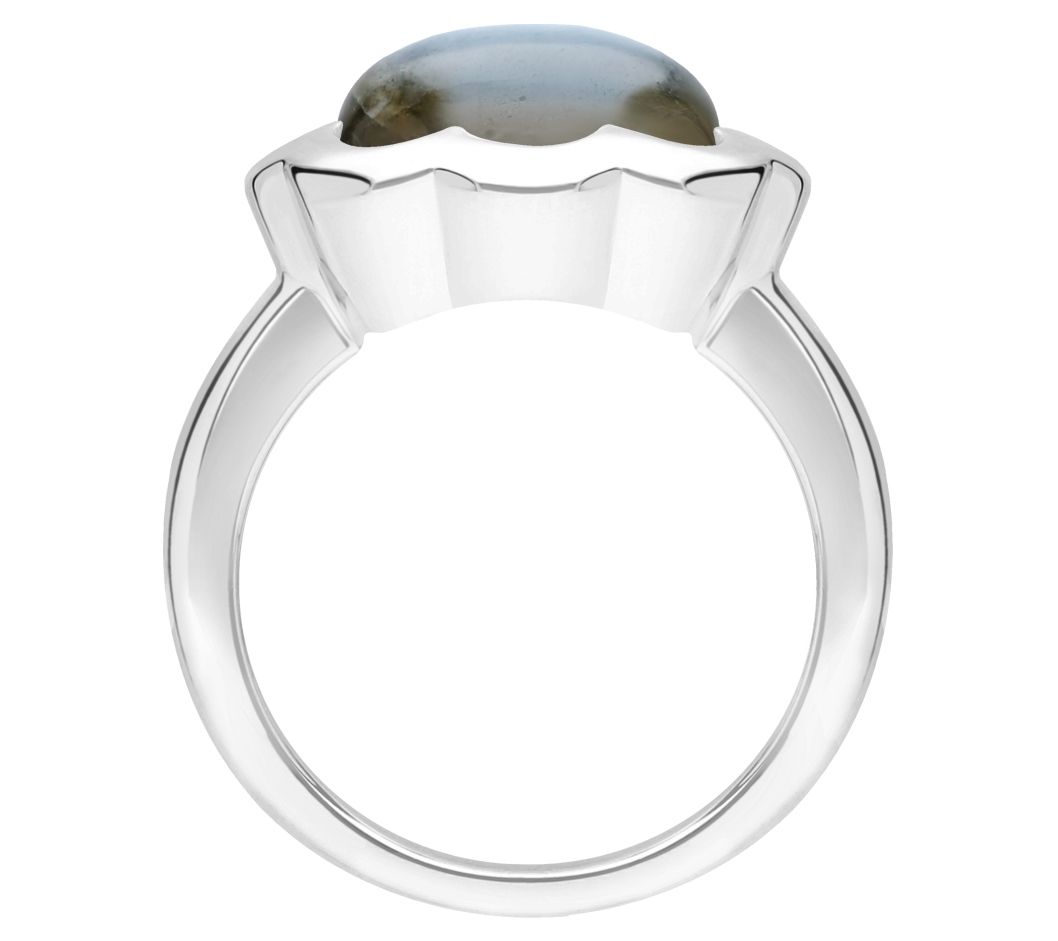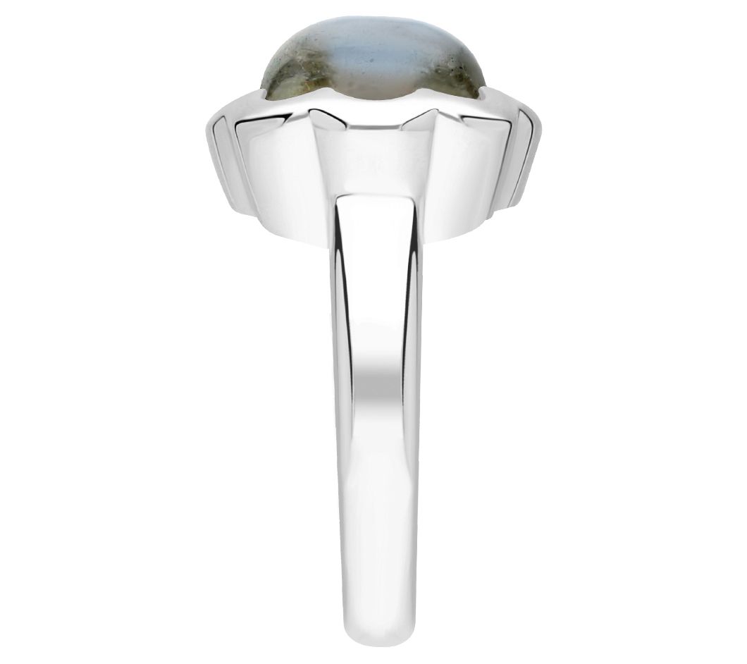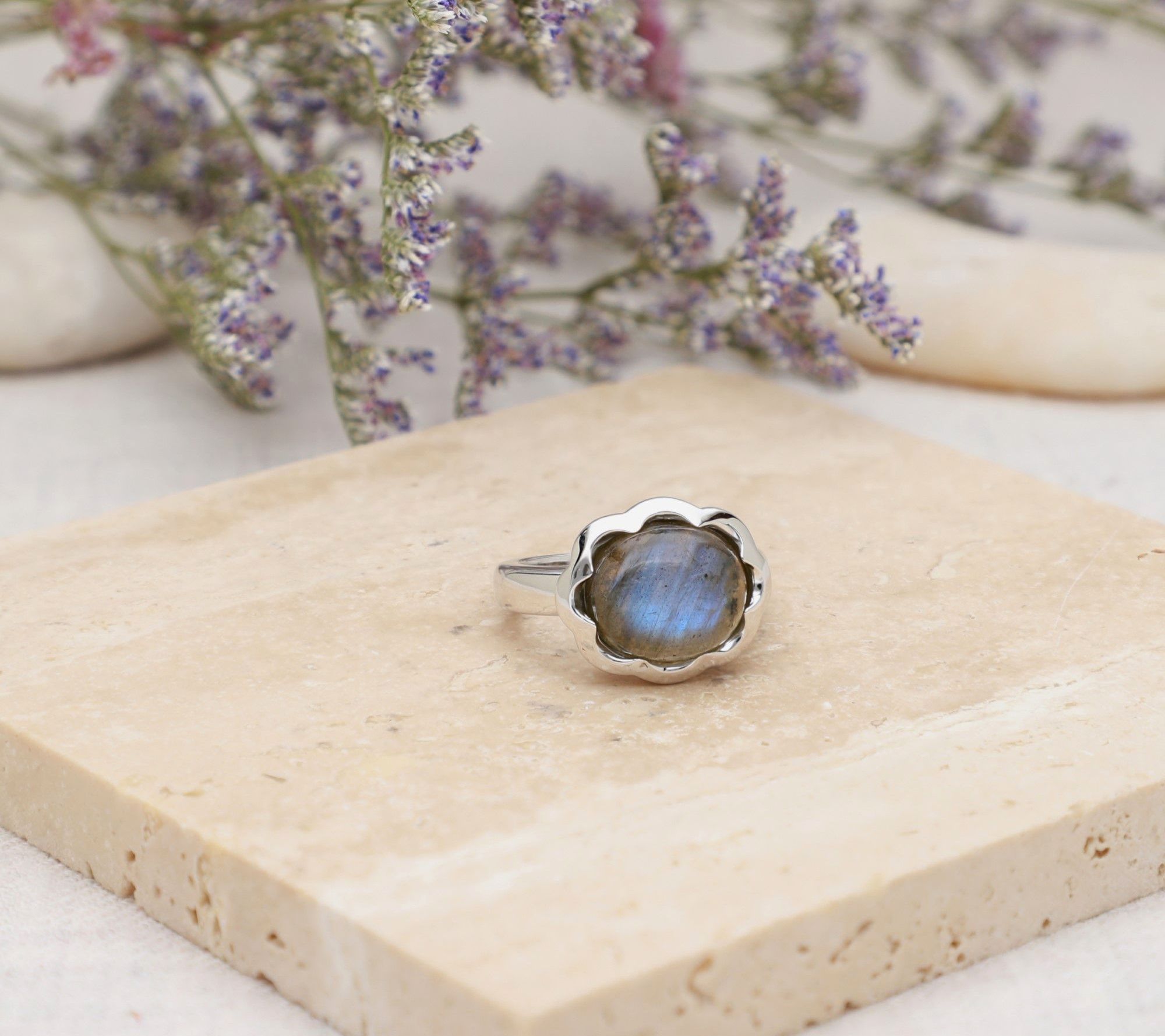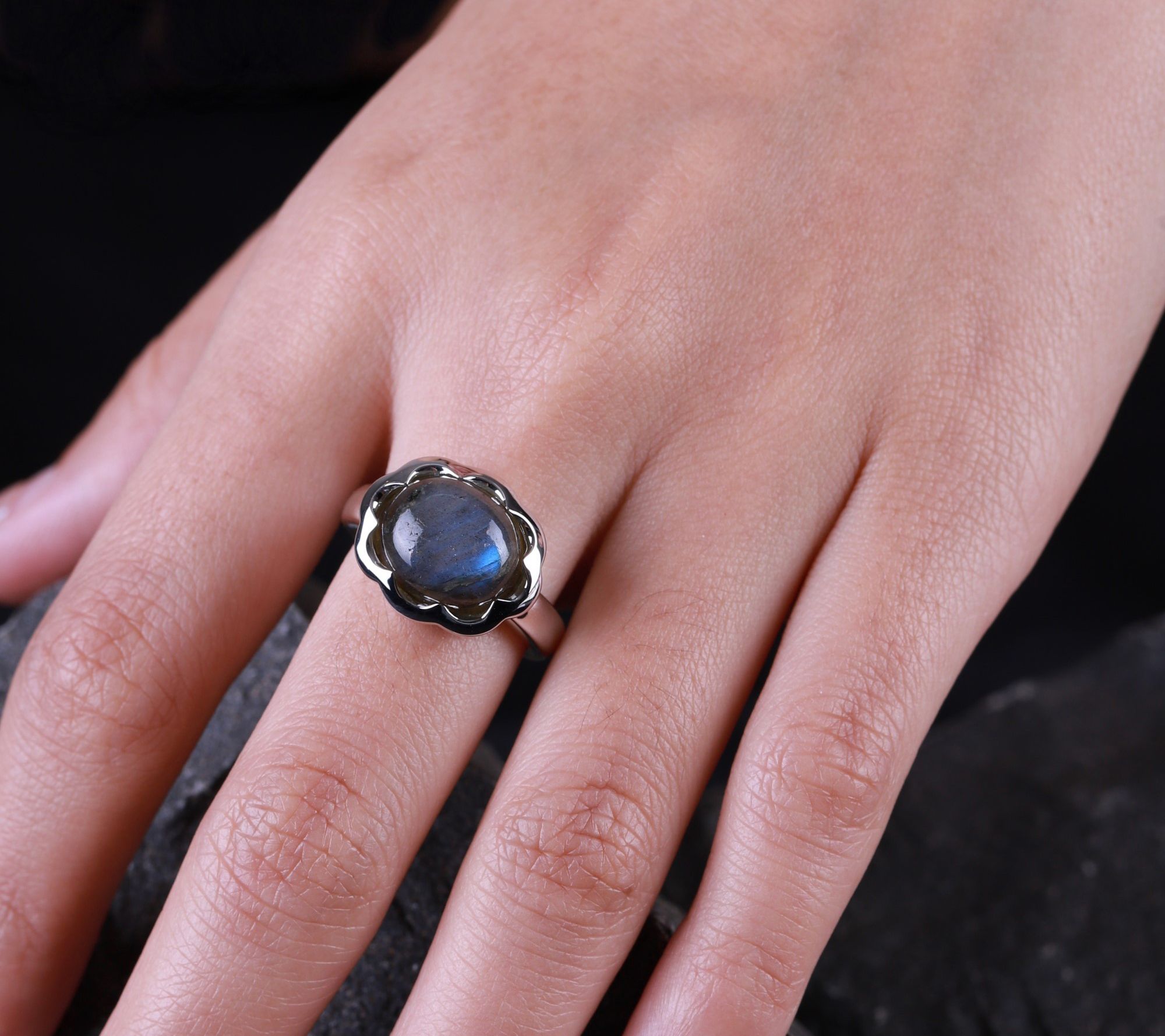 Cocktail ring with cabochon-cut labradorite in a scalloped prong setting; high-polished sides and shank
