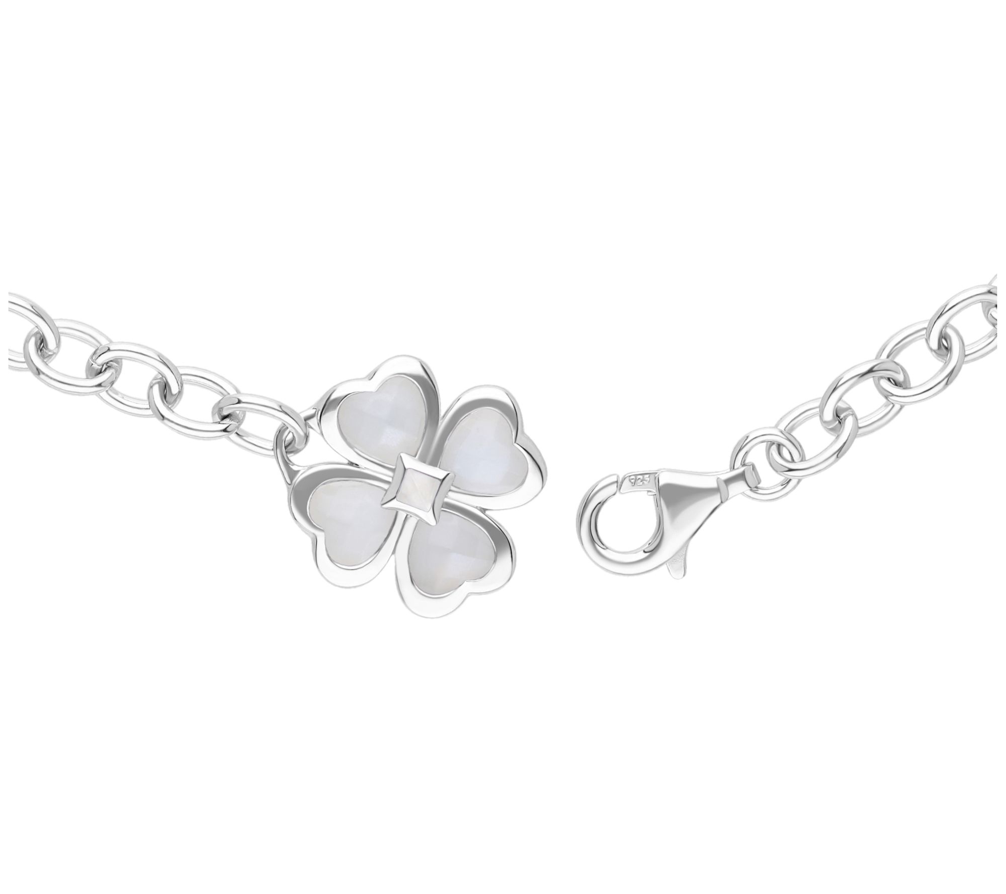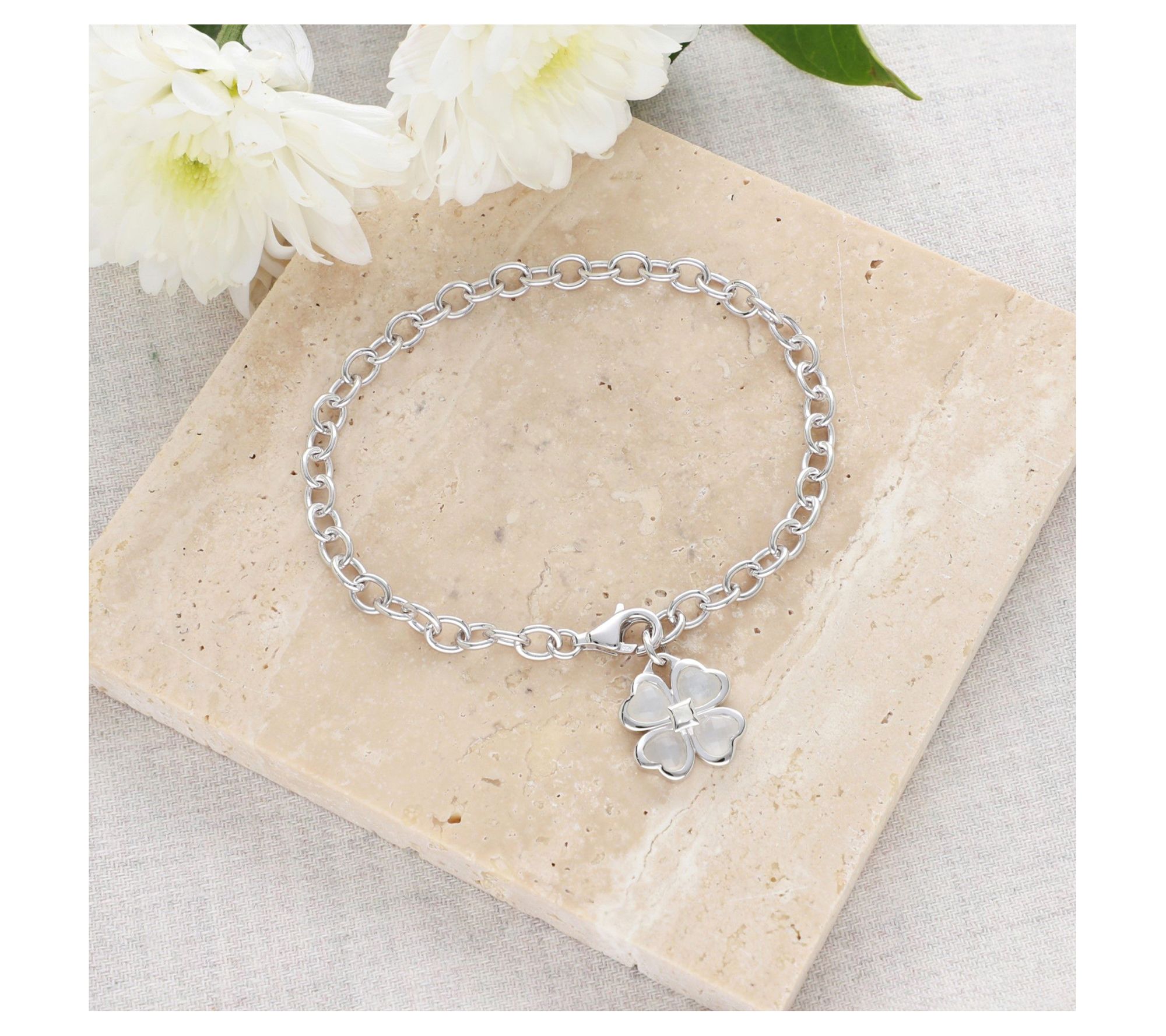 - Clover charm hangs from last link; four heart-shaped faceted moonstones form clover; square moonstone center; oval link chain