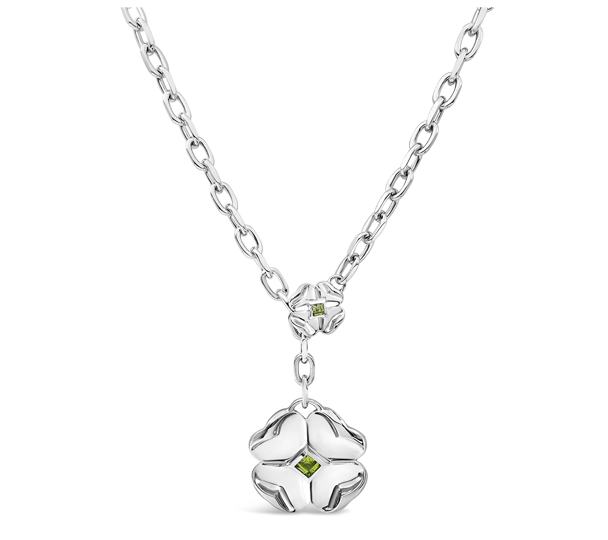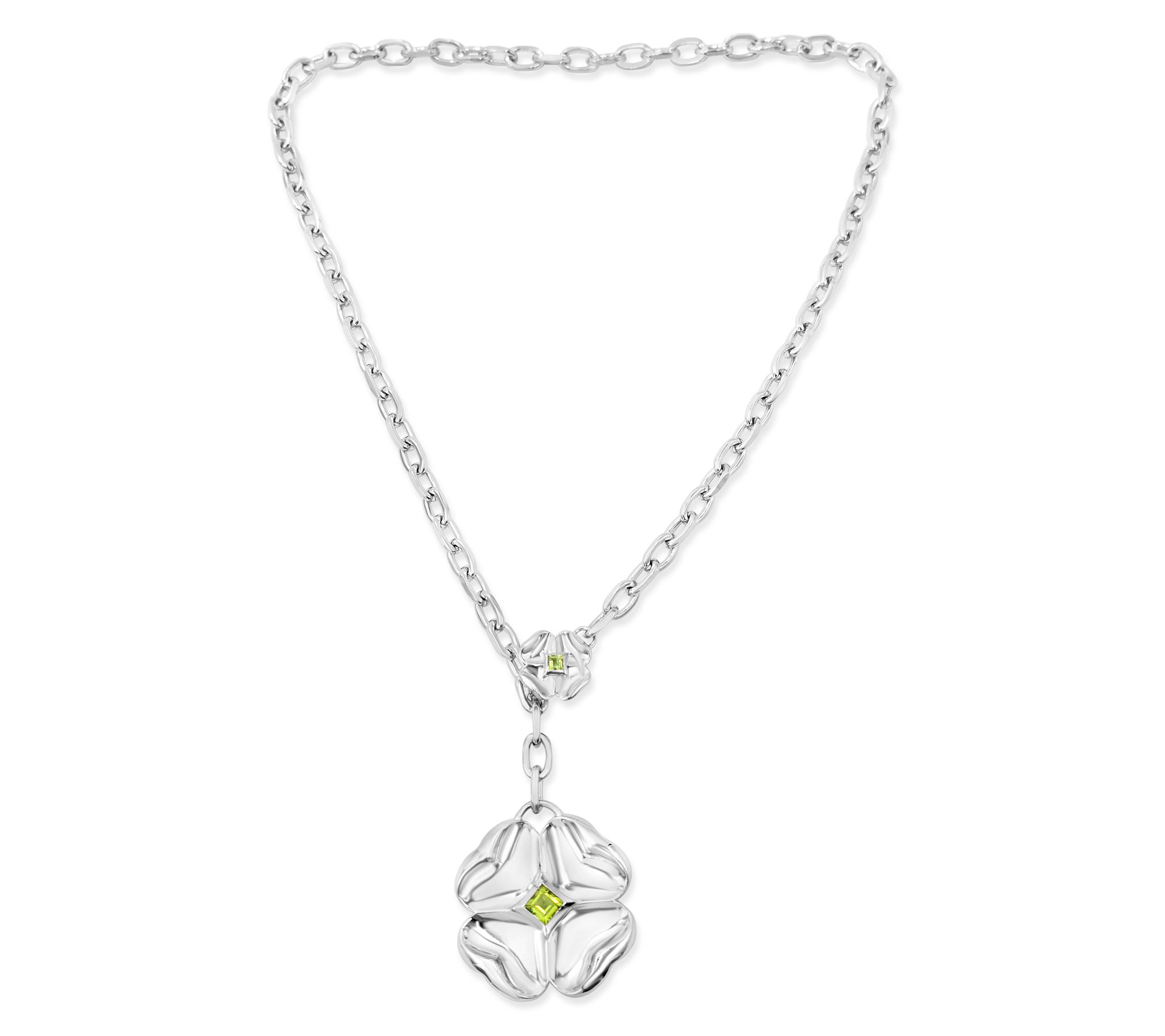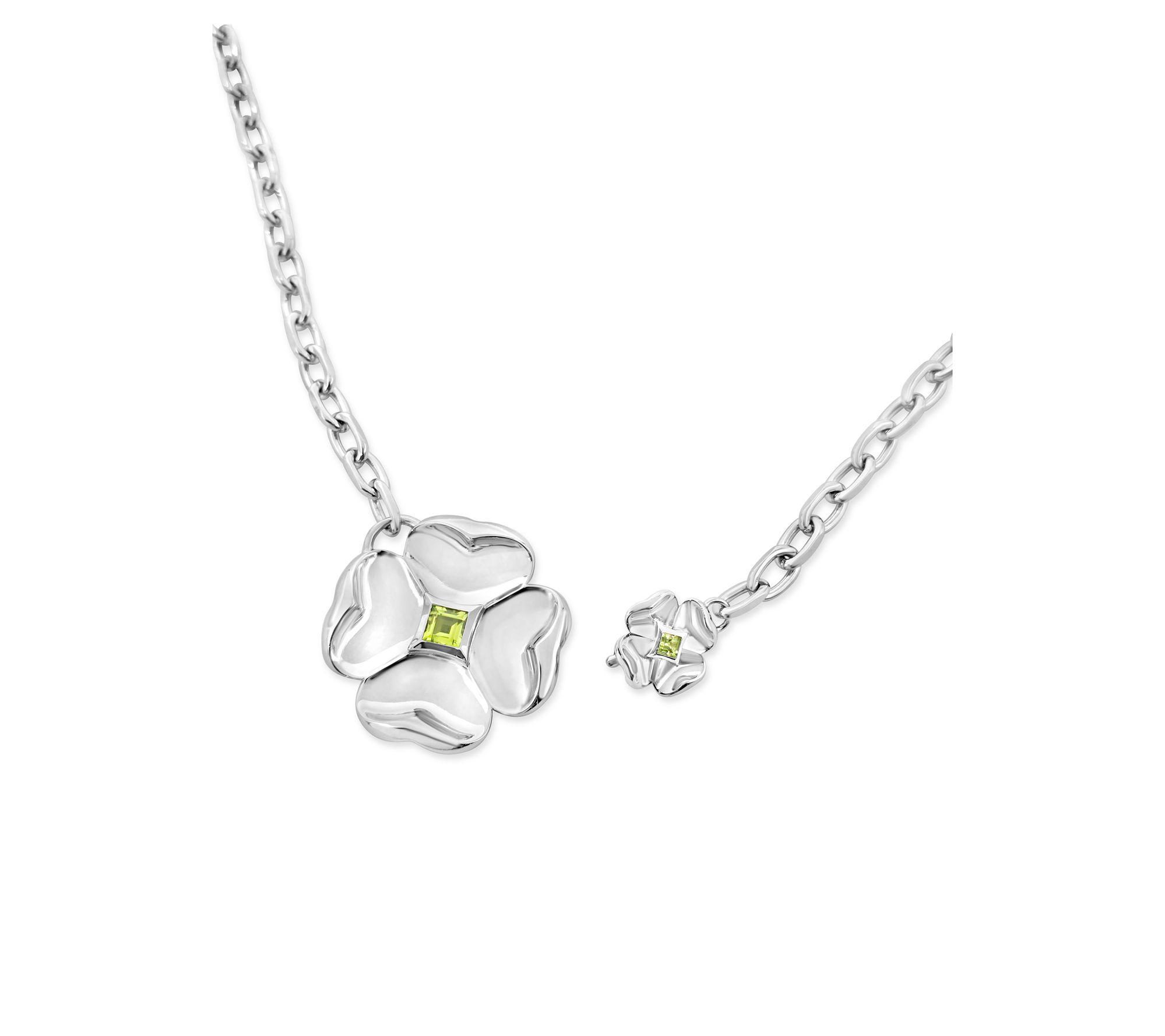 Large clover charm with bezel-set, square peridot gemstone at center; polished finish