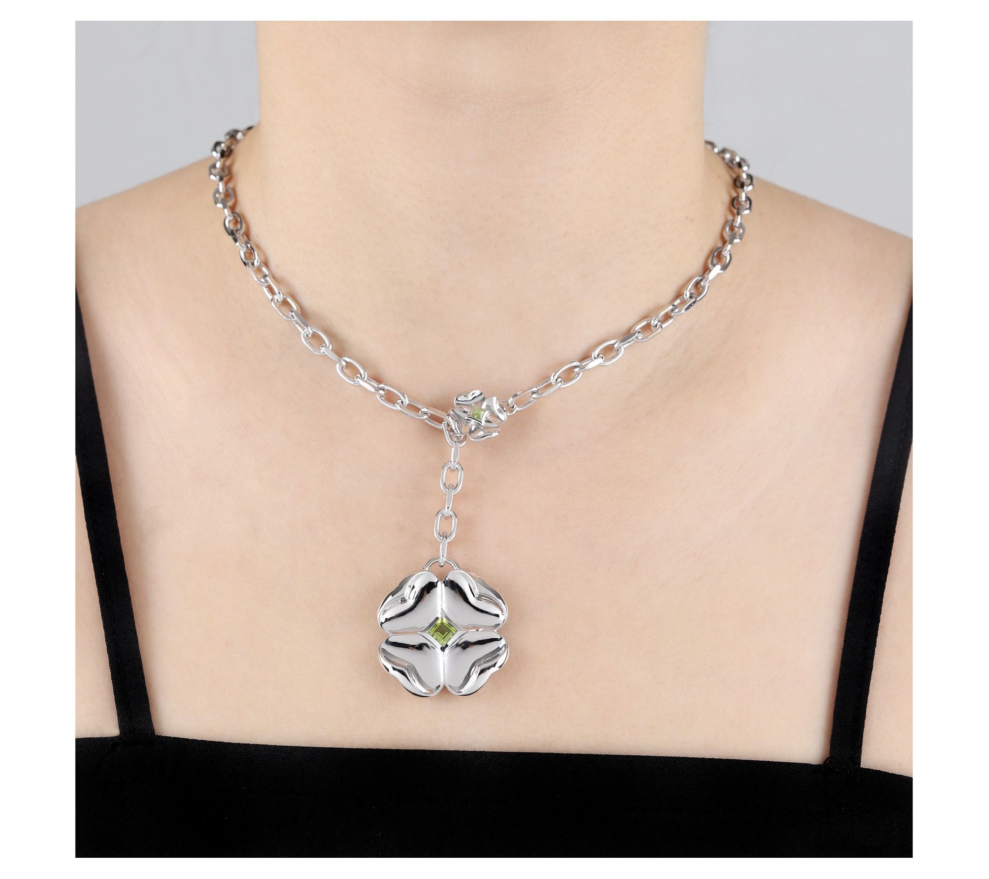 Snap closure with smaller clover charm and bezel-set peridot gemstone; adjusts length at any link